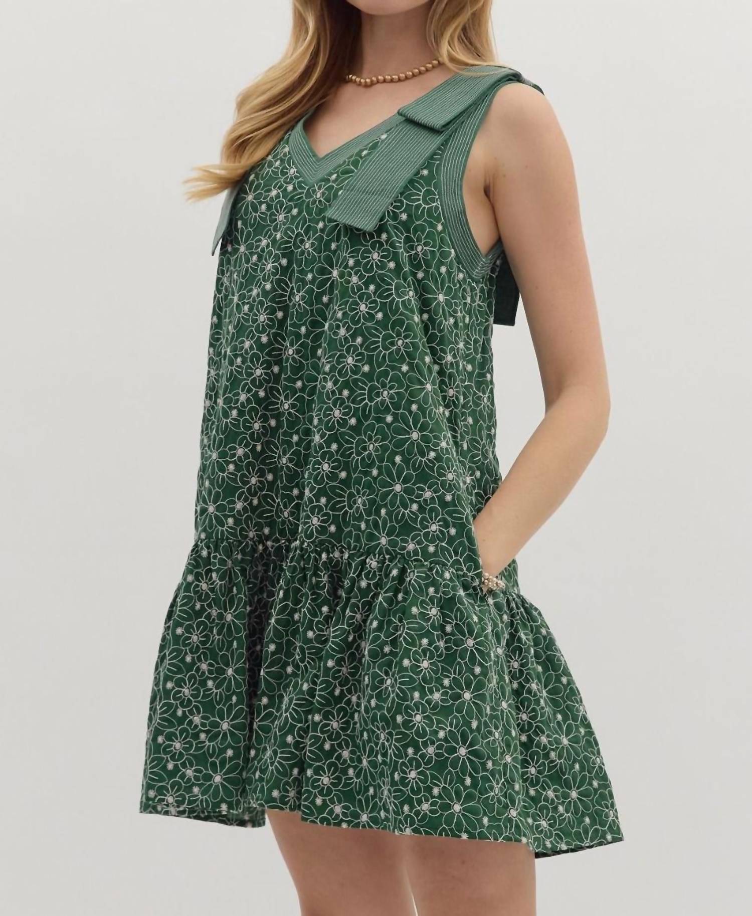 Comfortable and cute, this casual day dress has it all. Meet the Timeless and True Floral Dress by Entro, an enchanting sleeveless mini dress in hunter green perfect for summer birthdays. Crafted from 70% polyester and 30% cotton, it showcases beautiful floral embroidery and exposed stitch detailing, enhanced with charming shoulder bows. Its A-line silhouette features a ruffle hem and practical side pockets, while a pull-on closure ensures ease of wear. Care for this lined dress by machine washing for lasting appeal.
