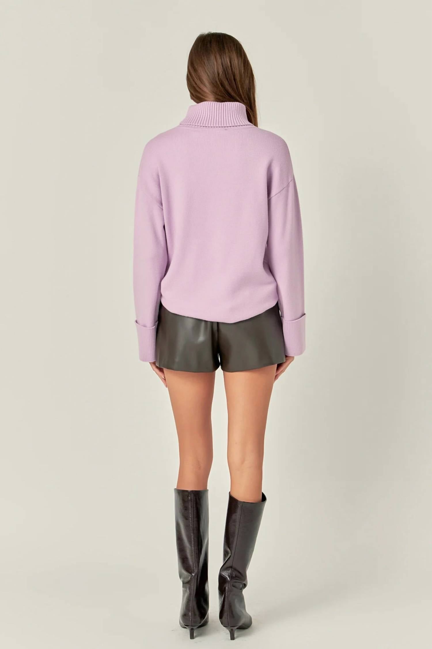 Fit to perfection and effortlessly chic. Embrace both style and comfort with the Clarissa Turtleneck Sweater by English Factory, presented in a charming lilac hue. This sweater showcases a folded high neck, long sleeves, and a dropped shoulder, enhancing its cozy and fashionable appeal. Material: Soft to the touch. Closure: Pull-on style. Ideal for fall occasions, particularly a classy dinner party.
