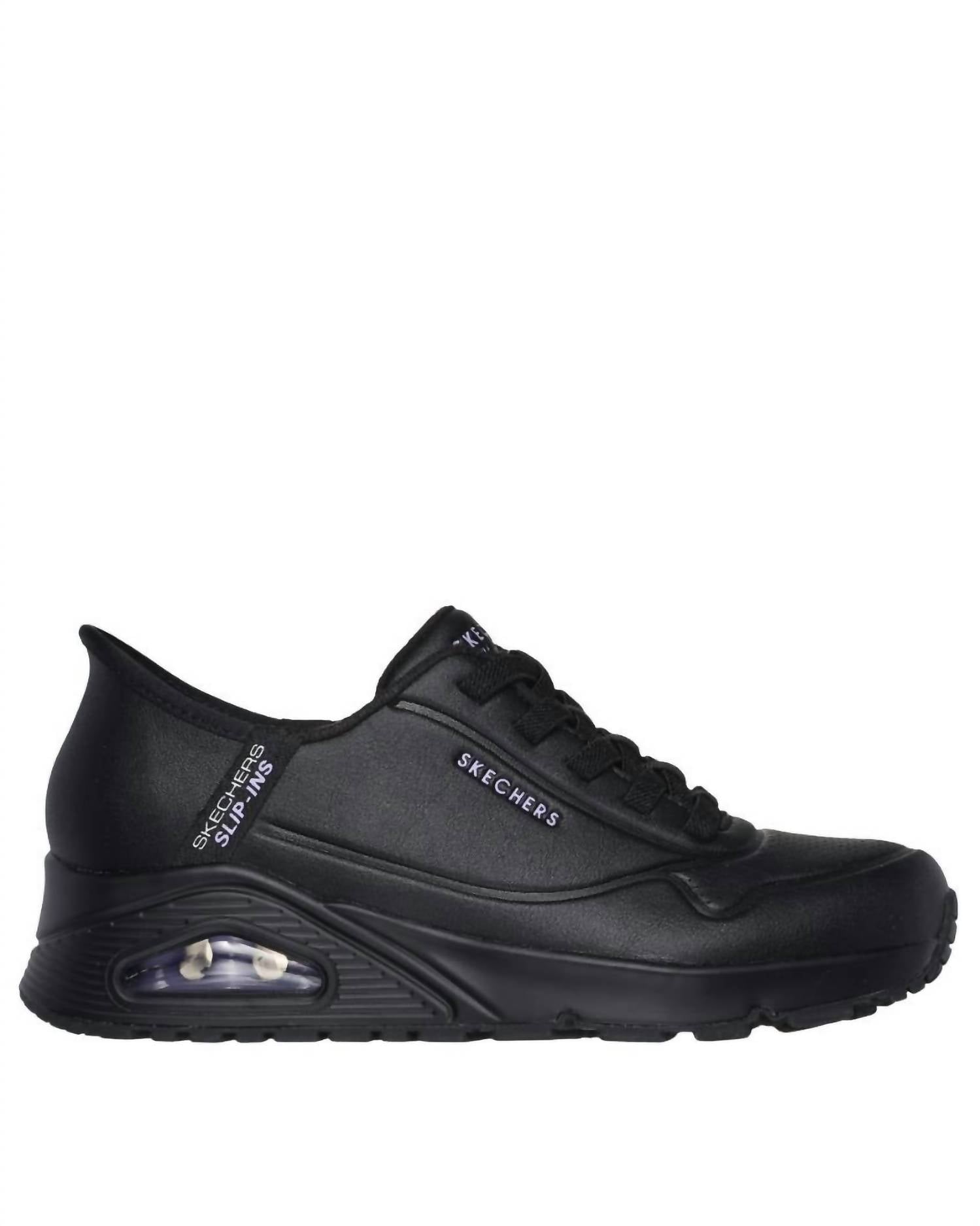 Get your daily steps in with these adorable sneakers. Discover the Unisex Slip-ins Uno Easy Air Sneakers by Skechers, expertly crafted for street-inspired style and comfort. These sneakers feature a smooth synthetic dura leather upper with stretch laces, offering a hassle-free fit thanks to the Hands Free Slip-ins® design and exclusive Heel Pillow™. The 1.5-inch platform heel height adds subtle elevation, while the Skechers Air-Cooled Memory Foam® insole and visible Skech-Air® airbag midsole work together for all-day support. Perfect for fitness and summertime activities, these sneakers keep you effortlessly on-trend in classic black.