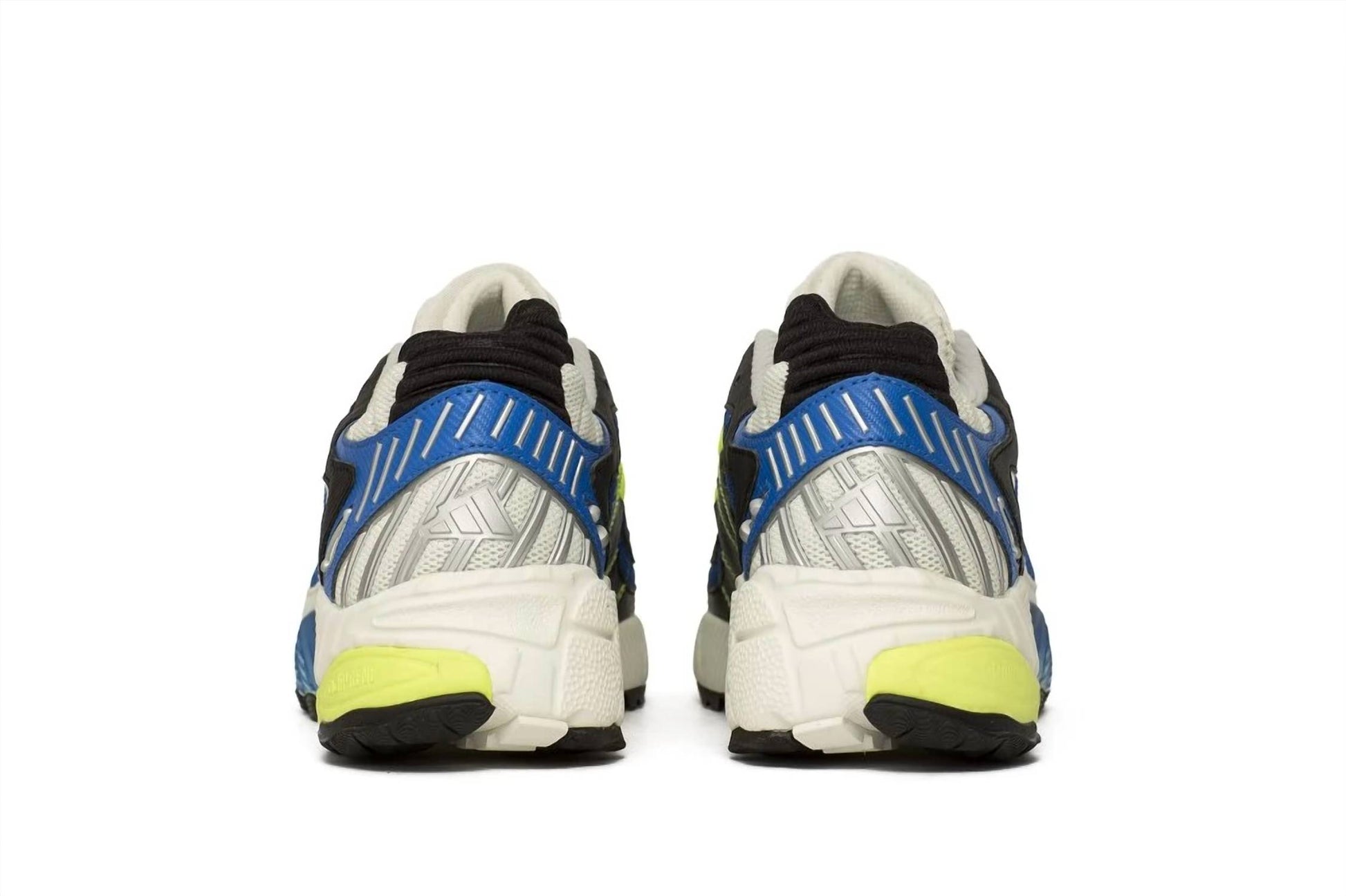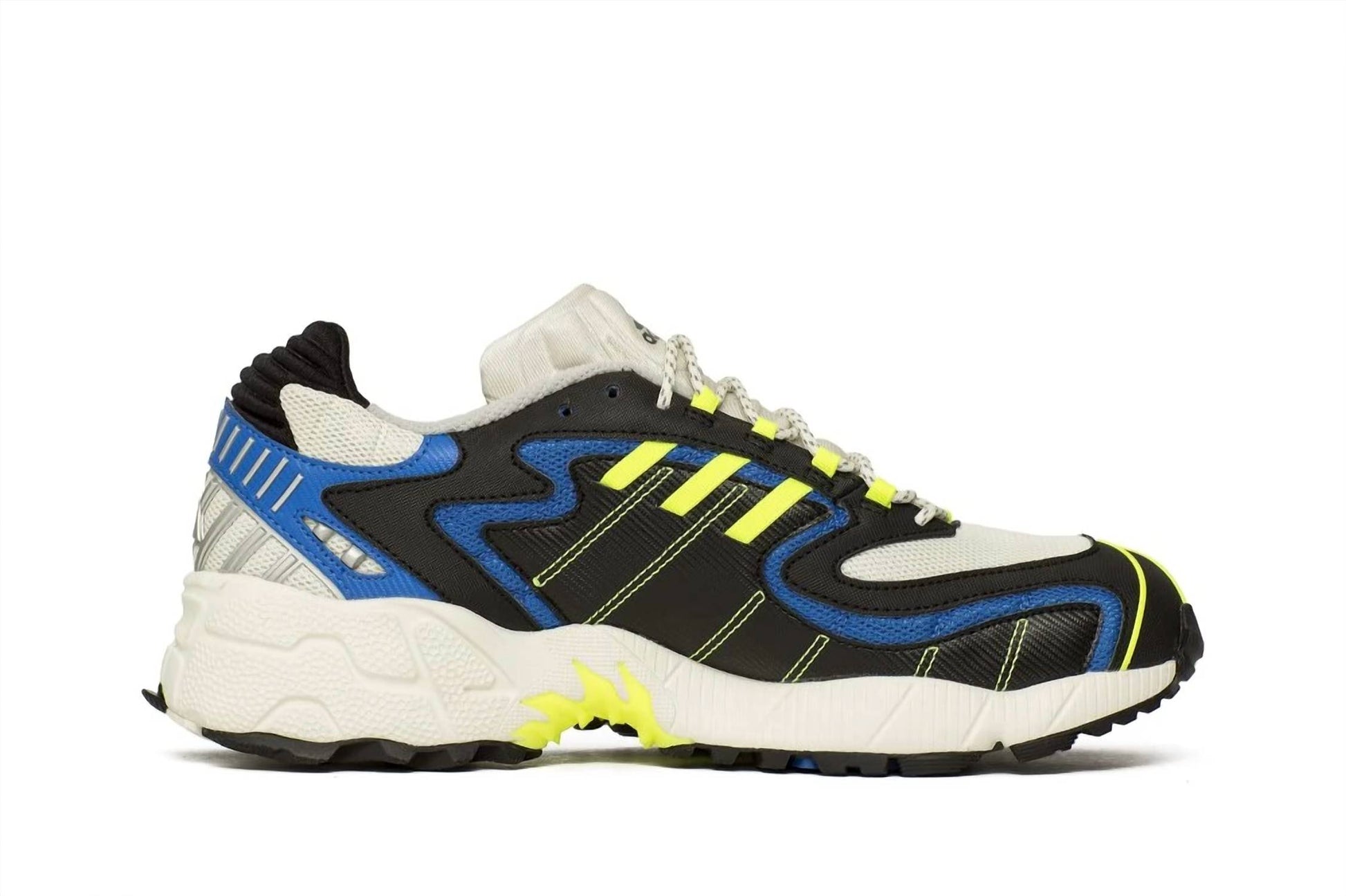 Introducing the Men's Torsion TRDC Sneaker by adidas, a trail-ready shoe designed for optimum performance and style. This sneaker features a textile and leather upper with a padded collar for enhanced comfort, all set atop a durable rubber outsole with an aggressive tread pattern. Highlighted in distinctive White, Black, Blue, and Neon Yellow, these sneakers combine functionality with bold aesthetics. Designed with a round toe shape, they are perfect for adventurous escapades or striking everyday wear.