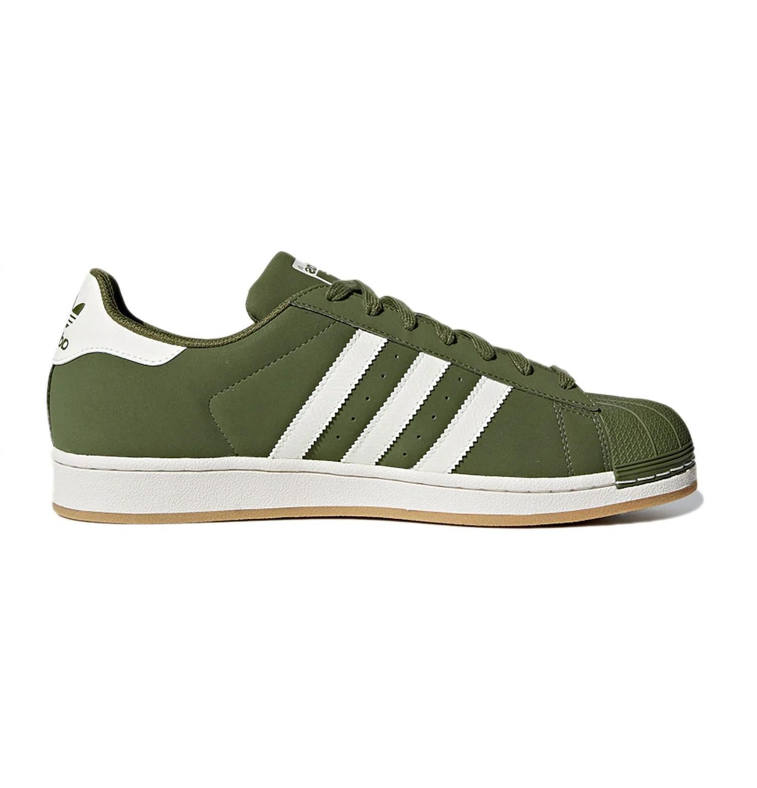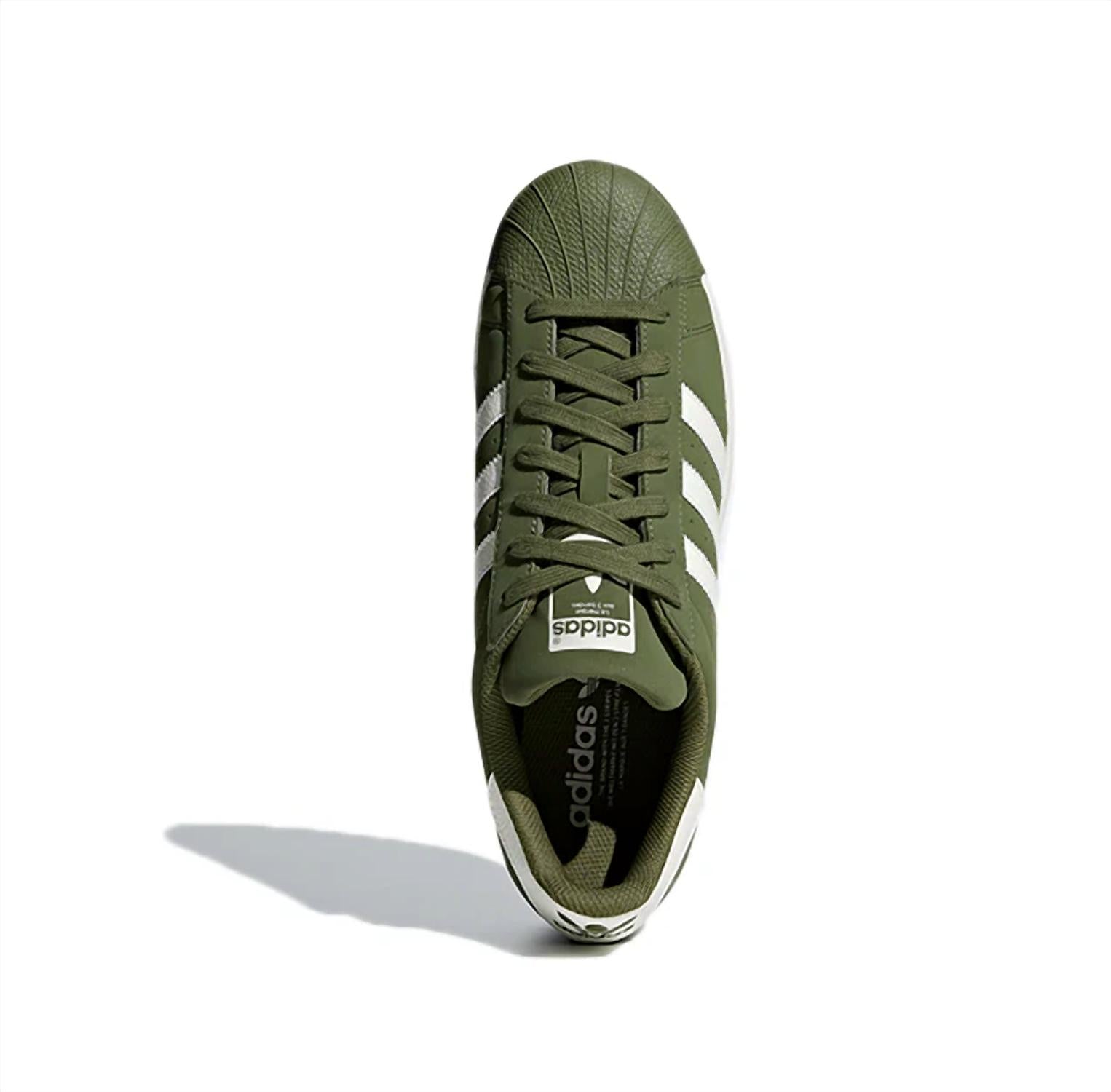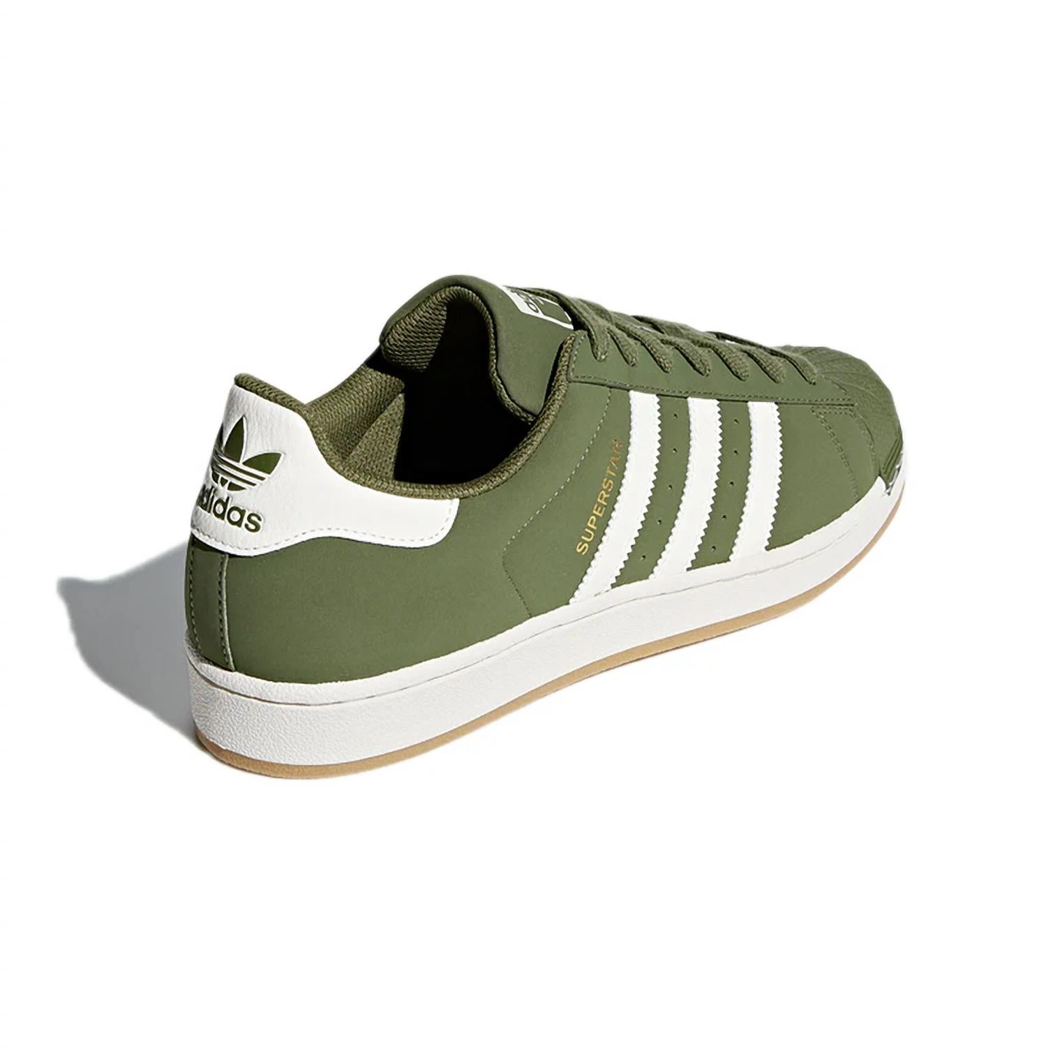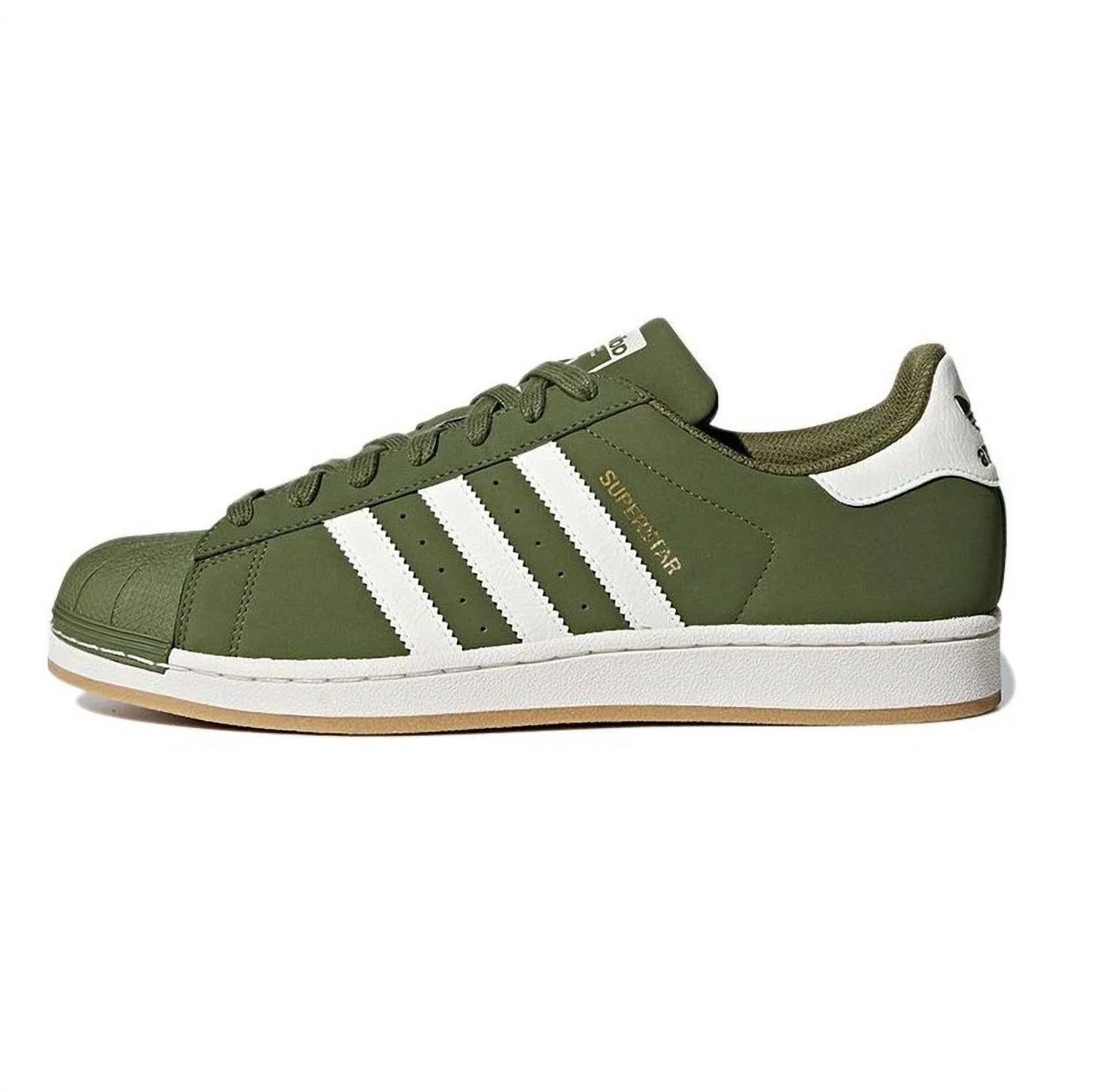 Step into style with the Men's Superstar Sneakers by adidas, crafted for comfort and cool. These iconic low-top sneakers feature a green leather construction, paired with a durable rubber sole and signature shell toe cap. Designed with a classic round toe and lacing closure, these sneakers are perfect for everyday wear. Enjoy effortless style while maintaining comfort with these must-have sneakers.