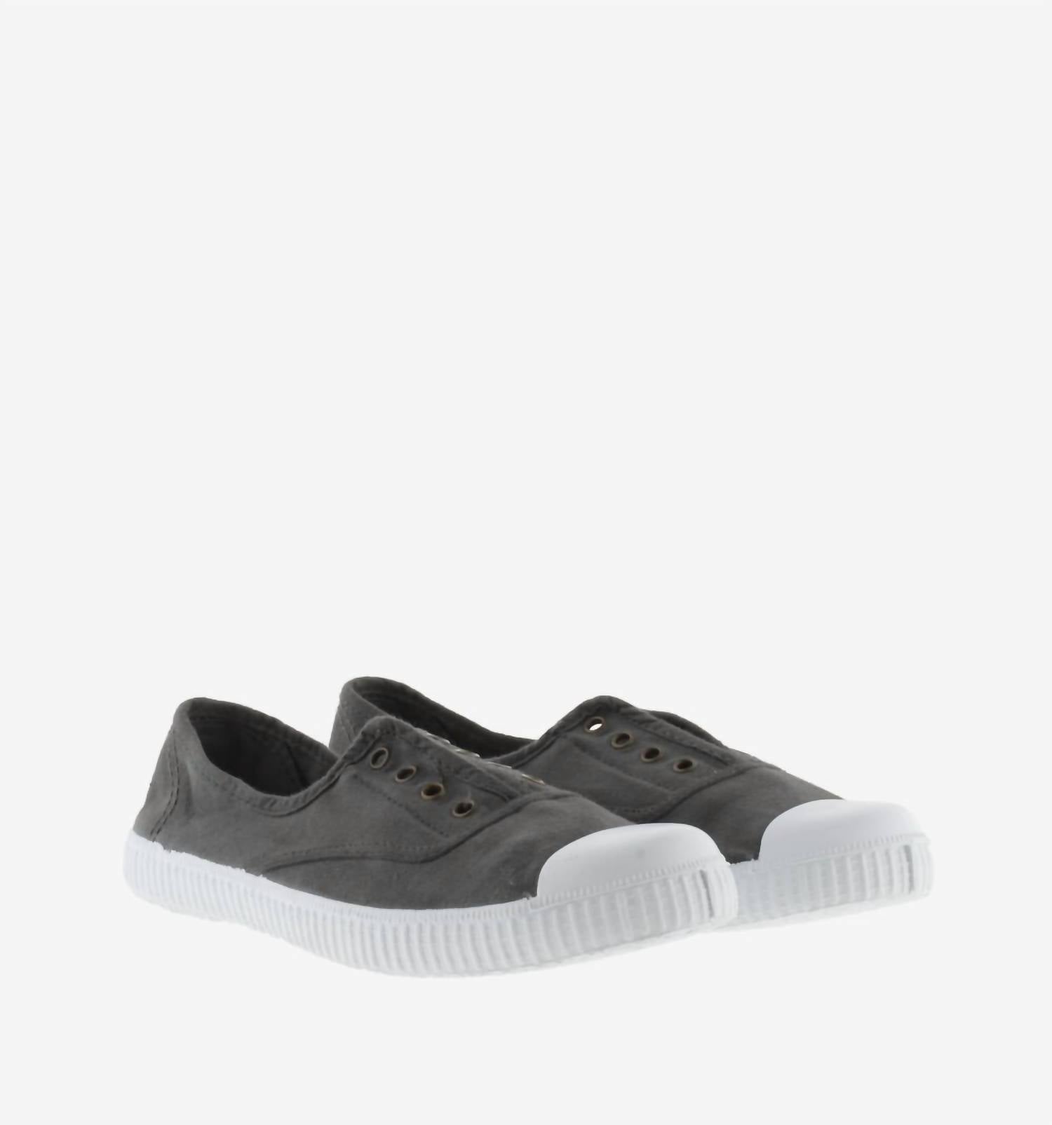 When fashion and function come together seamlessly. Step into timeless style with the Women's 1915 English Washed Canvas Toecap Shoe by Victoria Shoes. Designed for women, these slip-on shoes in Plomo color feature uppers and lining made of 100% washed organic cotton, ensuring comfort and sustainability. The natural rubber sole, sourced from the Hevea tree, provides durability and grip. Made in Spain and recommended to size up for the perfect fit, these sneakers seamlessly combine heritage craftsmanship with modern ease.