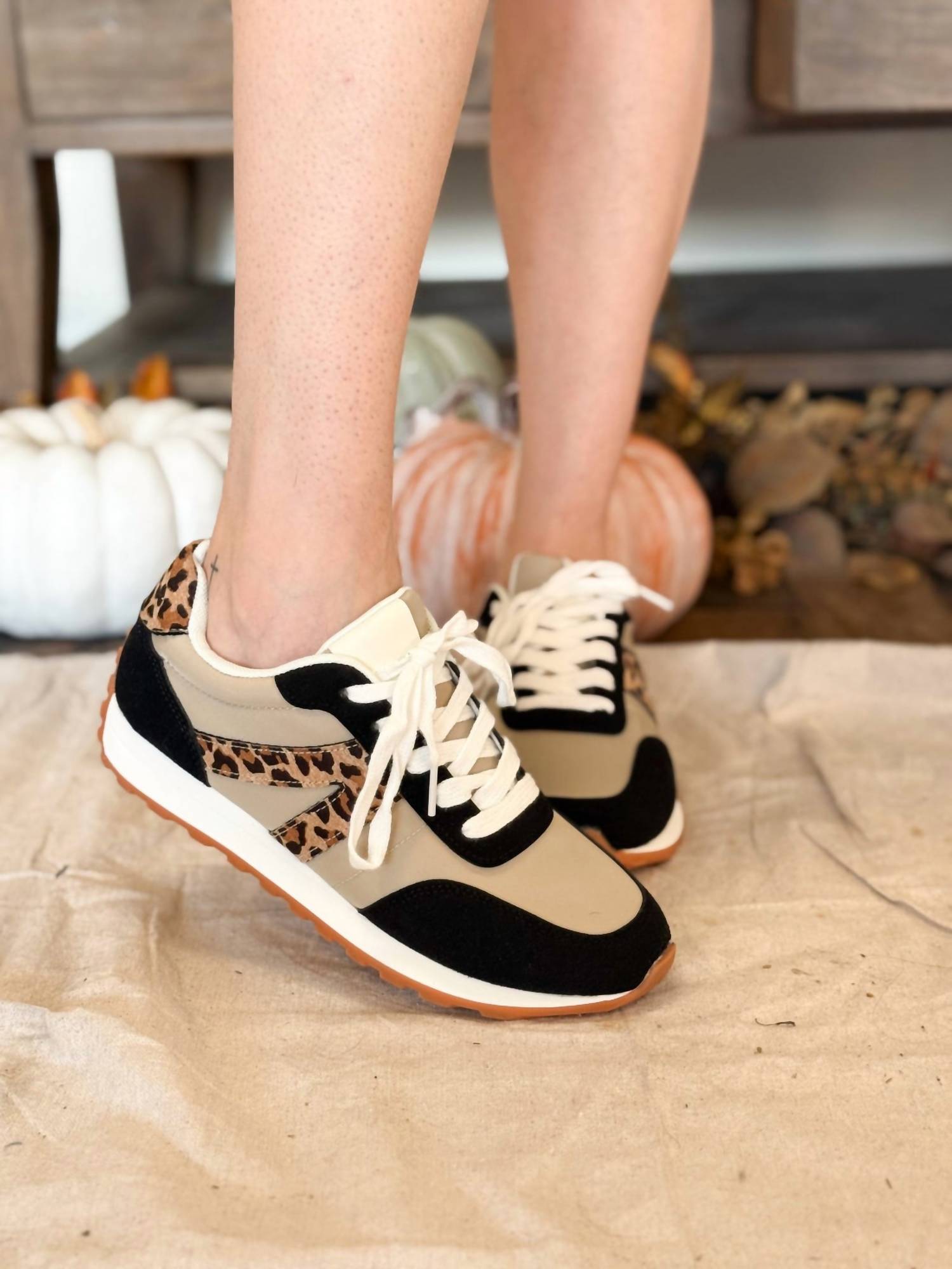 Cute, functional, and comfortable. These sneakers check all the boxes. Elevate your streetwear with the Women's Leopard Days Sneakers by Very G, featuring a vibrant mix of tan, black, white, and leopard print accents. These lace-up sneakers boast a cushioned footbed for all-day comfort and a durable gum outsole for reliable traction. Designed for effortless style, they perfectly complement jeans, joggers, or casual dresses, making them ideal for vacation wear or spring outings. Proudly embracing a flat heel and round toe silhouette, they are true to size and crafted with a flair for chic versatility.