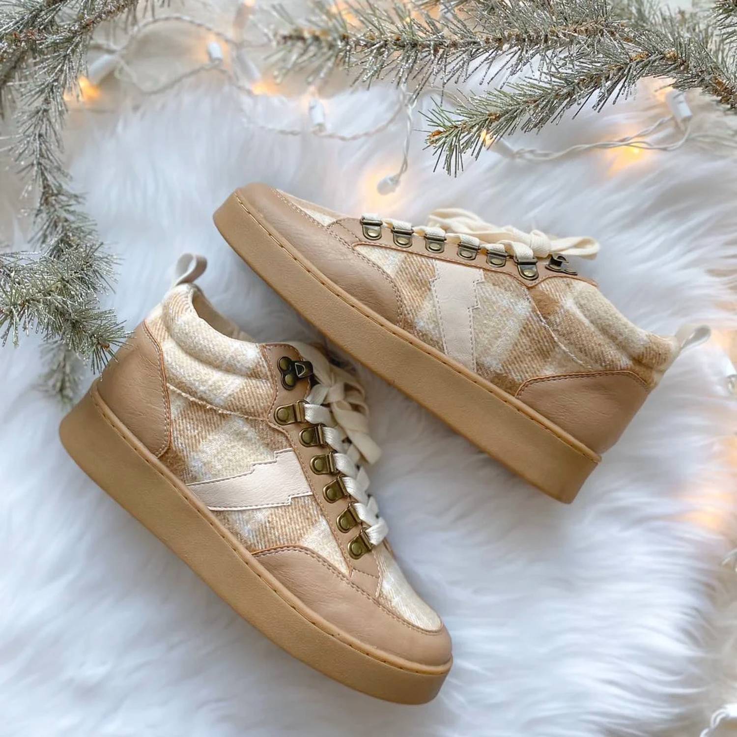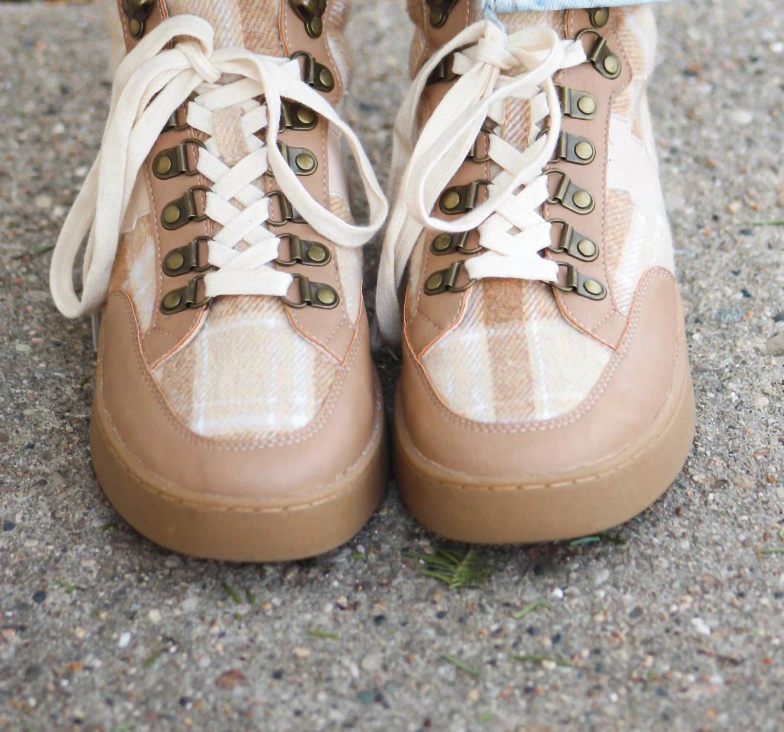 When fashion and function come together seamlessly. Step up your style game with the Women's Kaia Plaid Sneaker by OASIS SOCIETY, crafted for fashion-forward comfort. These high-top sneakers feature a trendy plaid flannel design in a chic beige hue. Made for adult women, the sneakers boast a flat heel height perfect for all-day wear, paired with a comfortable round toe shape. Enjoy the blend of cute, comfort, and style with these contemporary sneakers.
