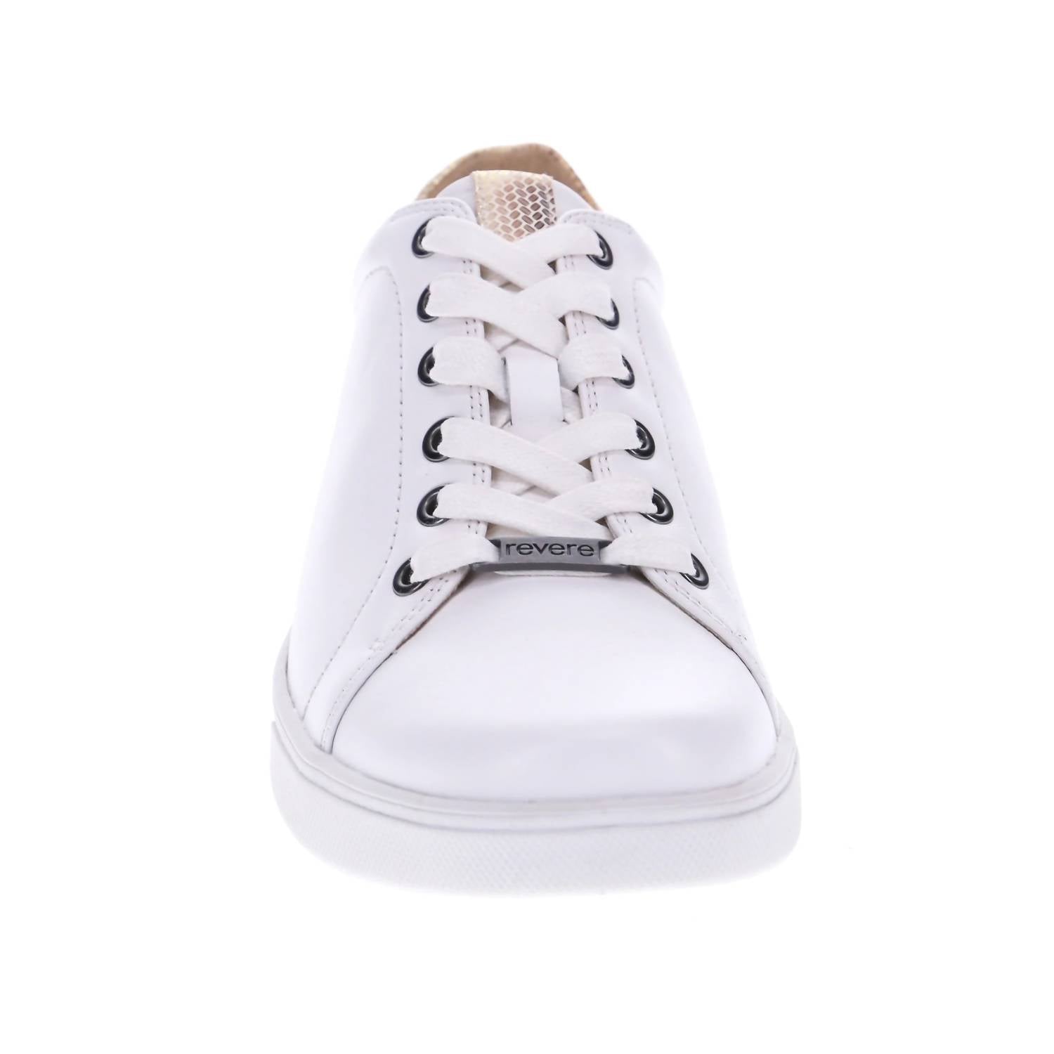 Get your daily steps in with these adorable sneakers. The Women's Limoges Lace Up Sneaker by Revere is your go-to footwear for both style and comfort. Featuring medium width and a round toe, it offers optimal cushioning and arch support for all-day wear. The metallic coconut color with metal hardware adds a chic touch, making it perfect for a minimalist spring dinner party ensemble. Enjoy the comfort of a flat heel as you step confidently into your next occasion.