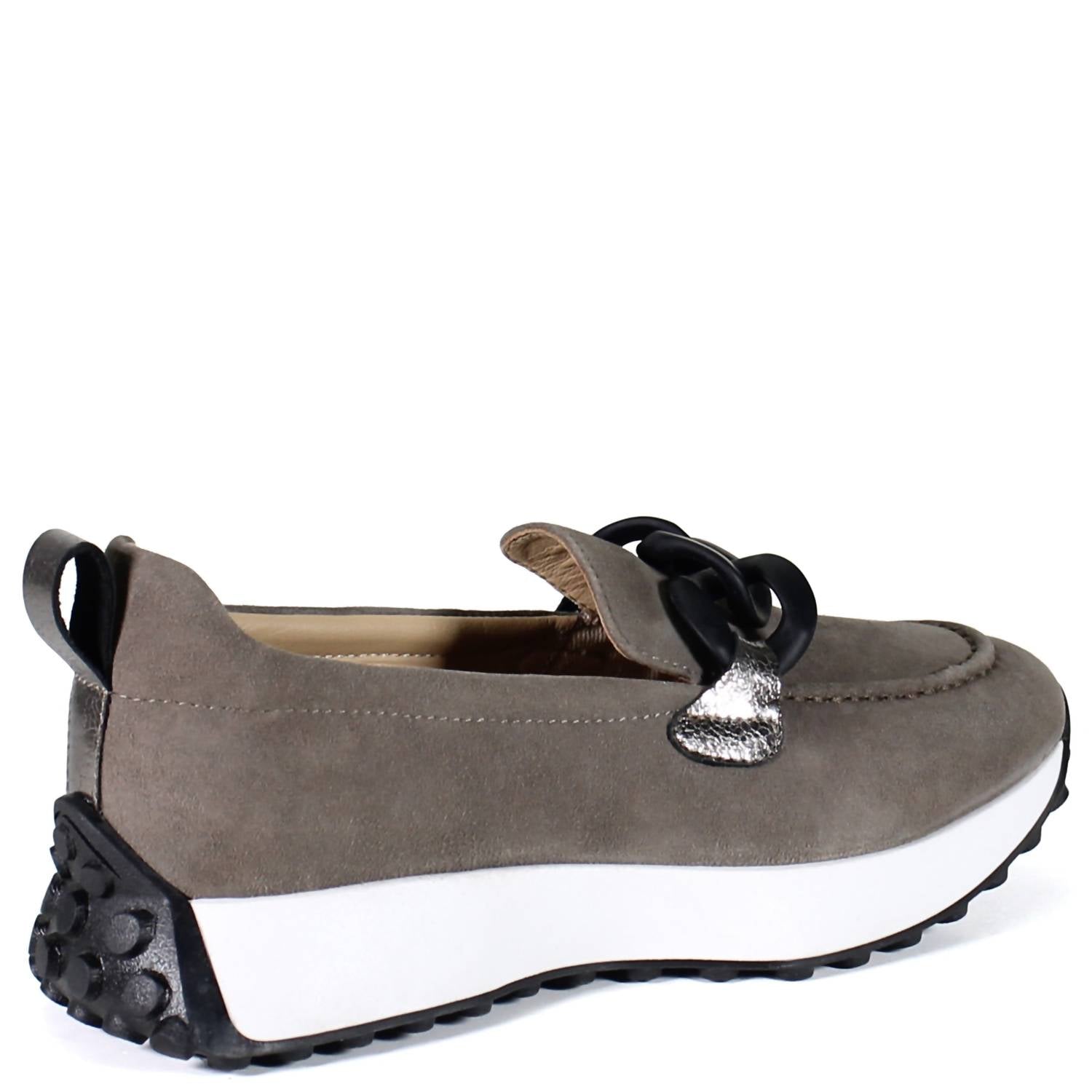 When fashion and function come together seamlessly. Upgrade your shoe collection with the Women's Kind Words Sneaker by DIBA True, featuring a stylish suede upper in anthracite/pewter. This slip-on sneaker combines classic loafer aesthetics with modern streetwear trends, complete with a bold chain detail. Its round toe and a 1-inch chunky rubber sole ensure comfort and lightweight support, making it perfect whether you're on vacation or running errands. Embrace the effortless charm and comfort this spring with these sneakers designed in a true streetwear fashion.