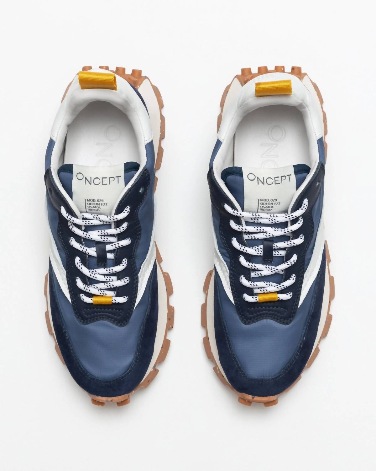 Cute, functional, and comfortable. These sneakers check all the boxes. Introducing the Women's Osaka Elite Sneaker by Oncept, a perfect choice for those seeking style and comfort. These indigo sneakers feature a flat heel with a height under one inch and a trendy oversized lug bottom paired with an EVA platform midsole, making them ideal for streetwear enthusiasts. Designed with a round toe shape, they seamlessly blend flexibility with comfort, perfect for travel occasions. Elevate your summer style this Thanksgiving with this elite trainer.