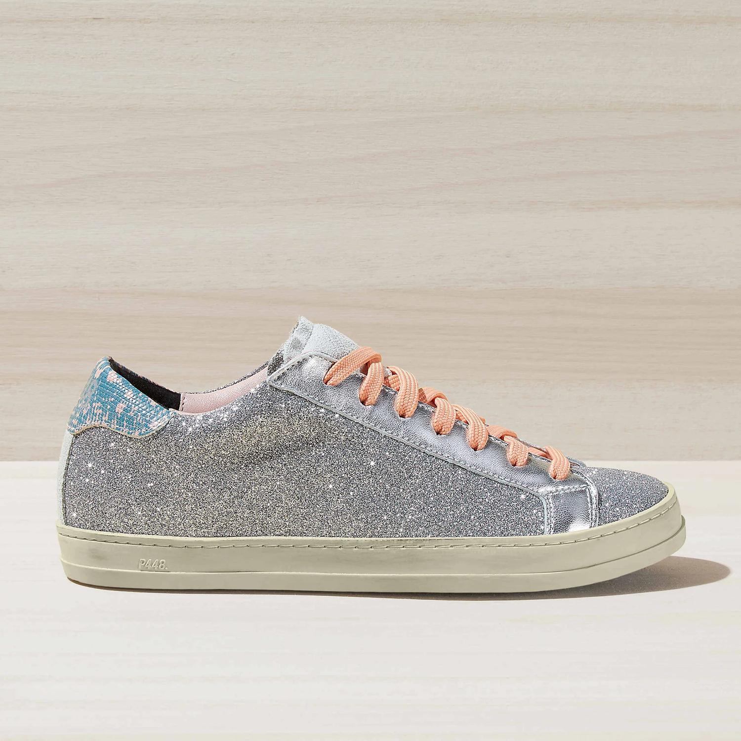 Cute, functional, and comfortable. These sneakers check all the boxes. Silver glitter upper & toe. Grey suede tongue. Silver leather trim. Teal & peach pink python-print leather heel tab with off-white suede accent. Terry cloth lining with peach leather accent. Memory foam insole. Hand-distressed P448 rubber sole. Black tread. Apricot cotton laces. Made in Italy.