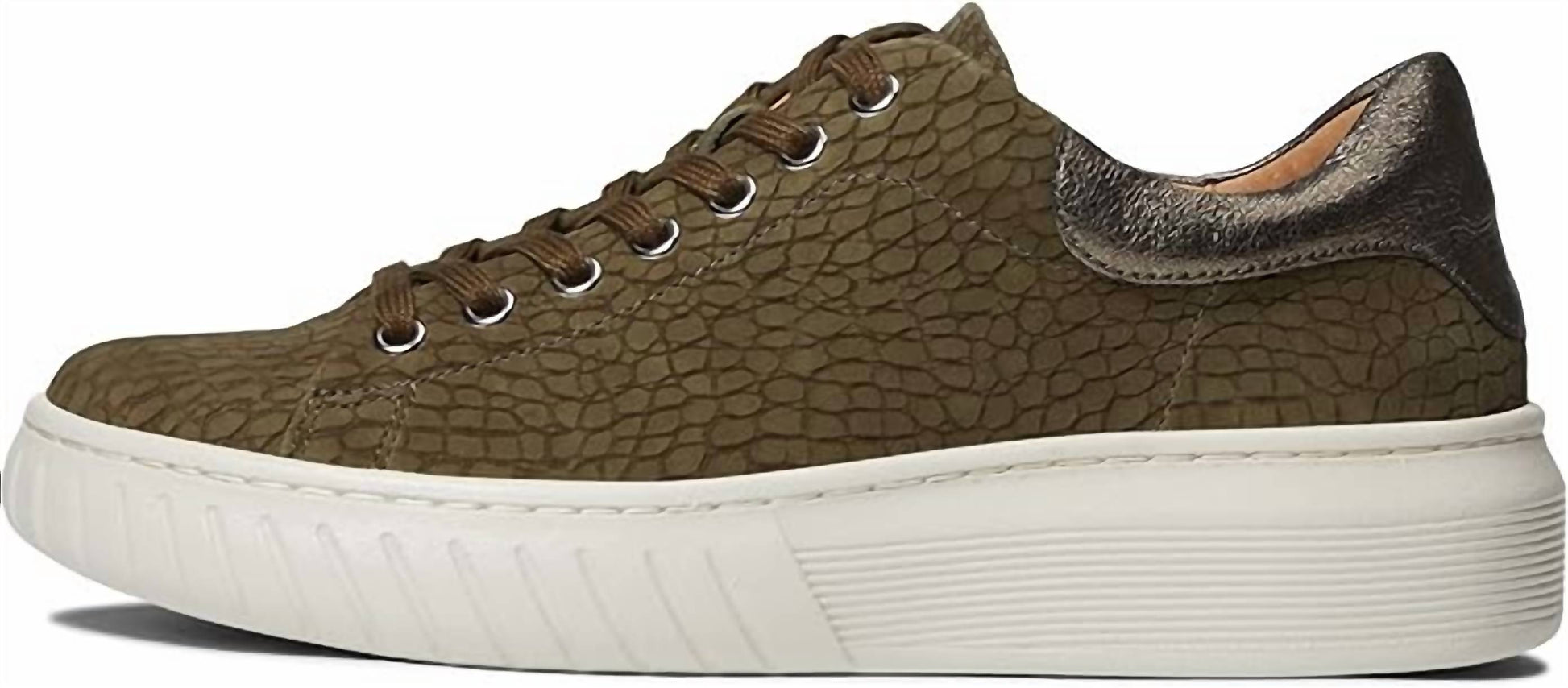 When fashion and function come together seamlessly. Experience casual perfection with the Women's Parkyn Sneaker by Sofft, featuring a unique round toe design in a chic Olive/Copper color. This sneaker offers lace-up styling, complemented by a padded collar and tongue for extra comfort. Constructed with leather lining and a leather-lined footbed, it provides a cushioned feel with added arch support. Its lightweight PU outsole and low heel height of 1.5 inches make it ideal for streetwear occasions during the spring season.