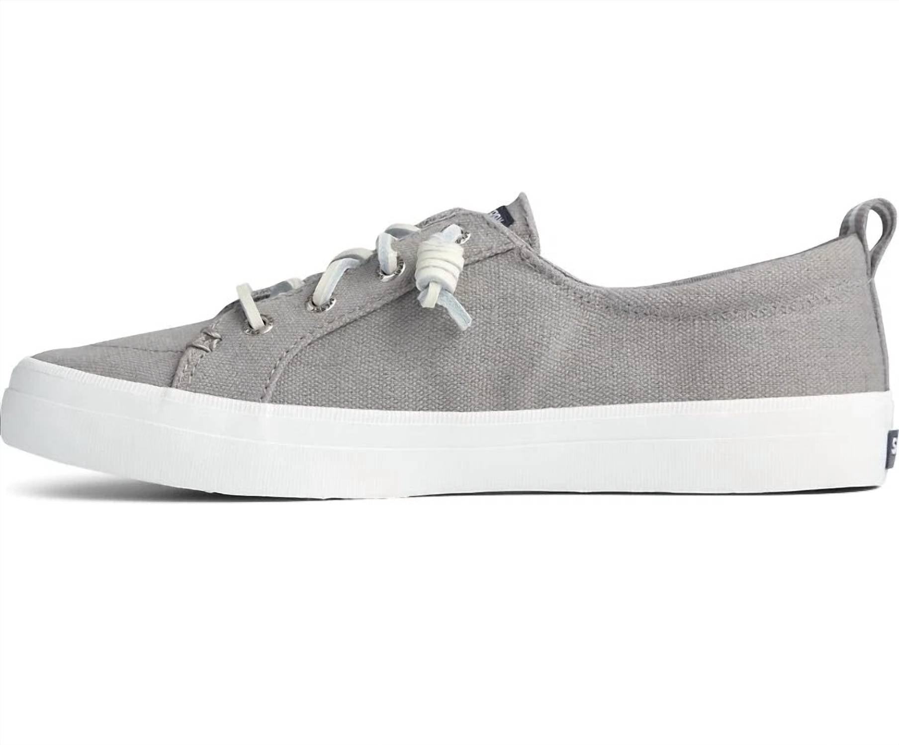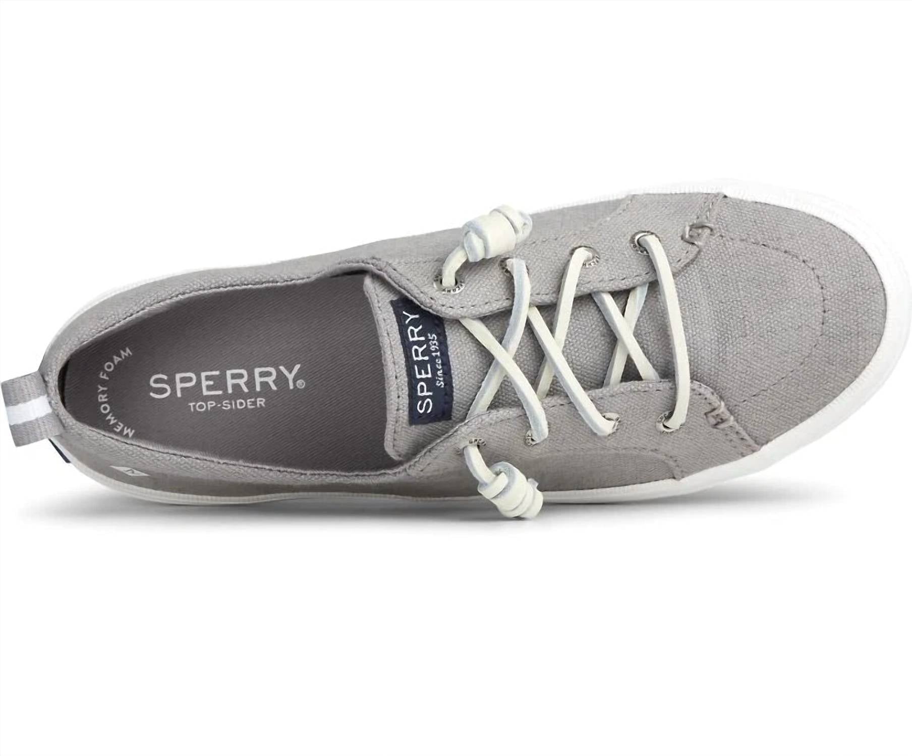 When fashion and function come together seamlessly. Step into summer with the Sperry Women's Crest Vibe Linen Sneaker, a perfect choice for travel and casual outings. Crafted from a linen blend, these sneakers in a versatile gray color are designed for comfort and style. Featuring a classic round toe and flat heel, they are best suited for warm weather adventures. Embrace effortless fashion with these must-have sneakers for women.