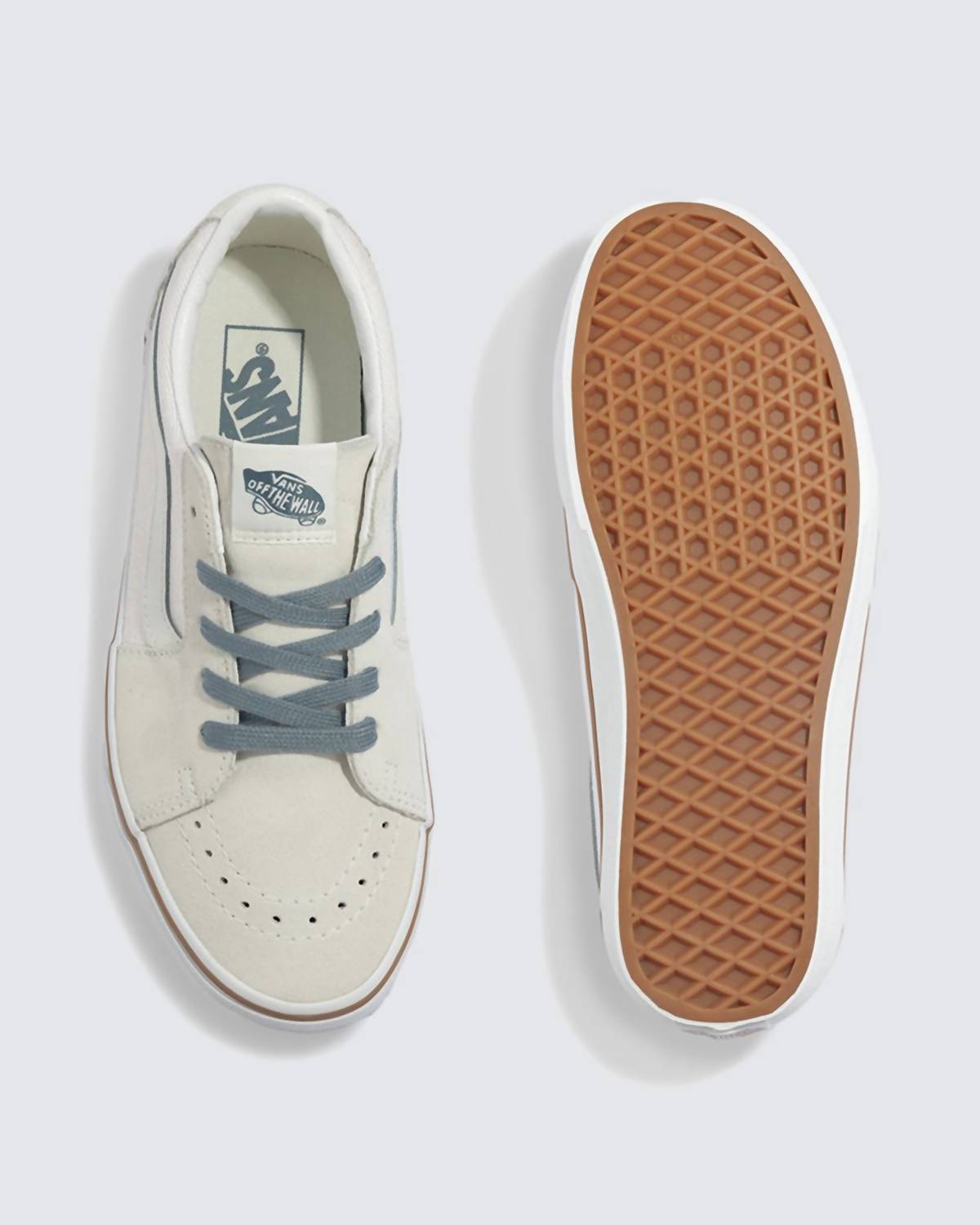 Cute, functional, and comfortable. These sneakers check all the boxes. The Women's Sk8-Low Sneaker by Vans offers a fresh take on the iconic high-top design with a classic low-top silhouette in a Twill Marshmallow color. Crafted with a durable canvas and suede upper, this sneaker features a lace-up closure, reinforced toe caps, and supportive padded collars for comfort. Enjoy the vintage appeal of its legendary sidestripe and signature Vans rubber waffle outsoles, perfect for spring outings. Embrace the trend with these round-toe sneakers designed for adult women.
