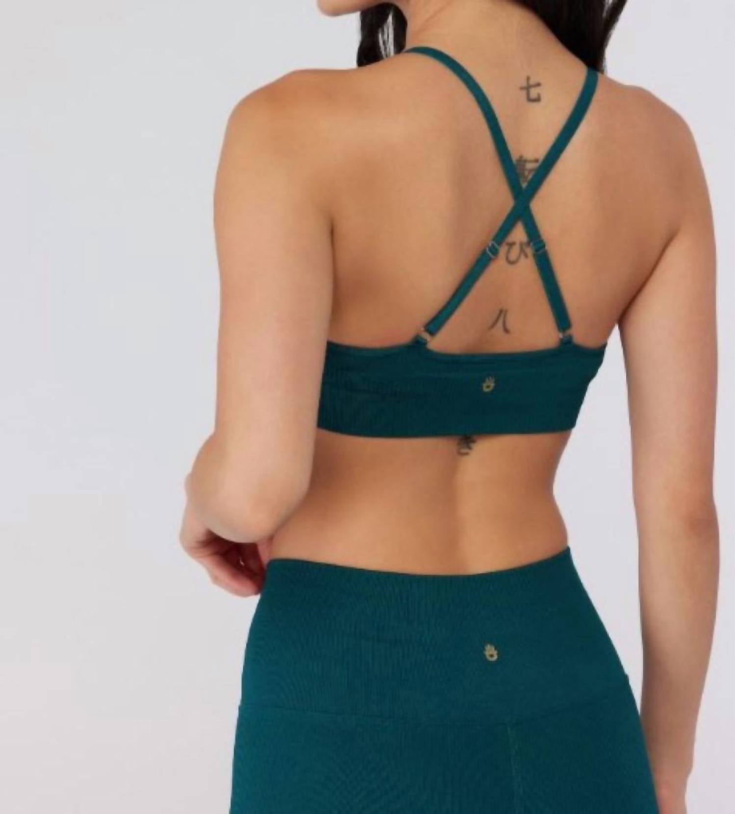 A sports bra that has it all - style, function and support. Discover the Selene Seamless Triangle Rib Bra by Spiritual Gangster, a must-have for your athletic wardrobe in a sophisticated pine hue. This sports bra features adjustable straps and a close, compressive fit for exceptional support. Made from double-layered, seamless performance fabric, it ensures comfort and freedom of movement during any activity. Perfect for women seeking both style and functionality in their activewear.