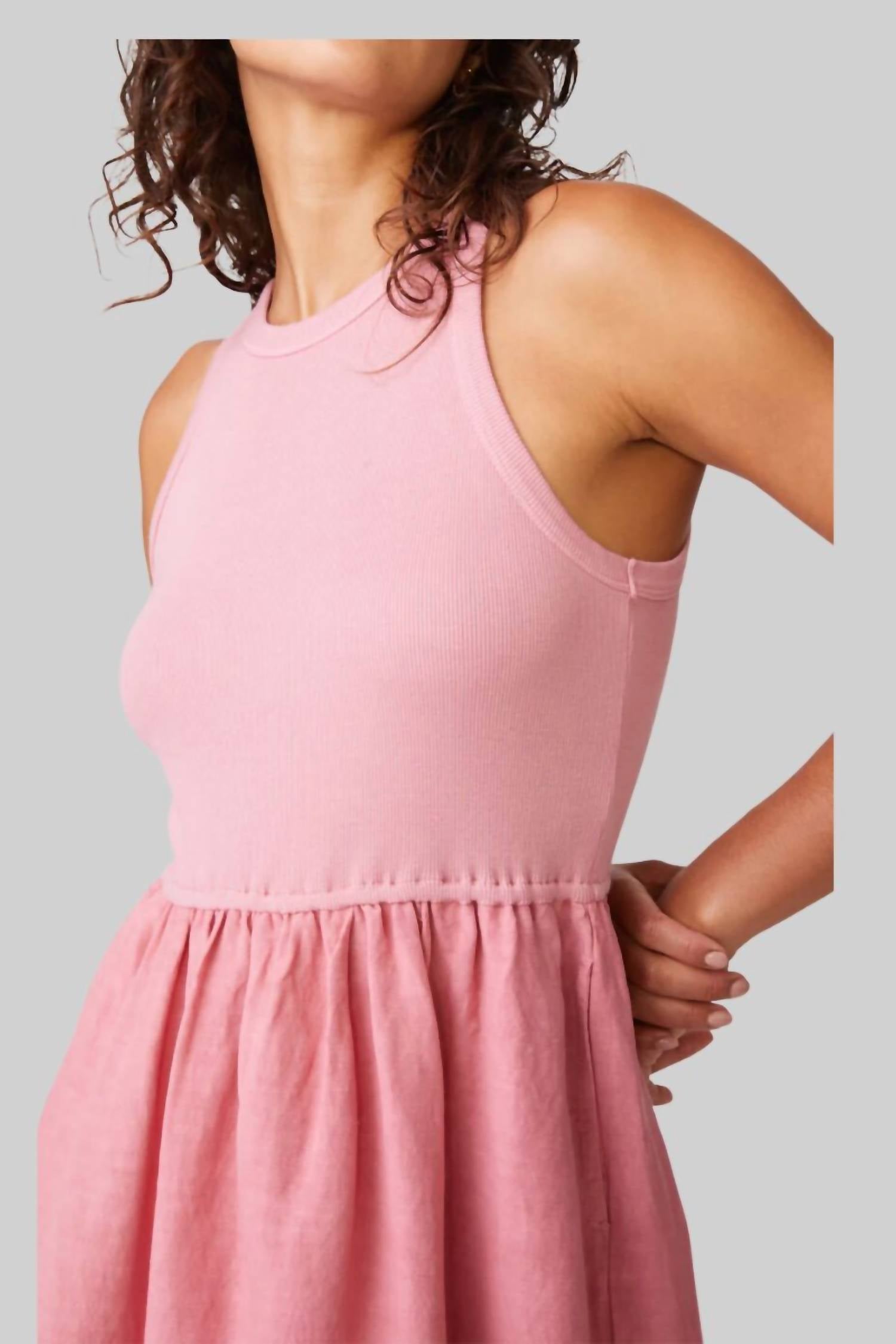Style this maxi with your favorite statement necklace and sandals for the perfect look. Embrace refined style with the Linen Mixed Media High Neck Maxi Dress by STATESIDE, crafted in a stylish mauve shade. This sleeveless dress features a crewneck and a fit-and-flare silhouette, perfect for every occasion. Made from a breathable linen blend, it provides a lightweight feel complemented by a subtle crinkled texture. The pull-on design includes hidden pockets for added convenience, ideal for keeping essentials close.