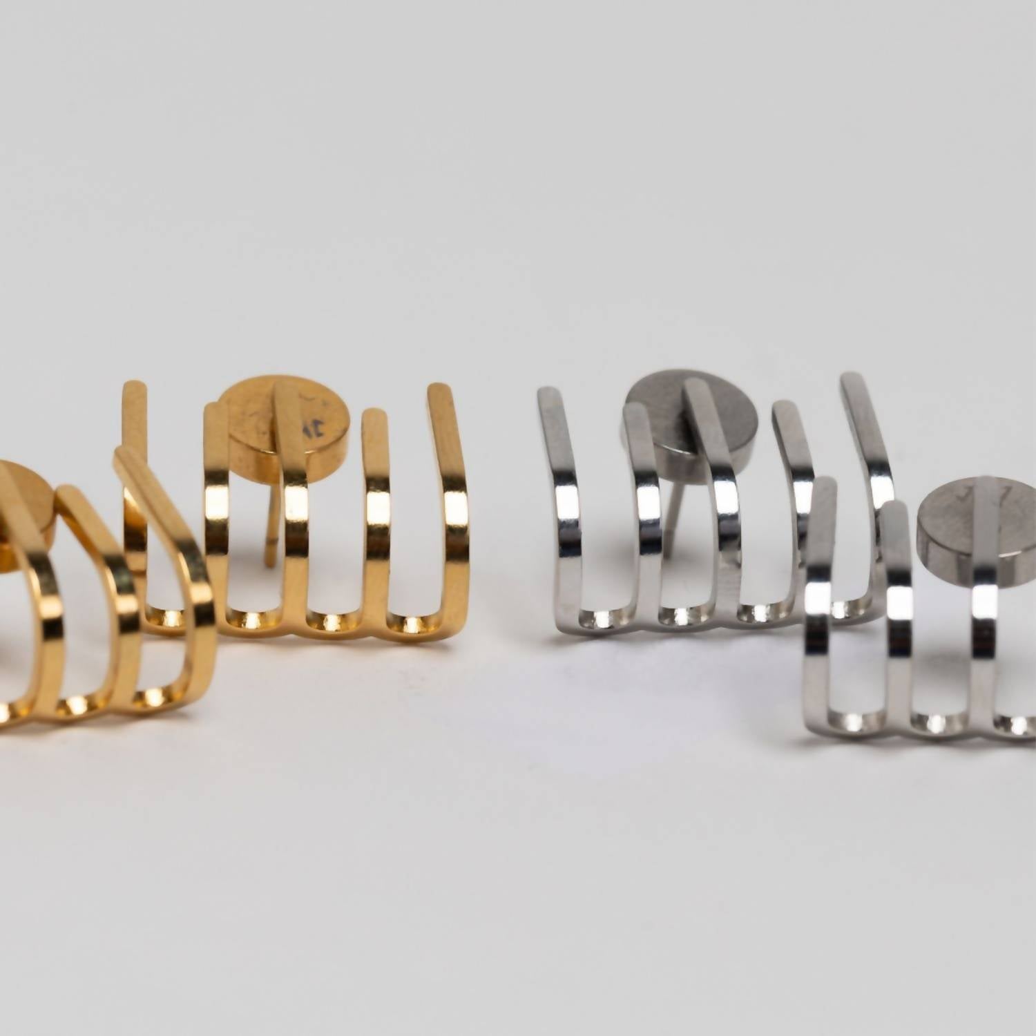 eye-catching earrings for every occasion. Discover the Women's Claw Earrings by Jagged Halo Jewelry, a bold statement piece with a refined edge. Crafted from stainless steel with an option for yellow gold plating, these one-inch ear climbers feature a striking four-bar design that gracefully wraps around the earlobe. Hypoallergenic and waterproof, they are designed to resist tarnish for a lasting shine. For care, simply wipe clean with a soft cotton cloth.