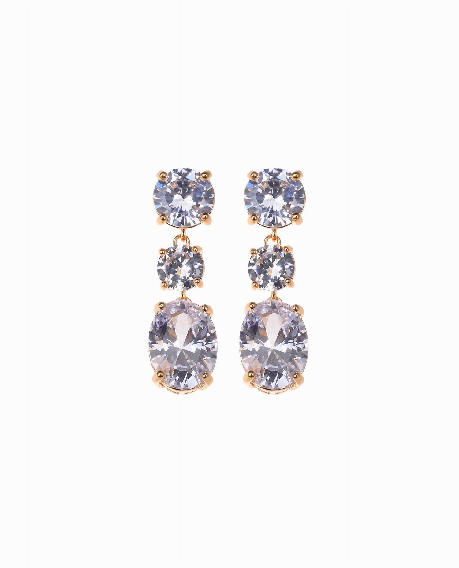 These Earrings feature a trio of dazzling 70% Cubic Zirconia 30% Brass with 14k gold plating. Crafted with a chic drop design, they enhance elegance for both day and night occasions. Perfect for adding a sparkling finish to any ensemble.