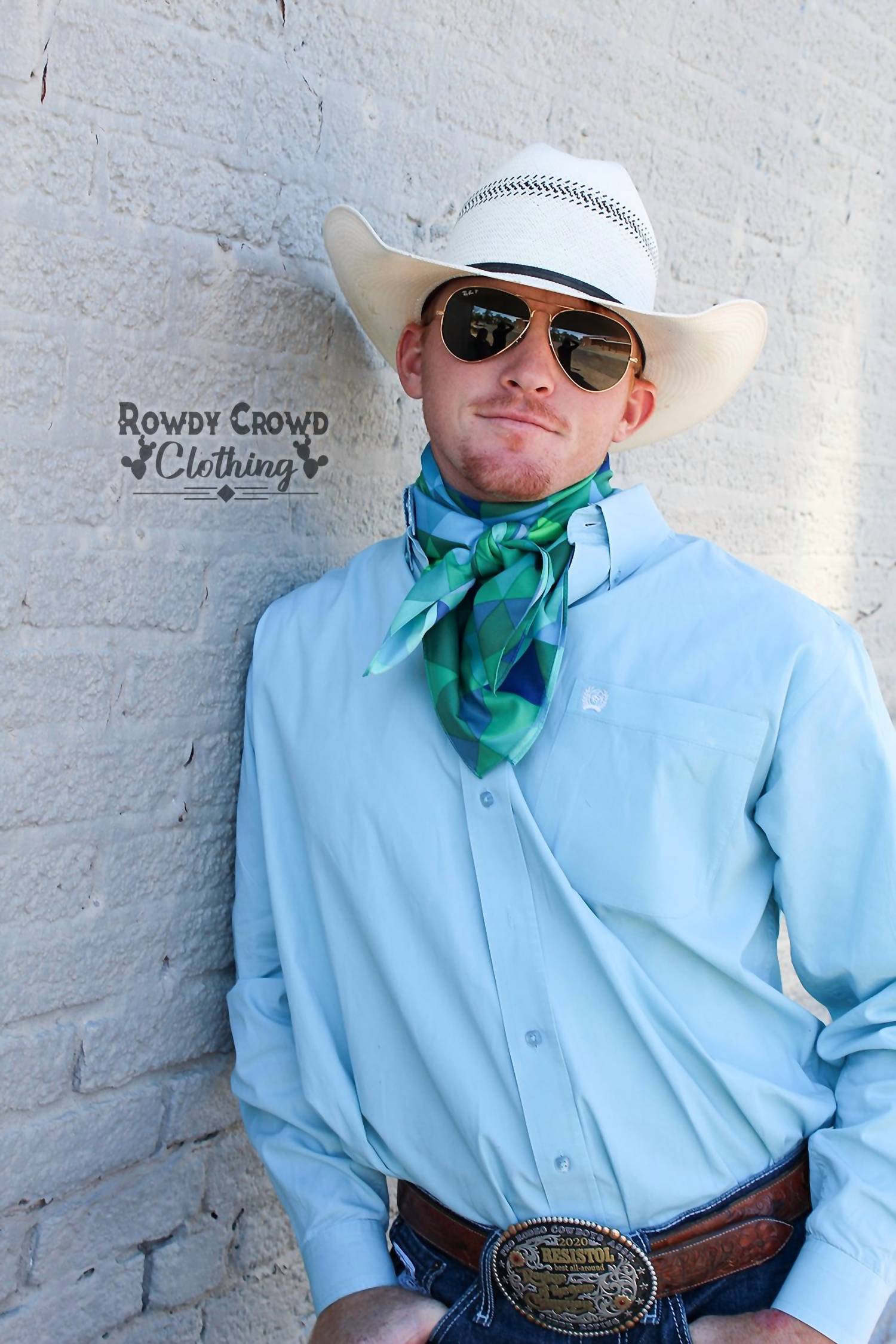 The perfect accessory to complete any look. Introducing the Unisex Geo Wild Rag by Rowdy Crowd, a versatile accessory in a striking blend of blue and green geometric triangles. Crafted from quality polyester, this 36" x 36" wild rag offers endless styling possibilities. Perfect for traditional wear as a winter scarf or as a stylish headband, and even as a unique belt. Elevate any outfit with this dynamic piece that embodies both style and function.