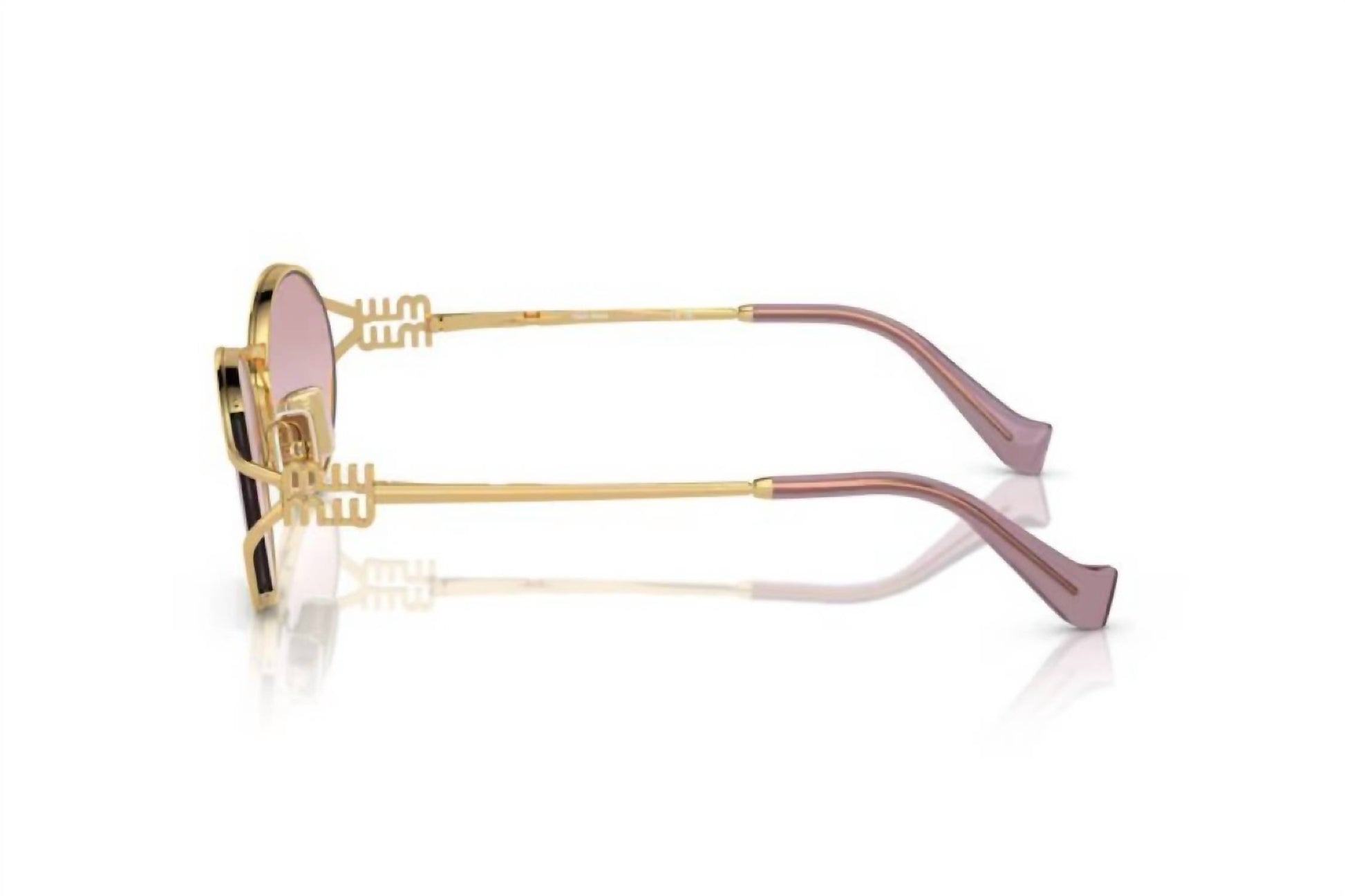 Blending fashion and practicality, these stylish shades are chic and mandatory. Stand out from the crowd and safeguard your vision with these stand-out sunglasses. Introducing the Women's SMU52YS Sunglasses by Miu Miu, a chic accessory crafted for those who value style and sophistication. Featuring a gold metal frame with a tasteful round and oval design, these sunglasses offer a contemporary elegance. The lenses are made from polyamide and showcase a striking brown gradient violet hue. Proudly made in Italy, these sunglasses measure 54-39-125, ensuring a comfortable and flattering fit.