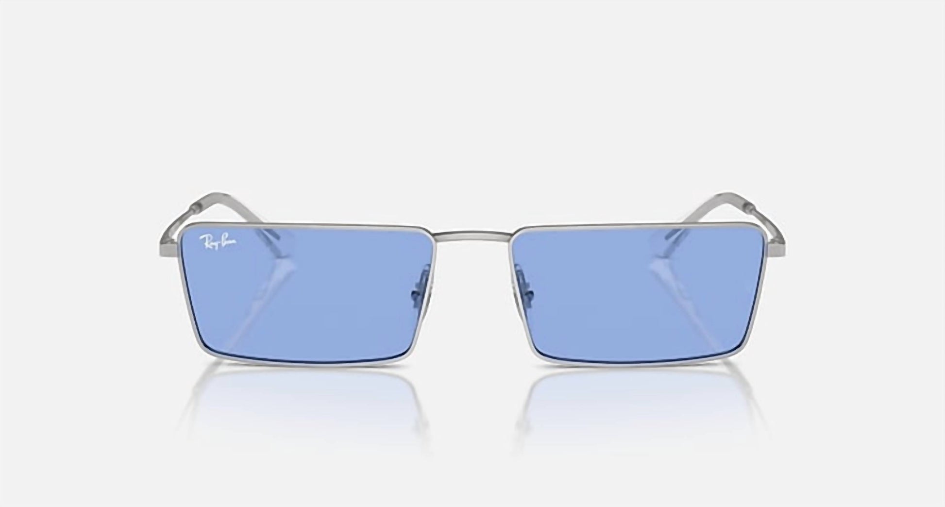 Introducing the Men's Emy Bio-based Sunglasses by Ray-Ban, a stylish fusion of modern design and eco-conscious materials. These sunglasses boast a sleek rectangle frame in polished silver, crafted from durable metal. The temple color complements the frame in matching silver, while the solid color blue lenses add a bold touch. Style confidently in these distinctive blue/silver sunglasses, embodying the iconic Ray-Ban appeal.