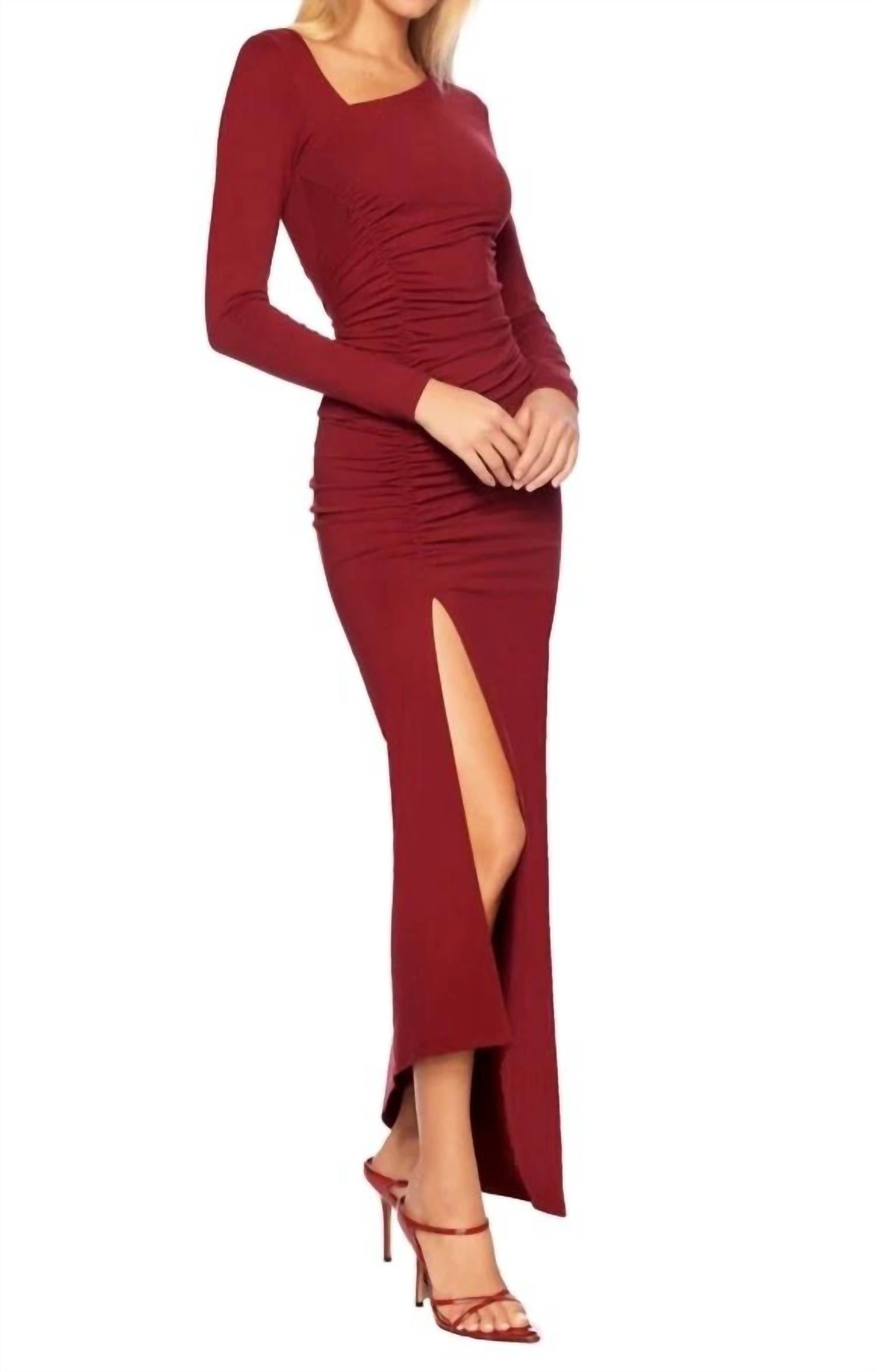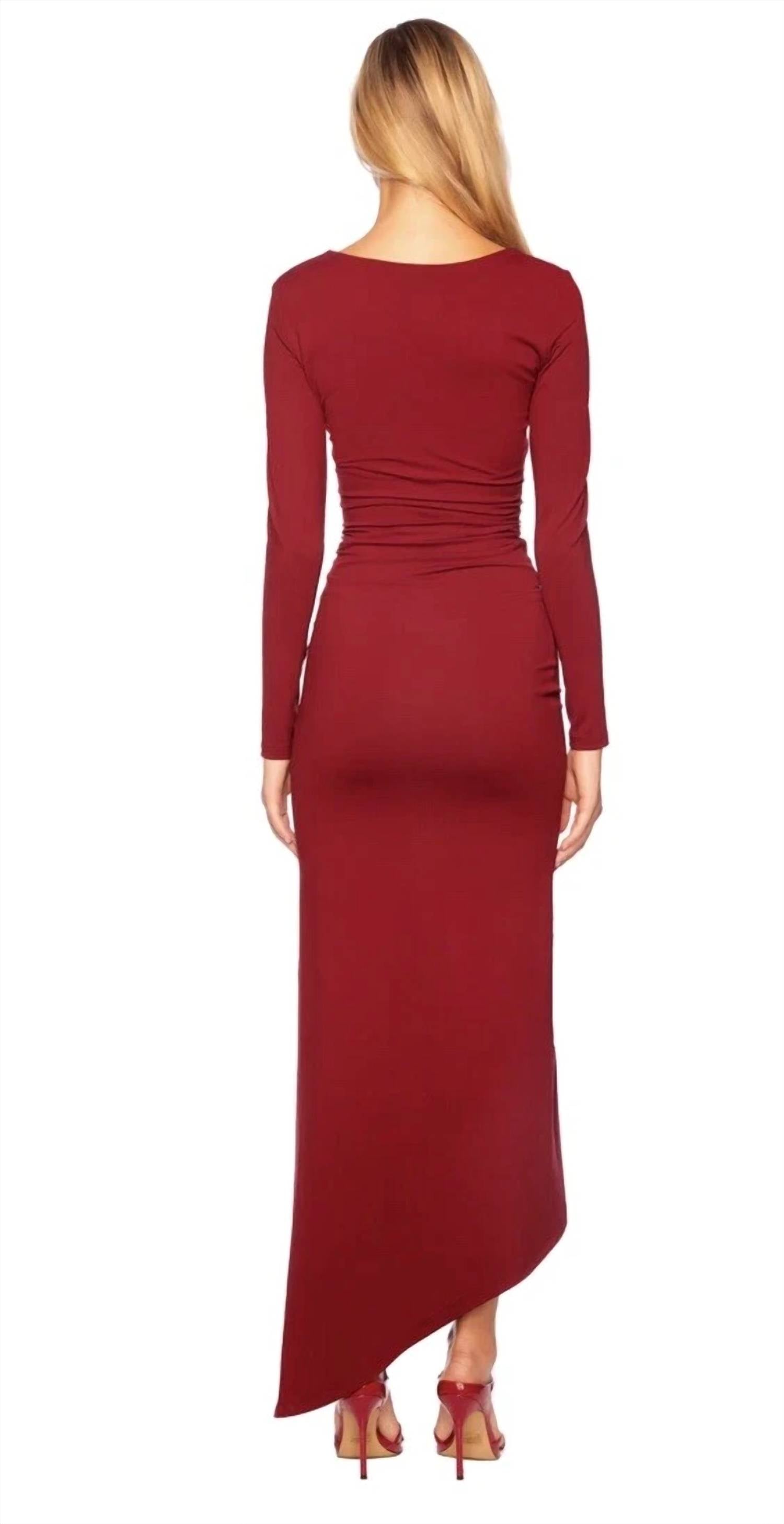 The pefect long sleeve dress for those cooler months. Striking choice for any evening event. Crafted in US. Beaujolais-hued masterpiece features long sleeves and an asymmetric neck, beautifully complemented by gathered ruching and a thigh-high slit that flows into a high-low hem. Composed of 90% nylon and 10% spandex, offering a solid pattern that embodies bodycon allure. Pull-on style. Hand wash and lay flat to dry.