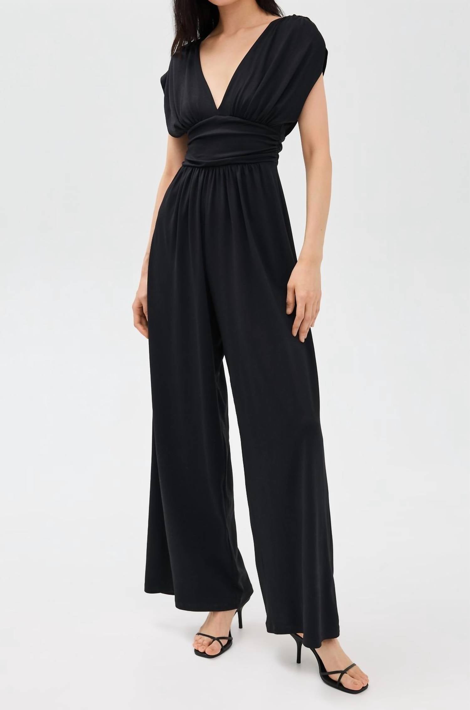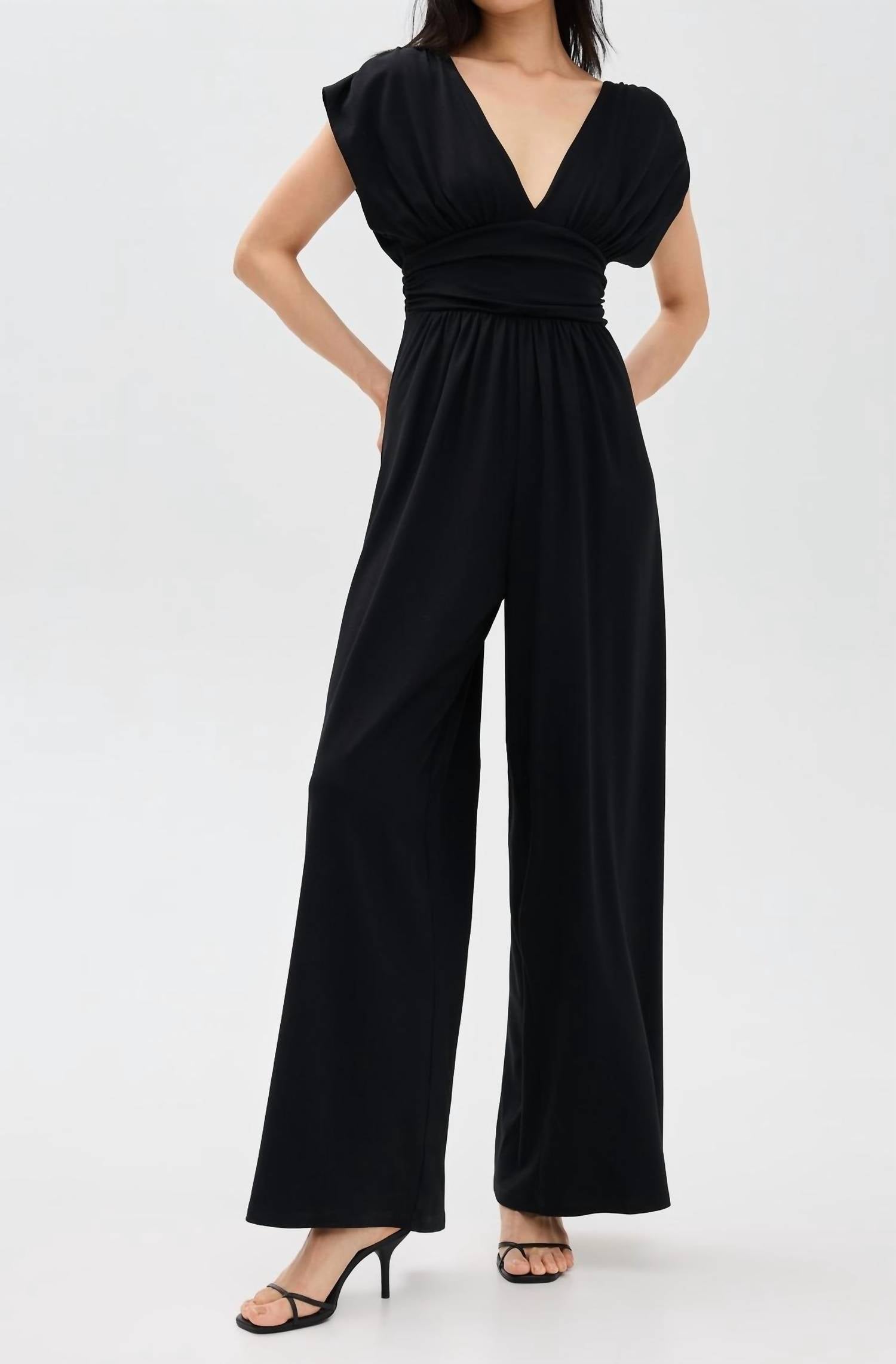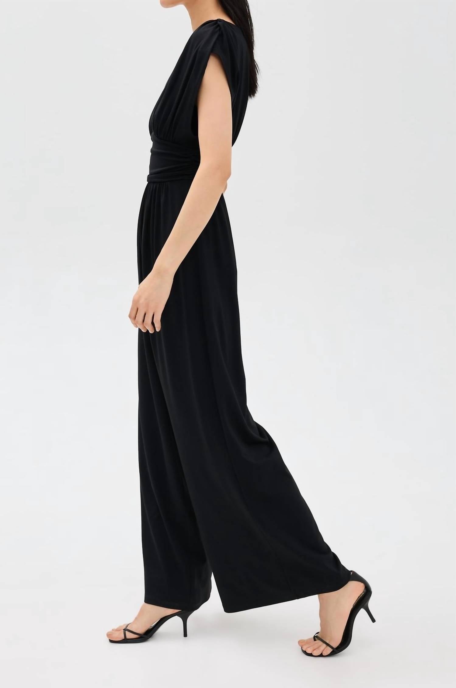 The perfect outfit choice when you you need something quick to throw on and still want to look efforlessly cool. Introducing the Susana Monaco Short Sleeve Wide Leg Jumpsuit, a chic choice for evening events in classic black. Crafted from a mid-weight stretch jersey, this sleeveless jumpsuit features gathered details and a convenient pull-on design. Composition: 94% Nylon, 6% Spandex. Made in the USA, this solid-patterned piece is ideal for maximalist style and offers easy care instructions: wash cold and lay flat to dry.