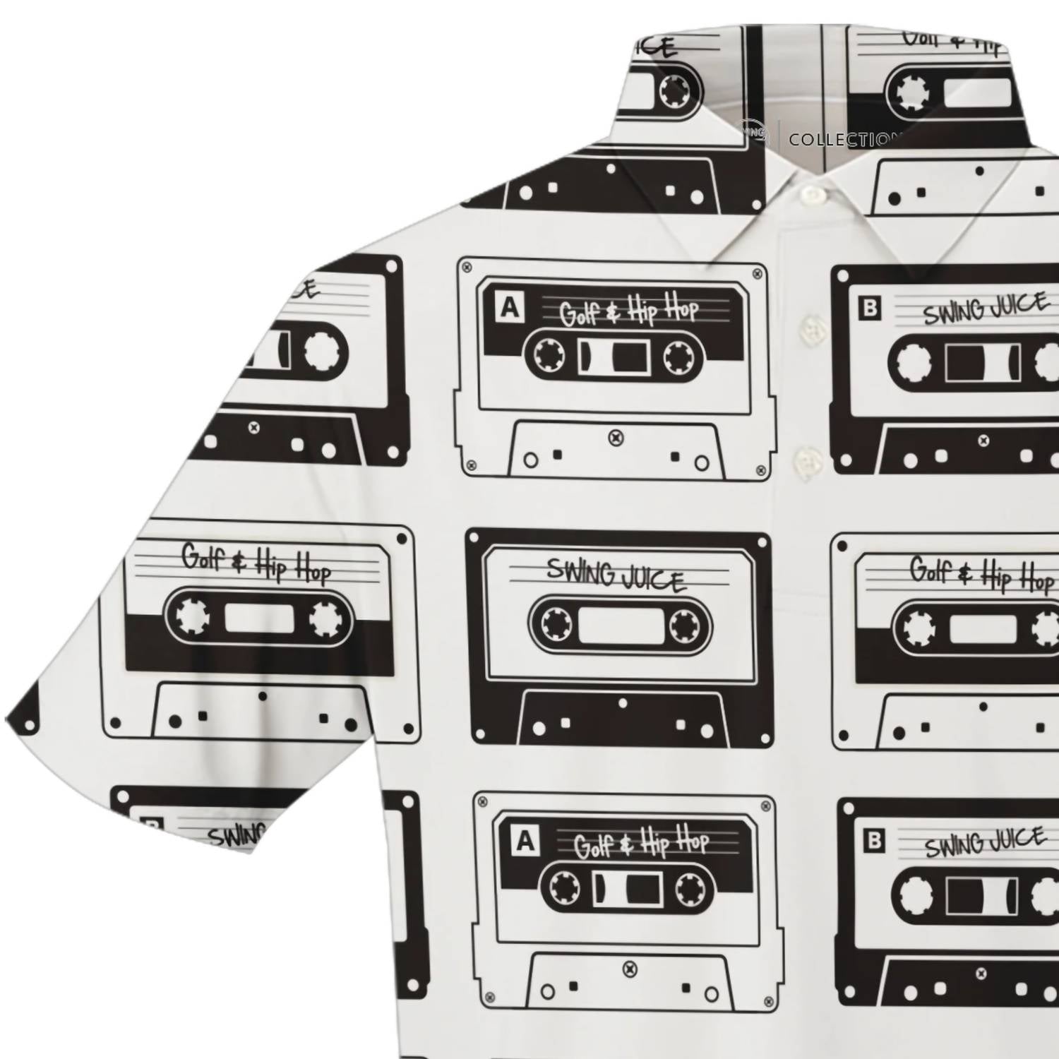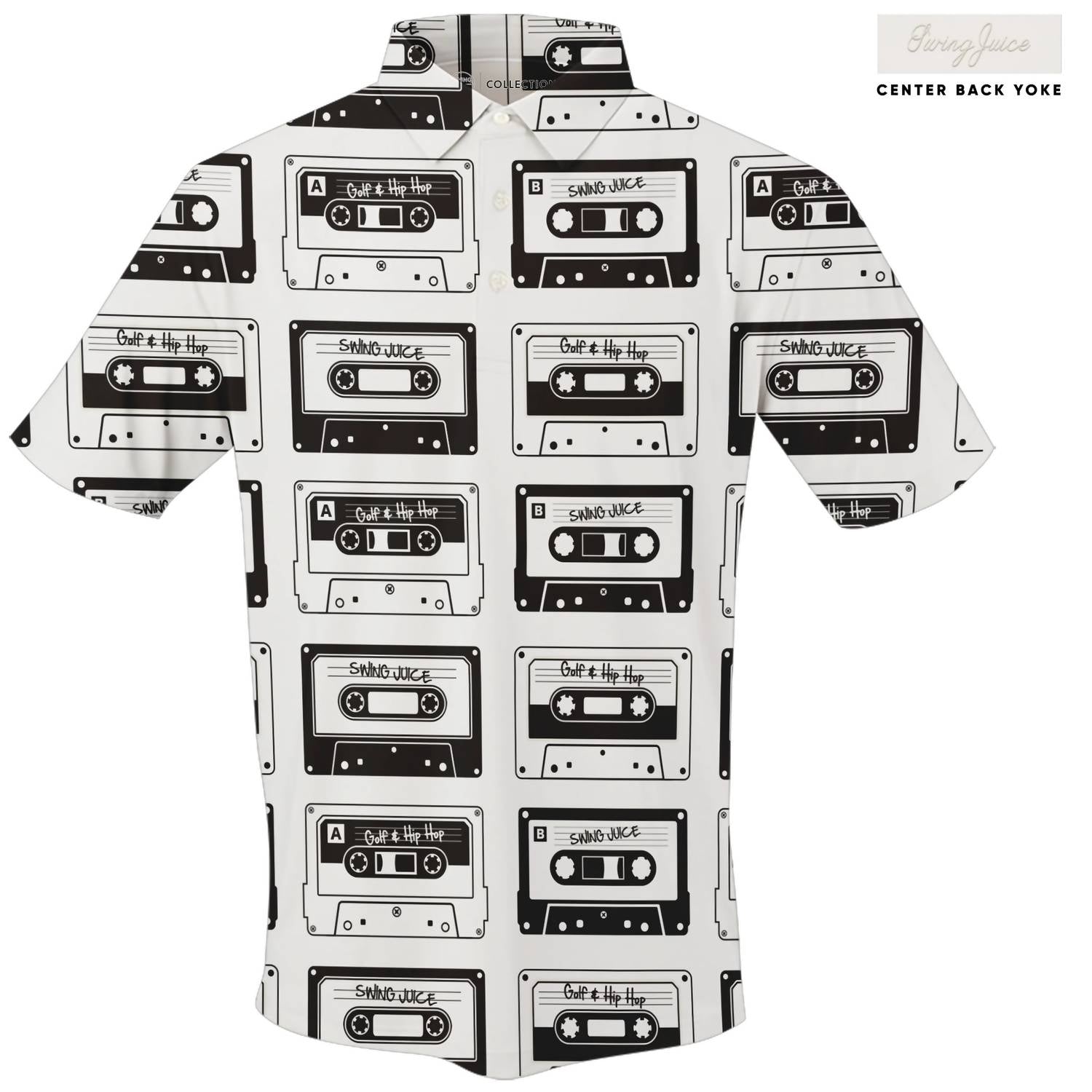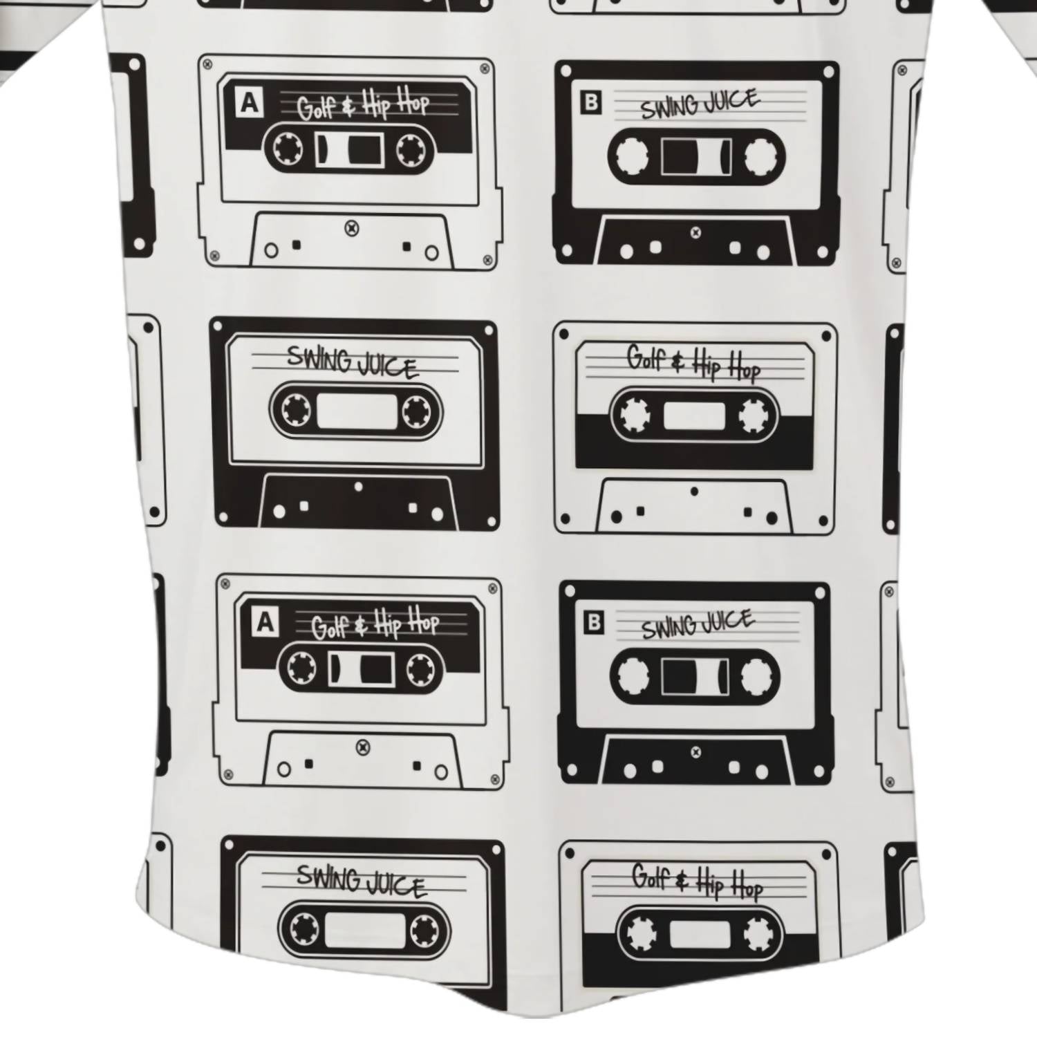 Step up your game with the Men's Golf Mixtape Polo by SwingJuice, a stylish piece in classic ivory featuring a bold, retro mixtape design. With short sleeves and a tailored fit accented by an uneven vented hem, this polo ensures comfort and breathability. Crafted with bamboo charcoal infused 92% Micro Poly and 8% Spandex, it offers UPF 50+ sun protection and natural odor resistance. Closure: Three-button placket. Care instructions: Machine wash cold and tumble dry low for easy maintenance.