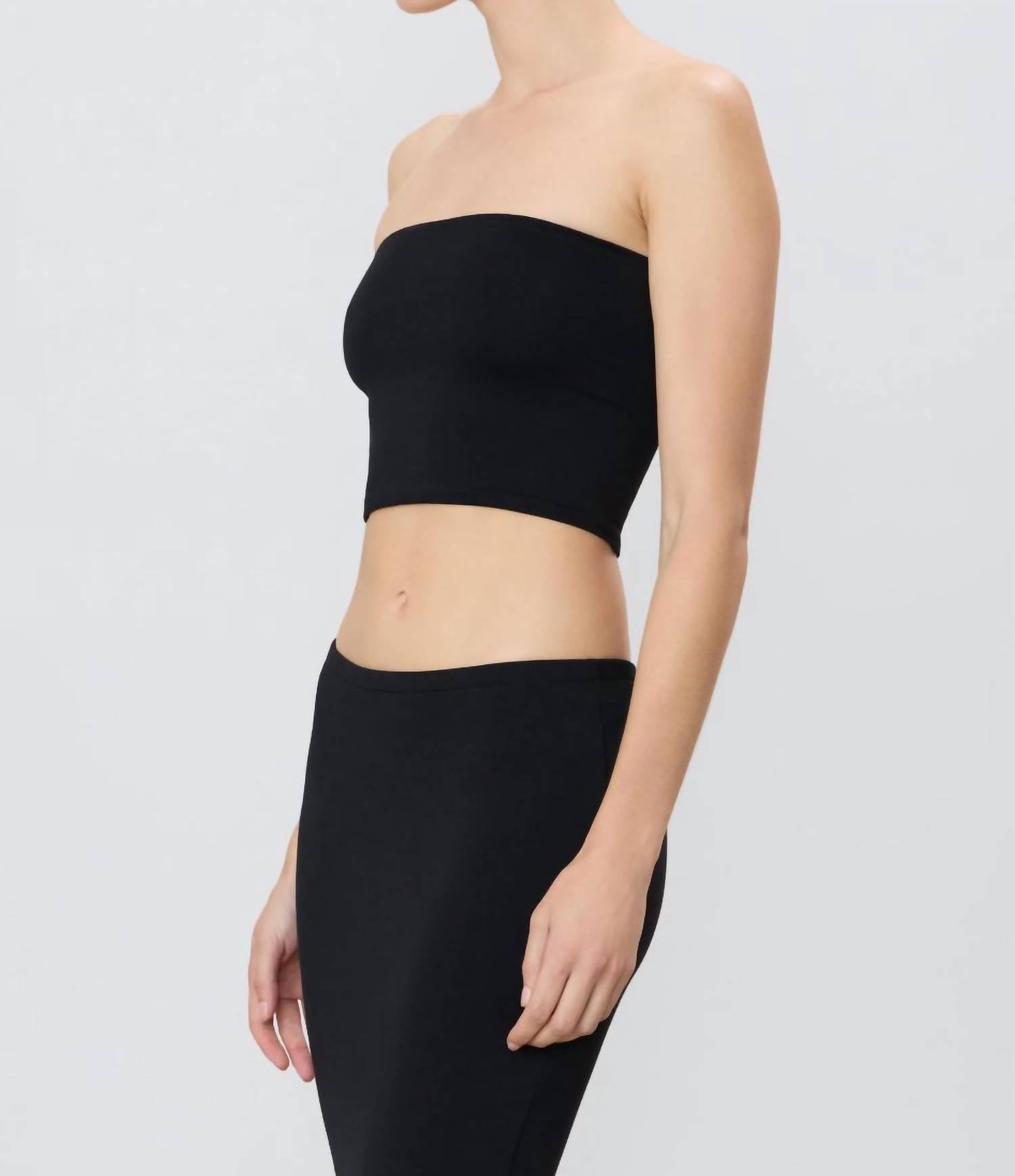 The perfect crop top for those warmer weather days. Introducing the Eterne Amina Top, an essential piece in solid black tailored for a versatile day-to-night look. This women's crop top is sleeveless with an off-the-shoulder neckline, crafted from a soft blend of 96% Modal and 4% Spandex for a slim fit. Featuring a pull-on closure, this top is designed to complement your silhouette with a cropped length. Care instructions include machine wash cold, non-chlorine bleach, and lay flat to dry for best results. Model is 5'10" and wearing a size S.