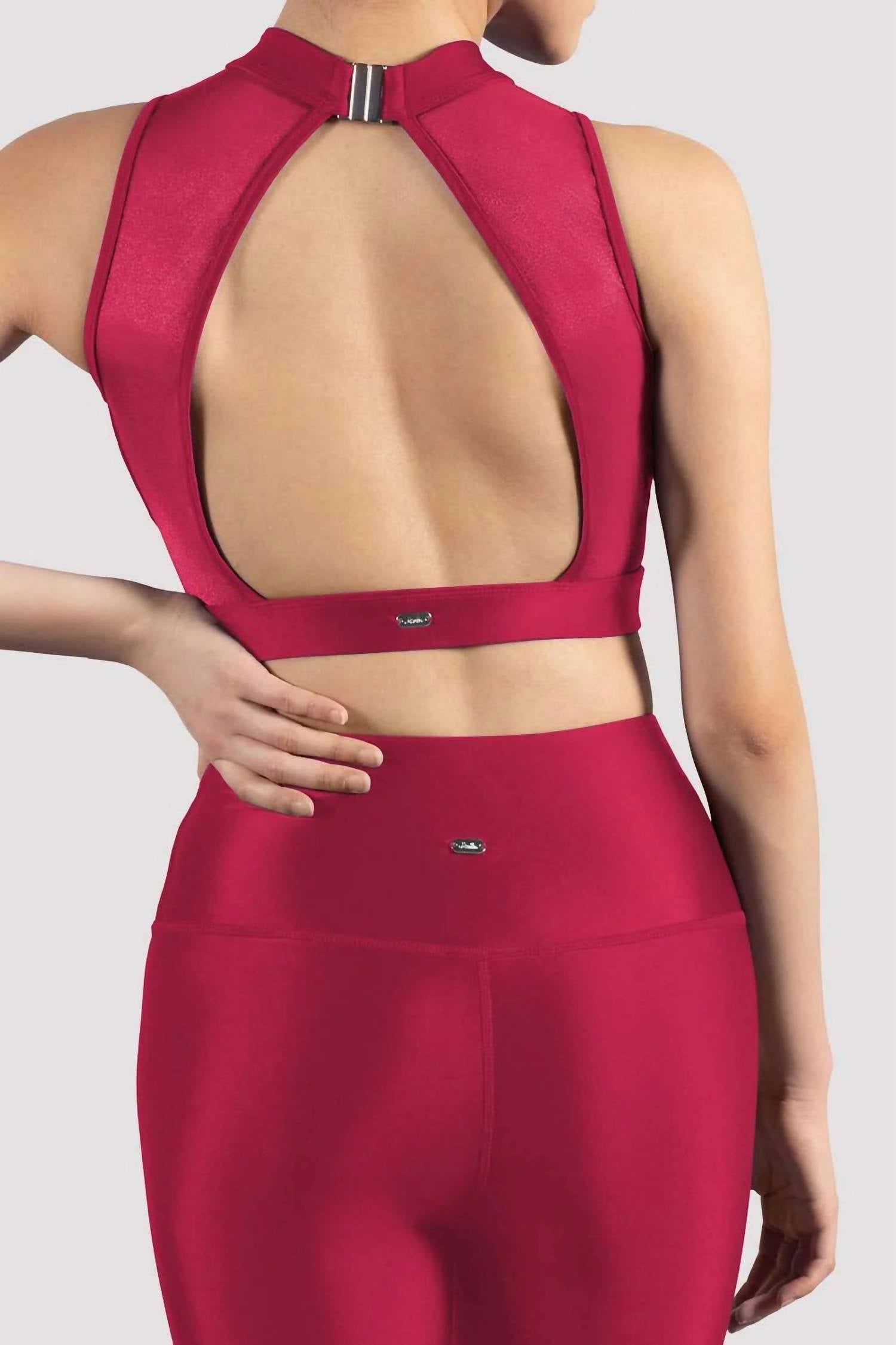 Pair this crop top with your favorite high-waisted jeans or maxi skirt. Step into elegance with the Mirella Glow High Neck Crop Top by Bloch, crafted for the modern woman in a stunning raspberry hue. This sleeveless activewear piece combines a mockneck and a captivating open mesh back with a clip closure for a secure fit, enhanced by an elasticated underband. Made from glossy shine recycled nylon, it represents both style and sustainability. Care is simple: hand wash and line dry to maintain its radiant allure.