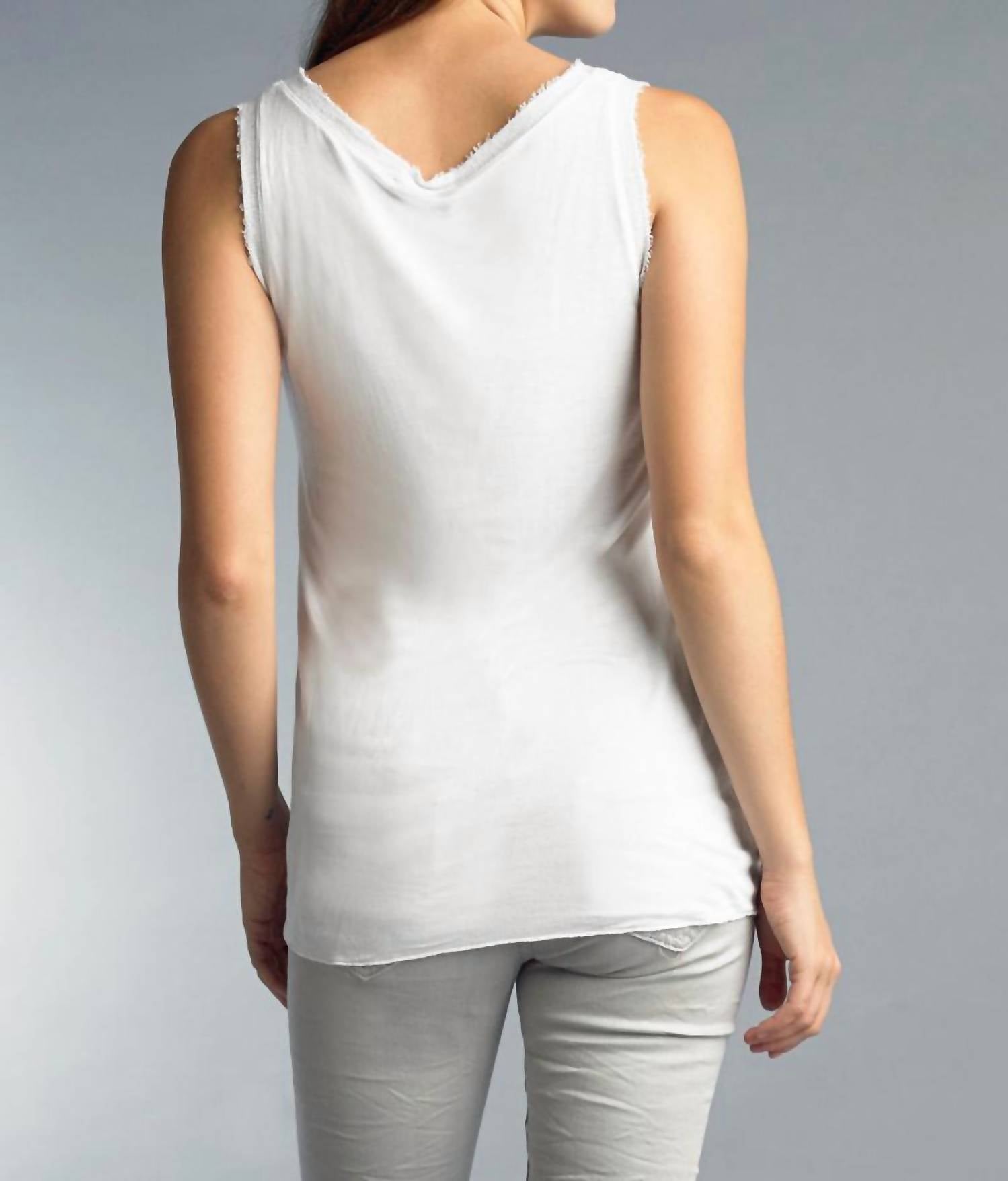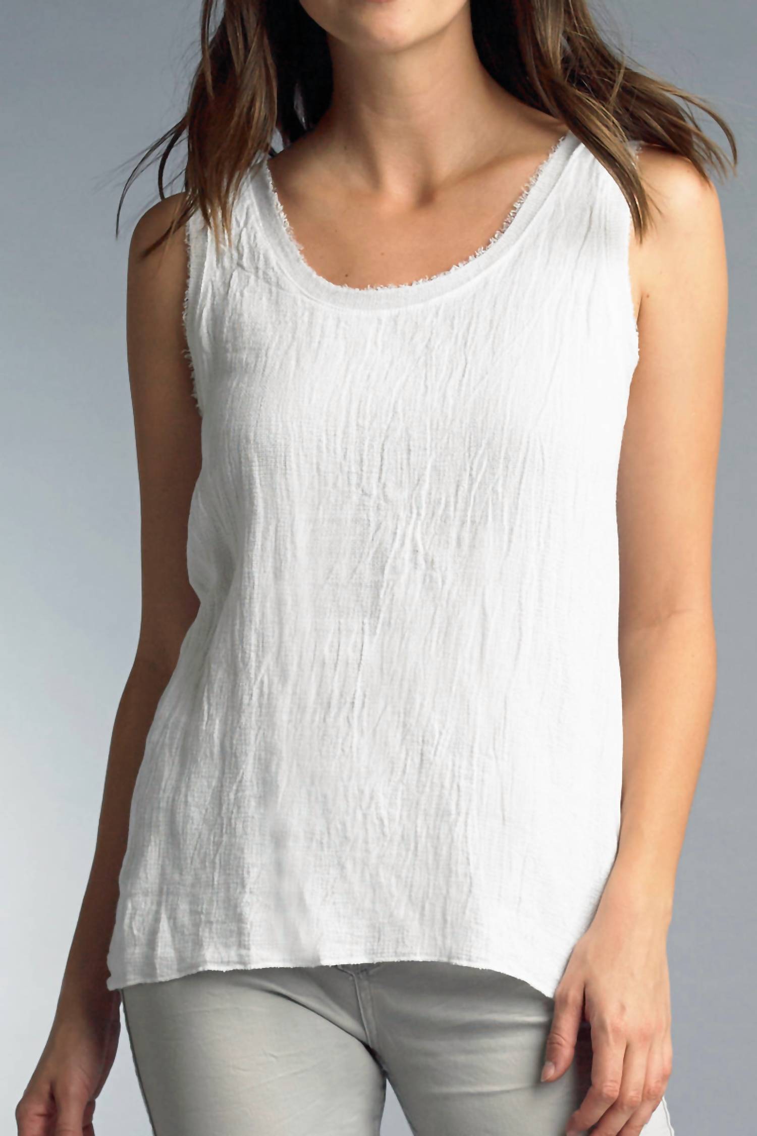 This classic tank top is perfect for layering and cute enough to wear on its own. Elevate your summer wardrobe with the Linen Frayed Neckline Tank Top from Tempo Paris, designed for both style and comfort. Crafted from 100% washable linen, this sleeveless tunic in a classic white hue boasts a loose fit and a chic frayed scoop neckline for a touch of effortless elegance. Made in Italy, it is available in sizes S to XL, ensuring a true-to-size fit for everyone. Ideal for hot days, this tank is perfect for wearing alone or for layering.