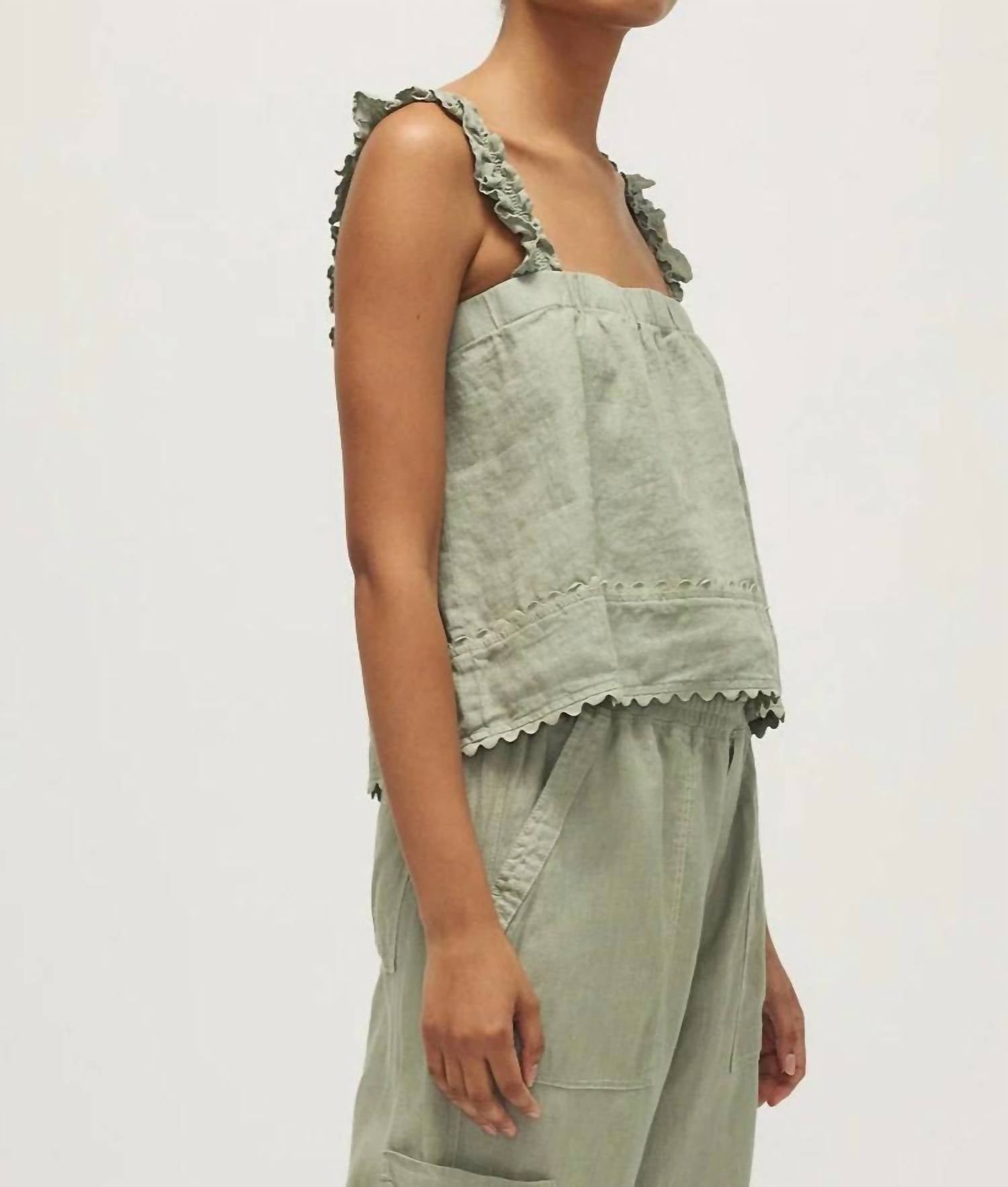 This classic tank top is perfect for layering and cute enough to wear on its own. Elevate your wardrobe with the MELISSA NEPTON Anny Tank, a stylish choice for any occasion. Sleeveless with ruffle details, this tank is made from 100% linen with a solid light khaki color and a double-lined design for added quality. It features a square neckline and a convenient pull-on closure. Care includes hand washing in cold water, laying flat to dry, and ironing on low.