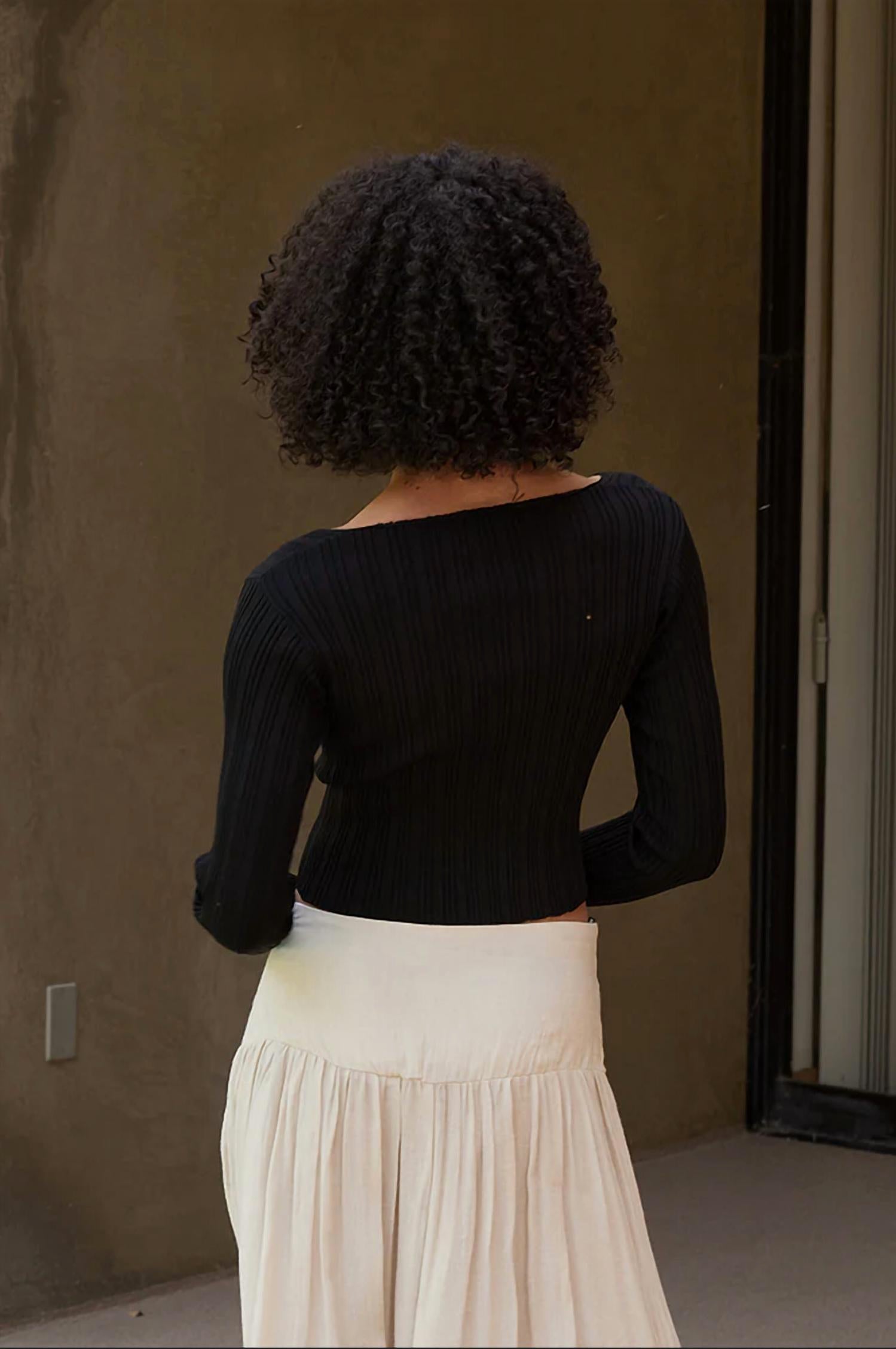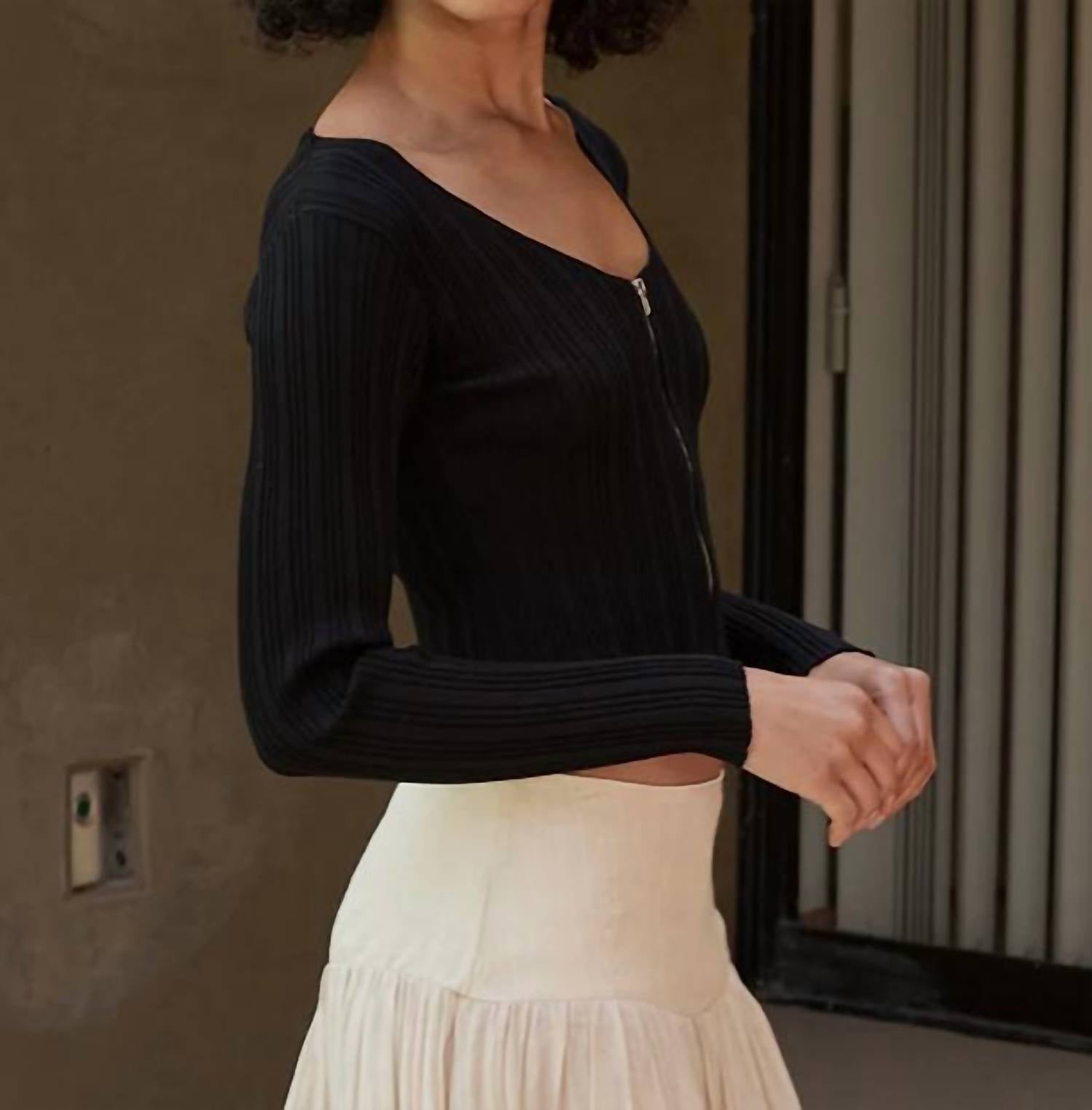 Pair this crop top with your favorite high-waisted jeans or maxi skirt. This women's crop top features long sleeves and a scoop neckline, crafted from a solid nylon blend incorporating 56% Nylon and 44% Rayon. It boasts a cropped, fitted silhouette with a front zip closure for a sleek finish. Designed for mindful care, we recommend spot cleaning and laying flat to dry. Model wears a size small.