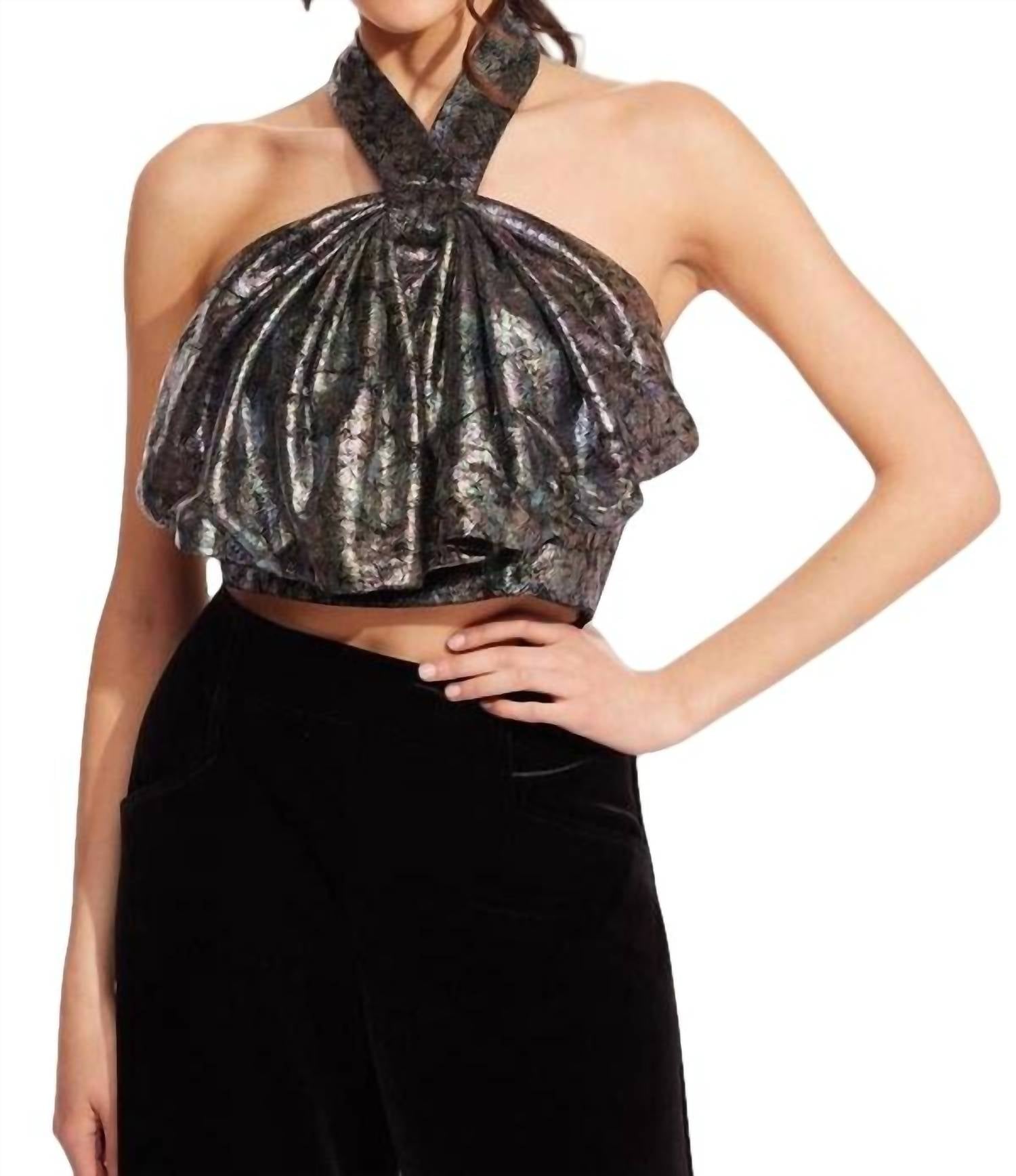 Halter neck silver cropped top with hidden back zip and an oversized bow in the front. 67% Rayon 33% Polyester. Lining: 100% Polyester. Hand wash cold. Made in Los Angeles, USA