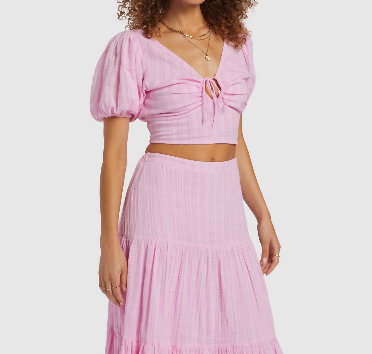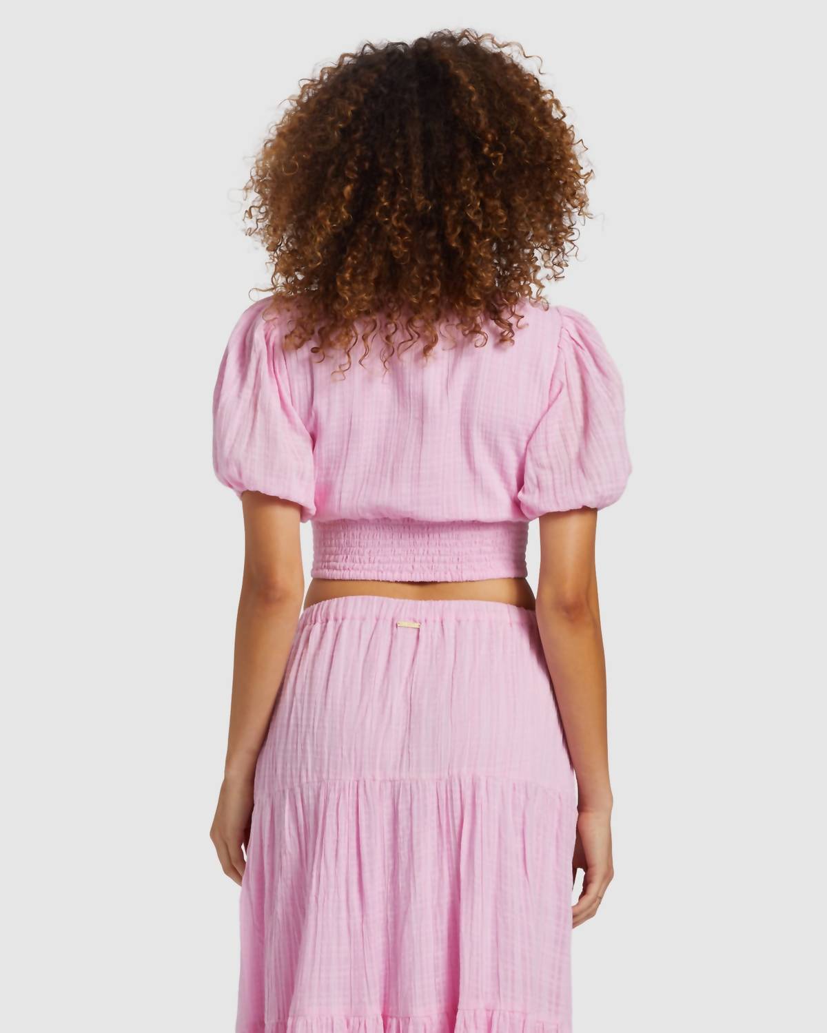 Pair this crop top with your favorite high-waisted jeans or maxi skirt. Discover the Tropic Heart Cropped Blouse by Billabong, a dreamy addition to your wardrobe in Pink Dream. This chic piece features short puff sleeves, crafted from cotton check gauze fabric, perfectly complementing its figure-hugging cropped fit. The V-neck design with cut-out detail and matching ties adds a playful touch, while the fixed metal plate branding ensures its authenticity.