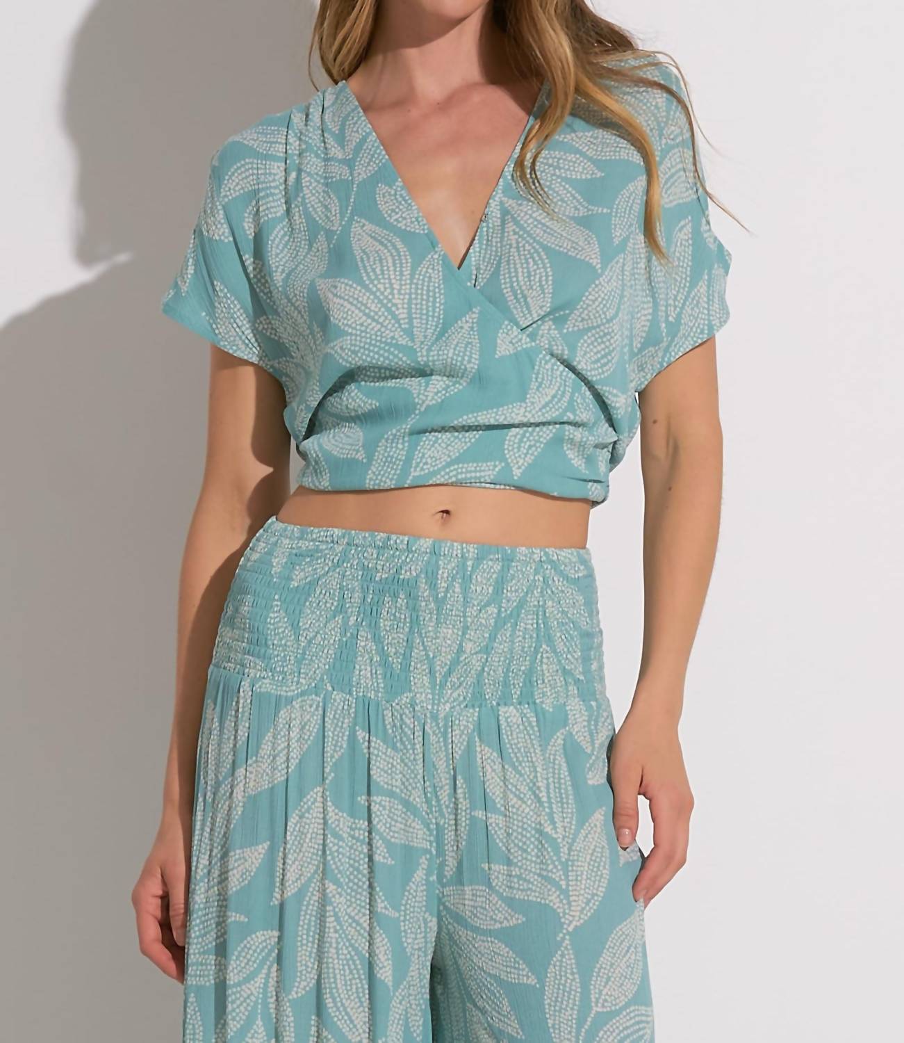 The perfect crop top for those warmer weather days. Introduce a vibrant touch to your spring wardrobe with the ELAN Cartagena Print Tie Top in a striking teal floral design. This women's crop top features short sleeves and a V-neckline, offering a comfortable pullover style with a chic tie closure. Crafted from rayon, it boasts a flattering cropped length of approximately 19.5 inches. Perfect for pairing with high-waisted pants, this versatile piece will elevate any ensemble.
