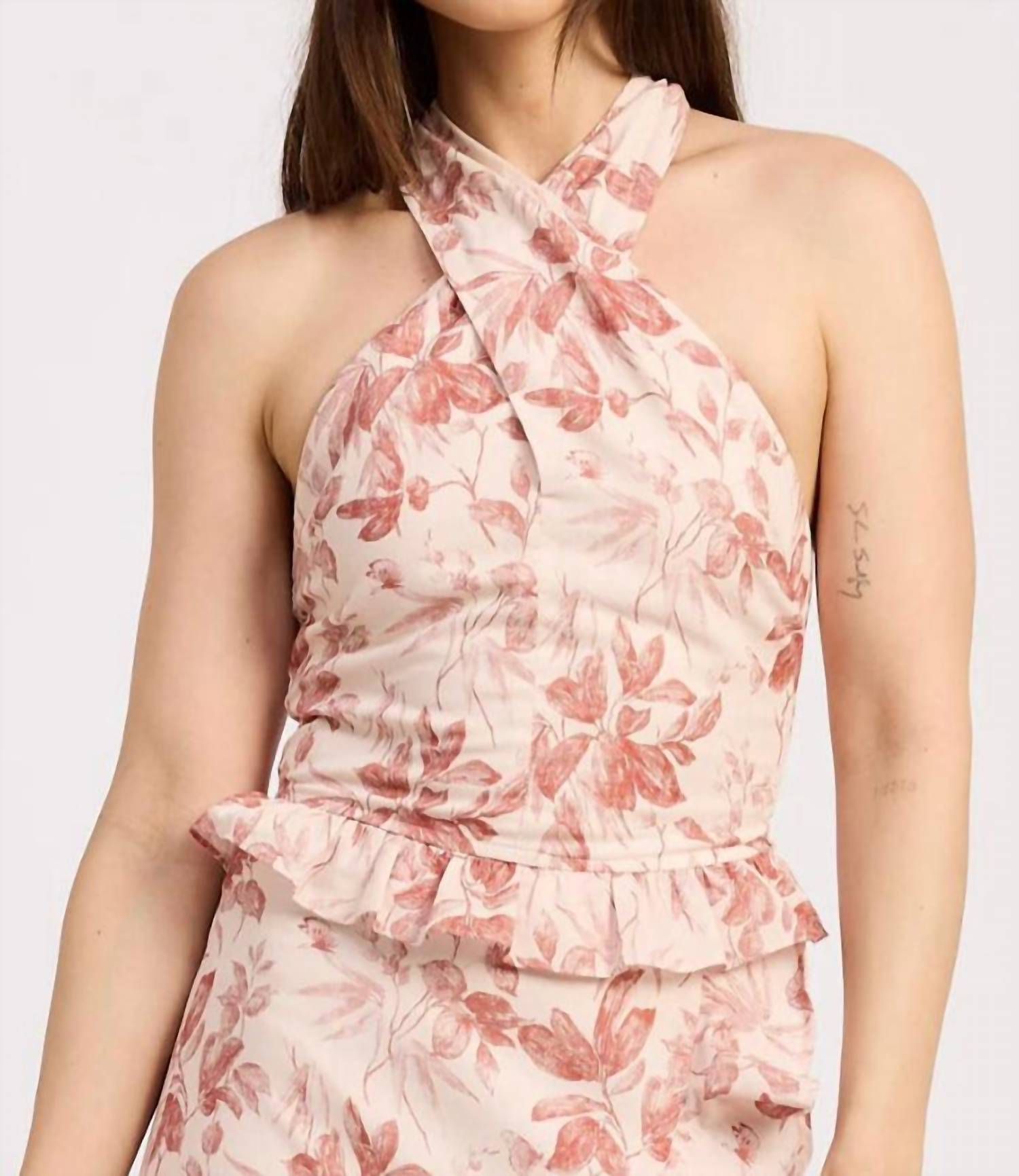 Show a little skin in this cute and casual crop top. The Women's Sedona Top by En Saison is a chic addition to any summer wardrobe, perfect for cocktail parties with its boho chic floral pattern. This sleeveless halter top is crafted from 70% cotton and 30% ramie, offering a comfortable fit with a stylish peplum design. It features a tie closure and is imported, showcasing quality craftsmanship. For care, hand wash is recommended; model is 5'9" and wears a size small.