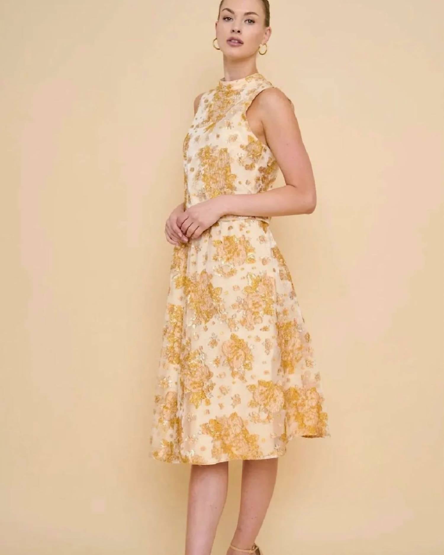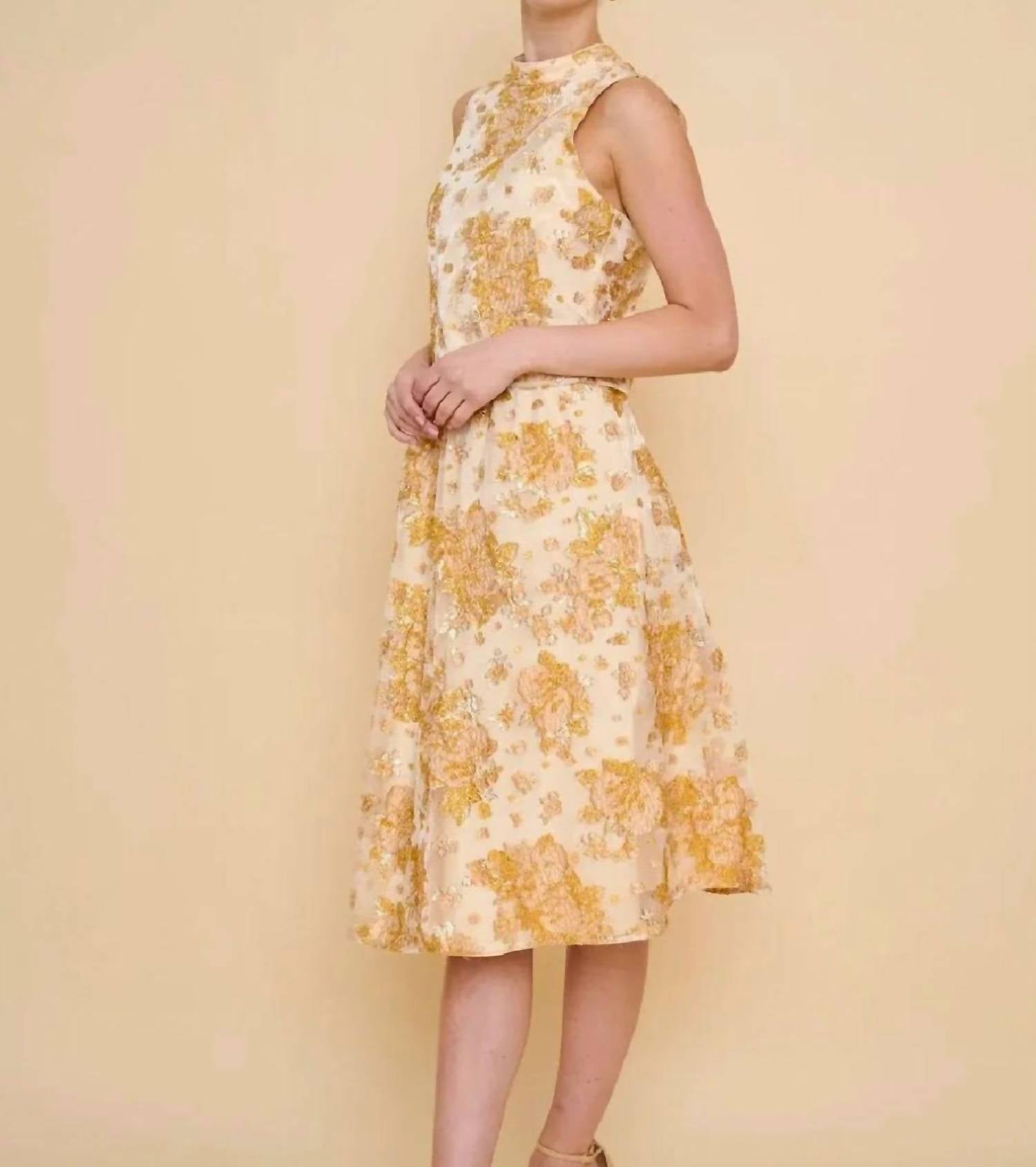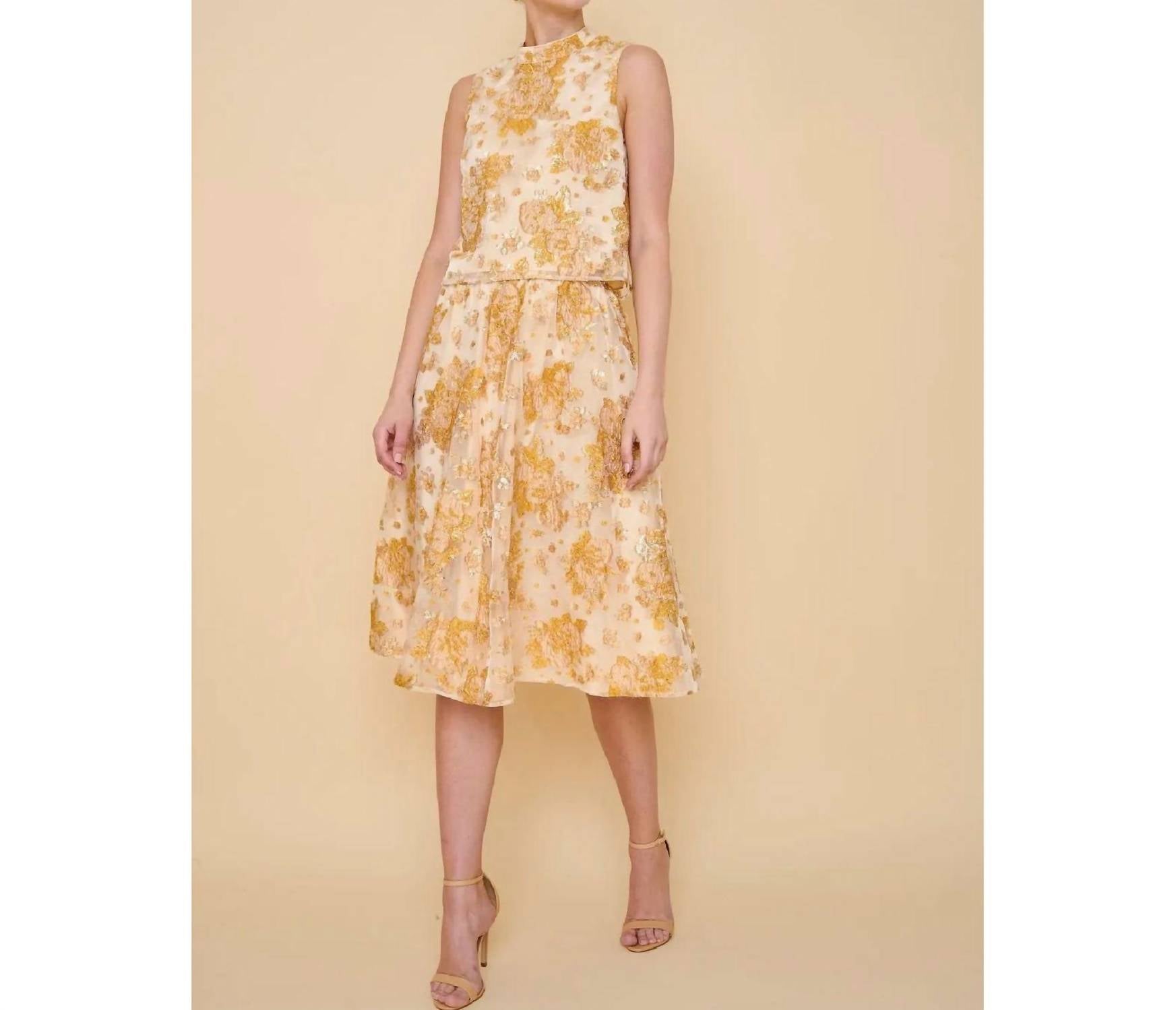 Pair this crop top with your favorite high-waisted jeans or maxi skirt. Elevate your wardrobe with the Tricia Floral Top by Flora Bea, a standout piece crafted for elegance. This sleeveless crop top features a champagne organza overlay with exquisite gold floral details, and a sophisticated mockneck design. Made from 92% polyester and 8% spandex, it's perfect for making a statement at a holiday party. Care: Dry clean only.