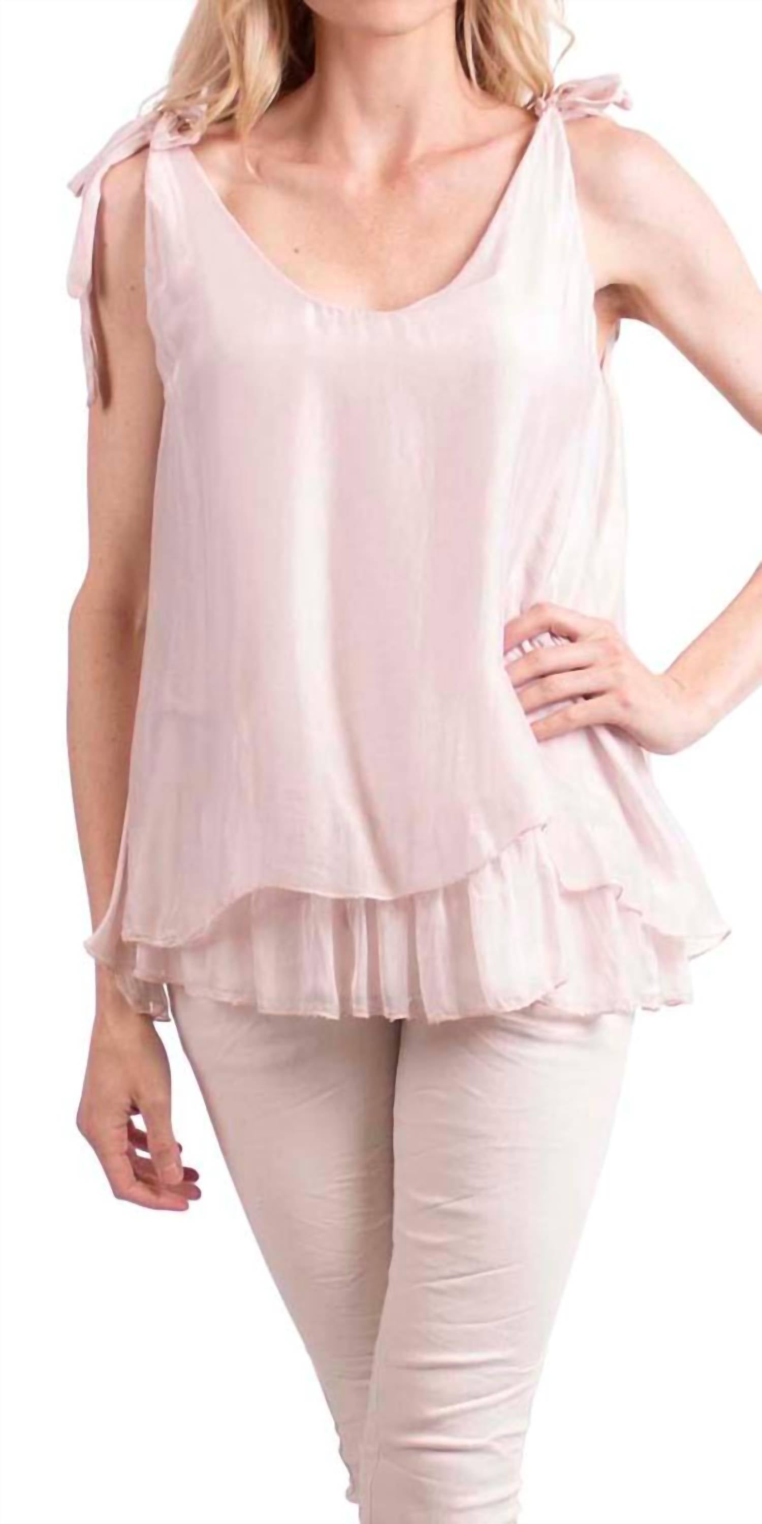 Fit, fabric and functionality. This tank top checks all the boxes. Enhance your summer wardrobe with the Semilia Scoop Neck Tank Top by GIGI MODA, crafted for minimalist elegance. This sleeveless tank features a double u-neck and a charming ruffled hem, tied gracefully at the shoulder. Made in Italy, its luxurious exterior is 100% silk, while the interior comprises 95% viscose and 5% elastane for comfort. Closure: Pull-on style. Care: Dry clean only. Model is 5'8". Available in a chic pink hue, this piece fits most and is ideal for travel or festive occasions like the 4th of July.