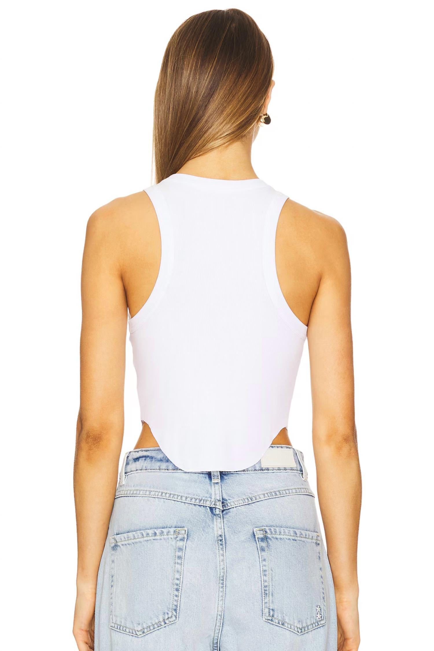 Fit, fabric and functionality. This tank top checks all the boxes. Unveiling the Sleeveless Rib Racer Tank Top by Good American, designed with a minimalist edge in pristine white. This women's tank top features a cropped length with an asymmetrical hem and a scoop neckline, perfect for summer adventures or travel occasions. Crafted from a lightweight textured jersey composed of 93% Modal and 7% Elastane, it promises a comfortable fit and a chic, relaxed look. Care instructions: Hand wash and line dry to maintain its polished appearance. Model is wearing a size Extra Small (5'10" height, 32" bust, 24" waist, 35.5" hips).