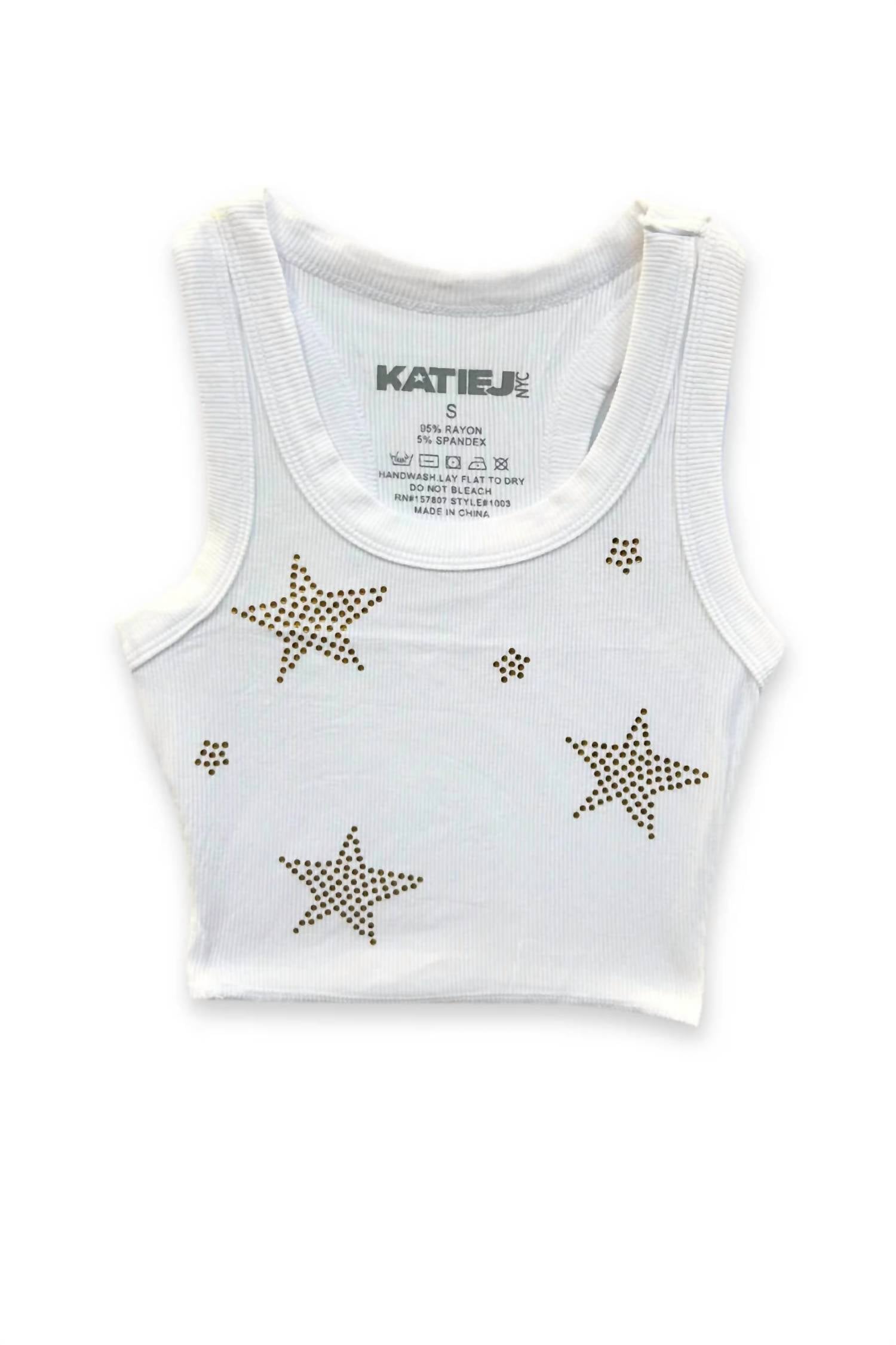 The perfect crop top for those warmer weather days. The Cropped Livi Tank by Katie J NYC is the perfect addition to your warm-weather wardrobe, boasting a sleeveless racer back design for a modern 90s fashion appeal. Crafted from super soft modal cotton, this top is ribbed for a flattering fit and adorned with a playful white and gold stars print. Material: Rayon. Closure: Pull on. Care: Hand wash and lay flat to dry.