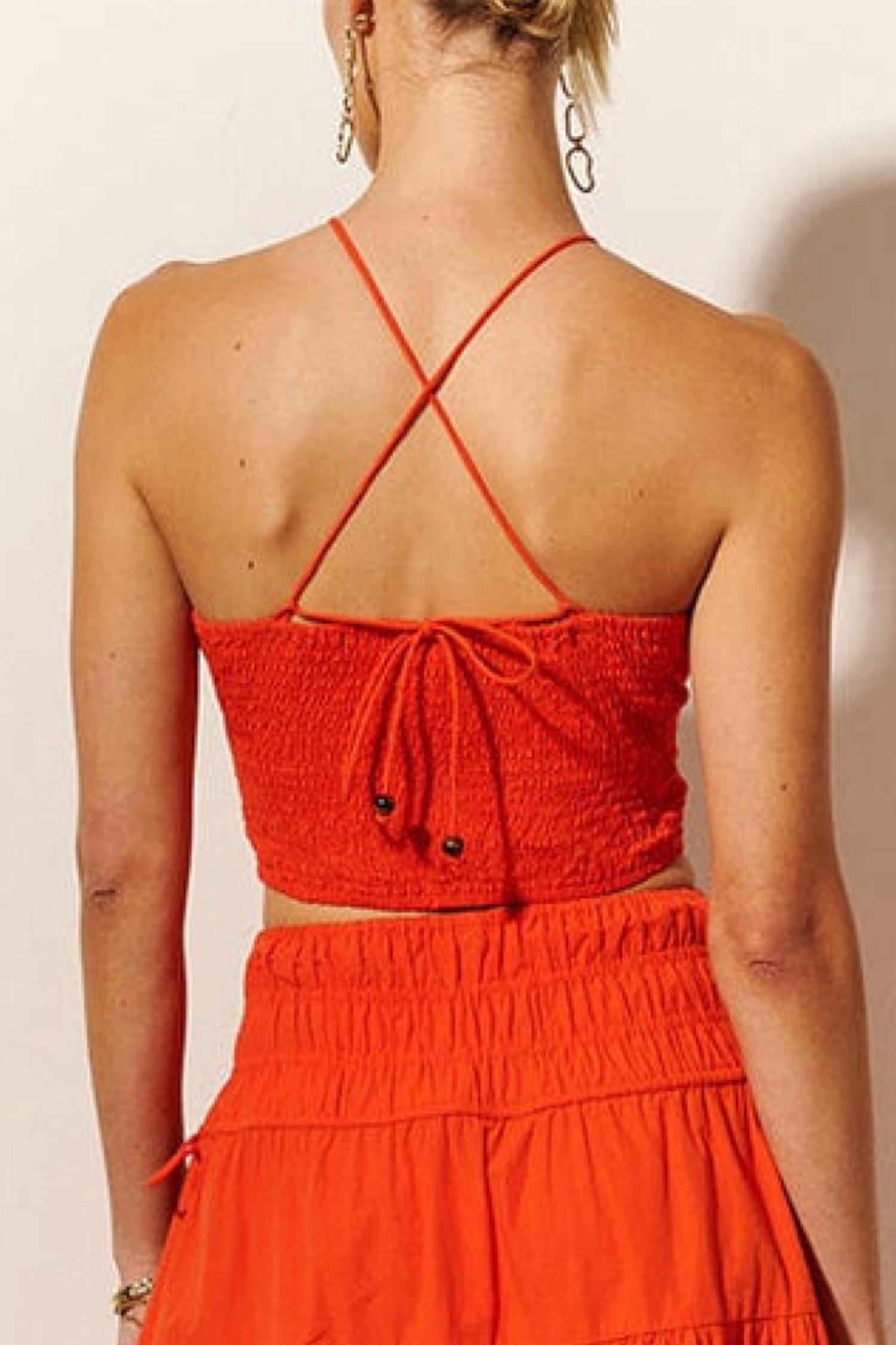 Show a little skin in this cute and casual crop top. Discover the Women's Nora Cut Out Top from KIVARI, a chic choice for your summer vacation wardrobe. Featuring spaghetti straps and a fashionable halter neckline, this crop top is crafted from 100% cotton poplin in an alluring Scarlett shade. It boasts an adjustable drawcord keyhole cutout with elegant tiger eye stone bead details, and ensures a true-to-size fit. Closure is via a stylish tie, and for care, cool hand wash separately with a mild detergent, then line dry.