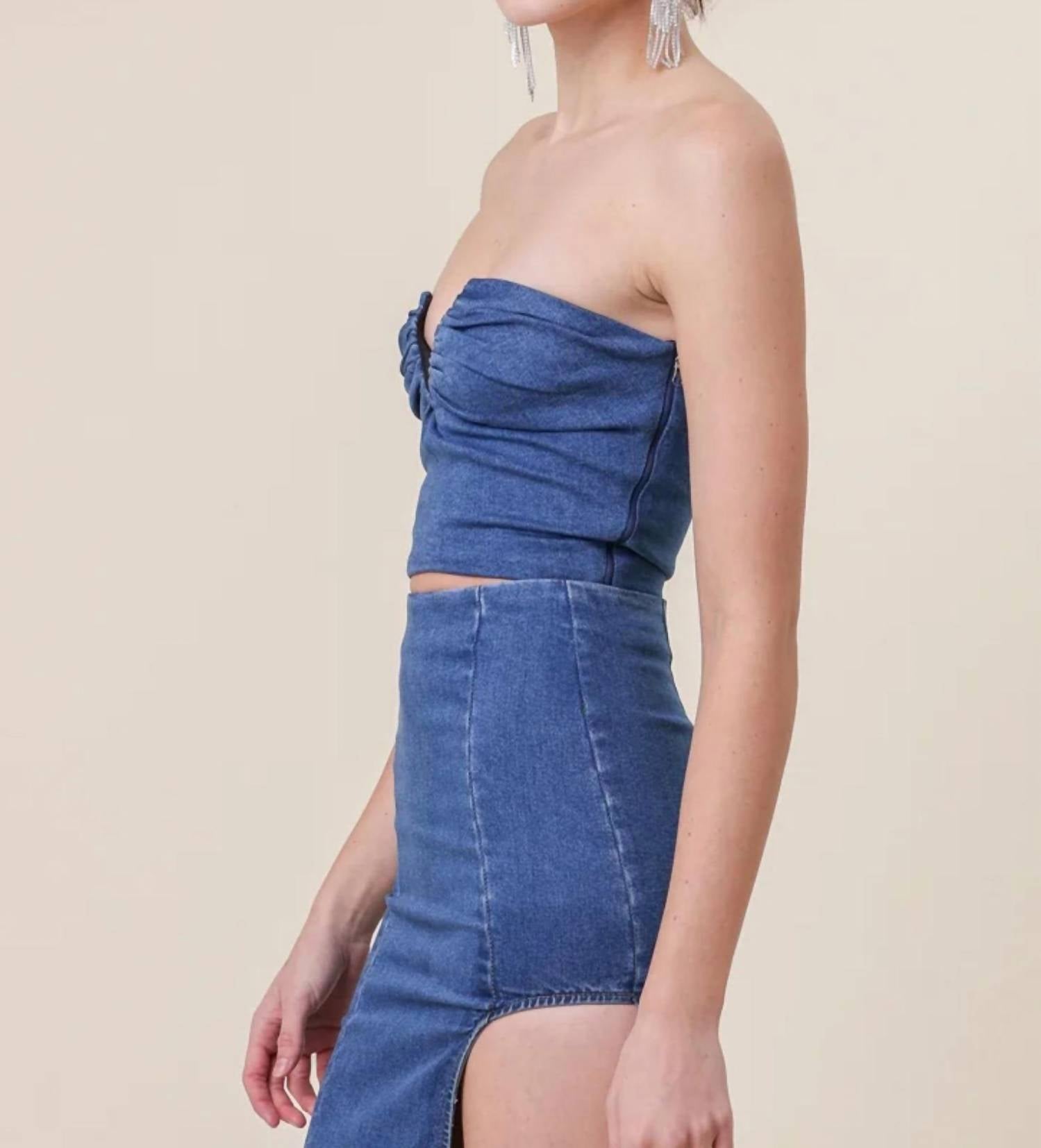 The perfect crop top for those warmer weather days. The Joey Denim Top by Line and Dot brings a touch of sophistication to your wardrobe with its ruched front detail and timeless denim fabric. This strapless, off-the-shoulder top offers a flattering fit and a relaxed vibe in a chic blue hue. Closure: Pull-on. Care: Dry clean only. Perfect for cocktail parties or a stylish night out, this versatile crop top pairs beautifully with your favorite bottoms.