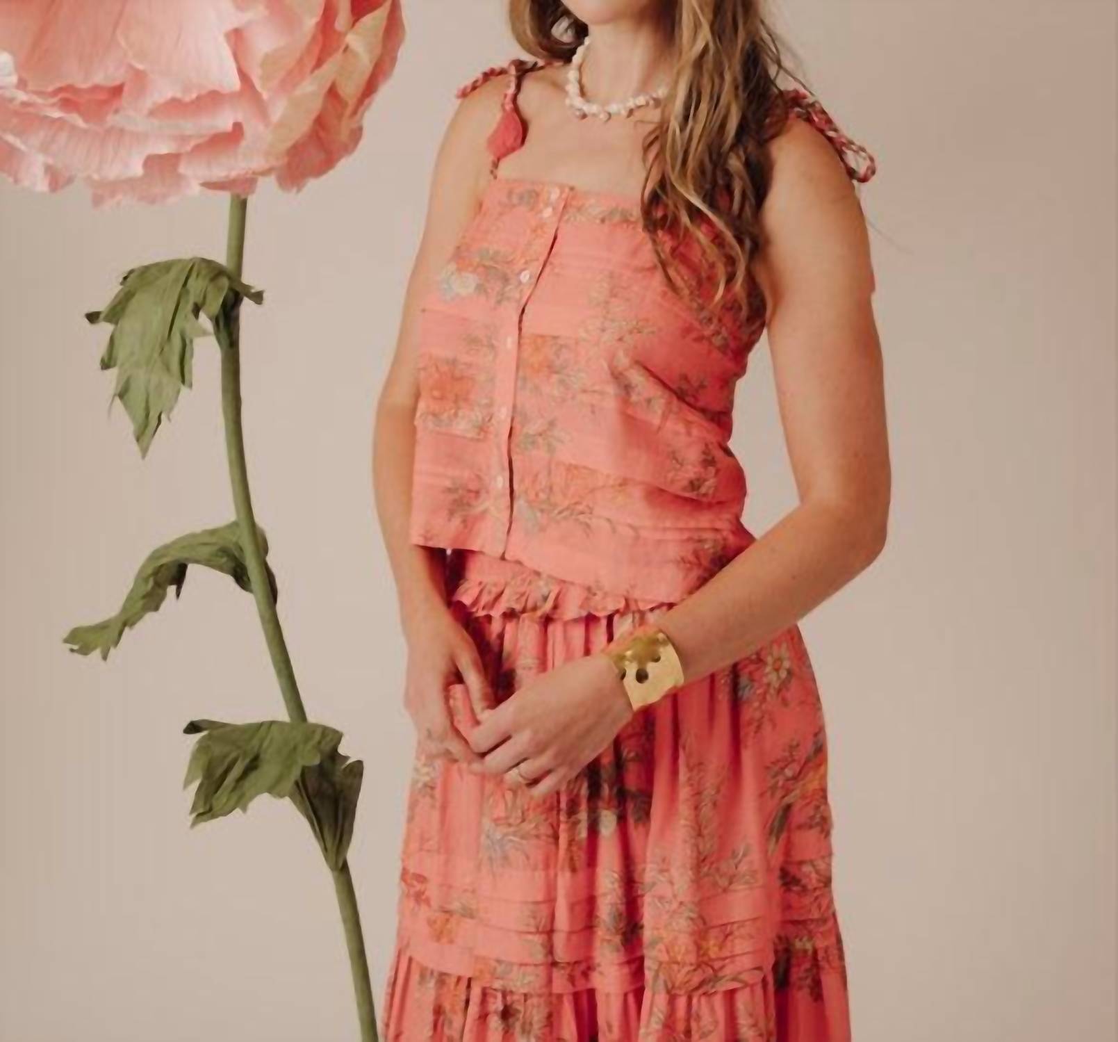 Pair this crop top with your favorite high-waisted jeans or maxi skirt. Introducing the Amaia Sleeveless Top by Love the Label, featuring a vintage-inspired Mayfair floral print for a touch of romance. Crafted from 100% cotton, this top offers lightweight comfort and breathability for warm summer days. With its playful braided straps and relaxed silhouette, it's perfect for vacation dressing or laid-back days in the sun. Elevate your style by pairing it with the matching Nolan Skirt or wear it solo for effortless charm in your wardrobe.