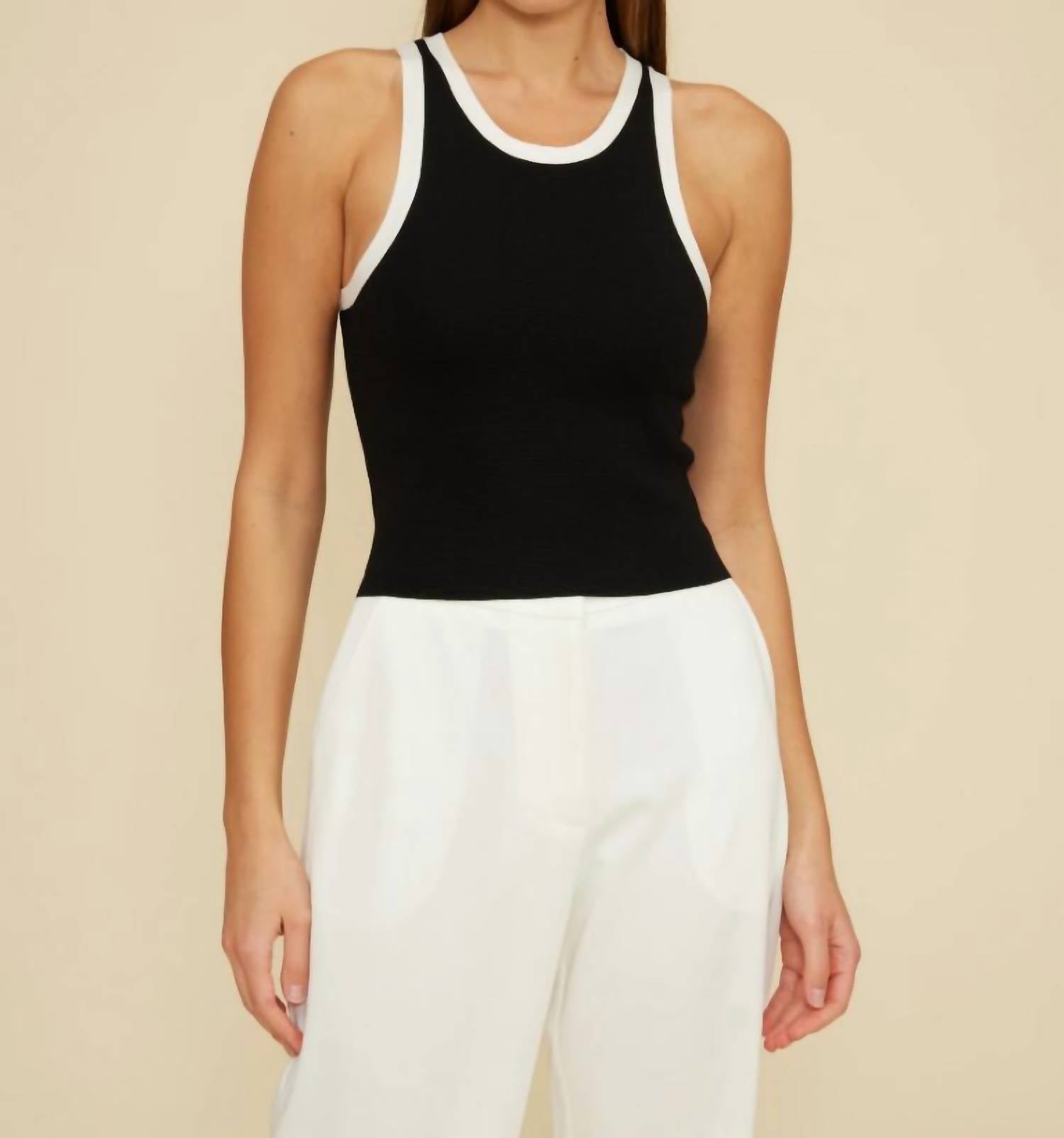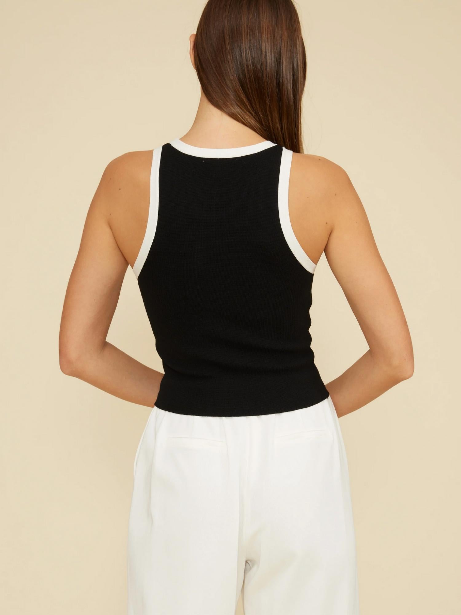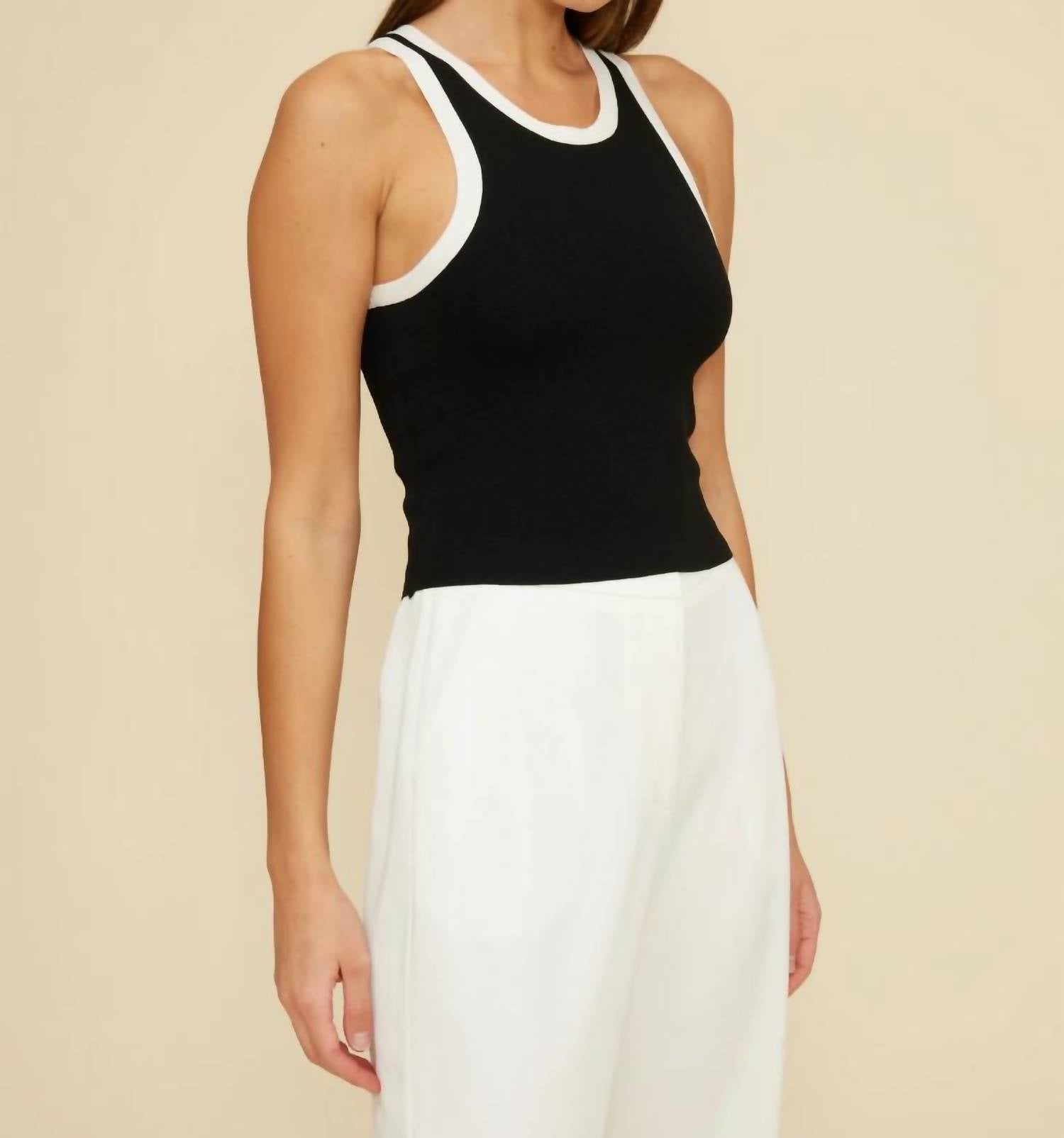The perfect tank top for those warmer weather seasons. Discover the Brandi Cutaway Tank Top by LUCY PARIS, a chic minimalist piece perfect for summer celebrations. This sleeveless tank in black and white features a scoopneck design and contrast colors for a bold statement. Crafted from 64% Rayon and 36% Nylon, this pull-on top ensures a sleek fit. Care for this garment by hand washing and line drying to maintain its quality.