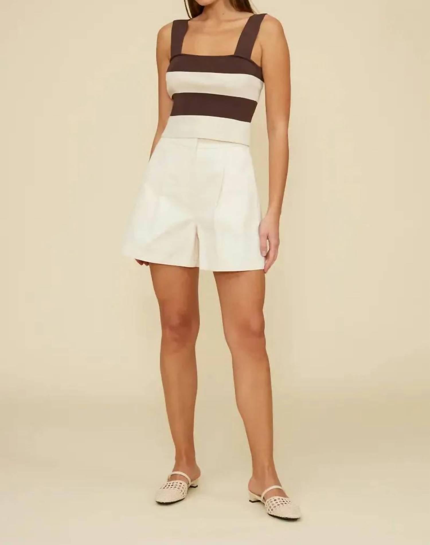 The perfect crop top for those warmer weather days. Introducing the Lula Striped Knit Top by LUCY PARIS, a chic addition to any fall wardrobe. This sleeveless crop top features a stylish brown and cream stripe pattern, perfect for concert outings or Thanksgiving gatherings. Made with a blend of 52% Nylon, 45% Rayon, and 36% Spandex, it offers both comfort and stretch. Closure: Pull on. Care: Hand wash, lay flat to dry.