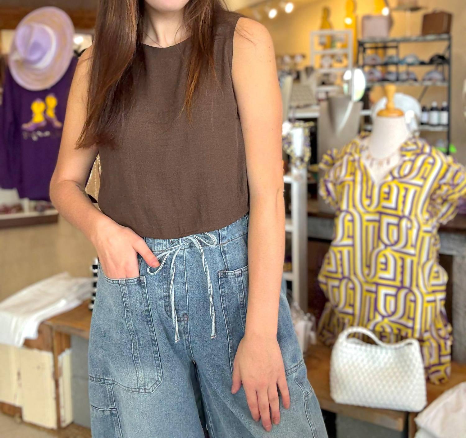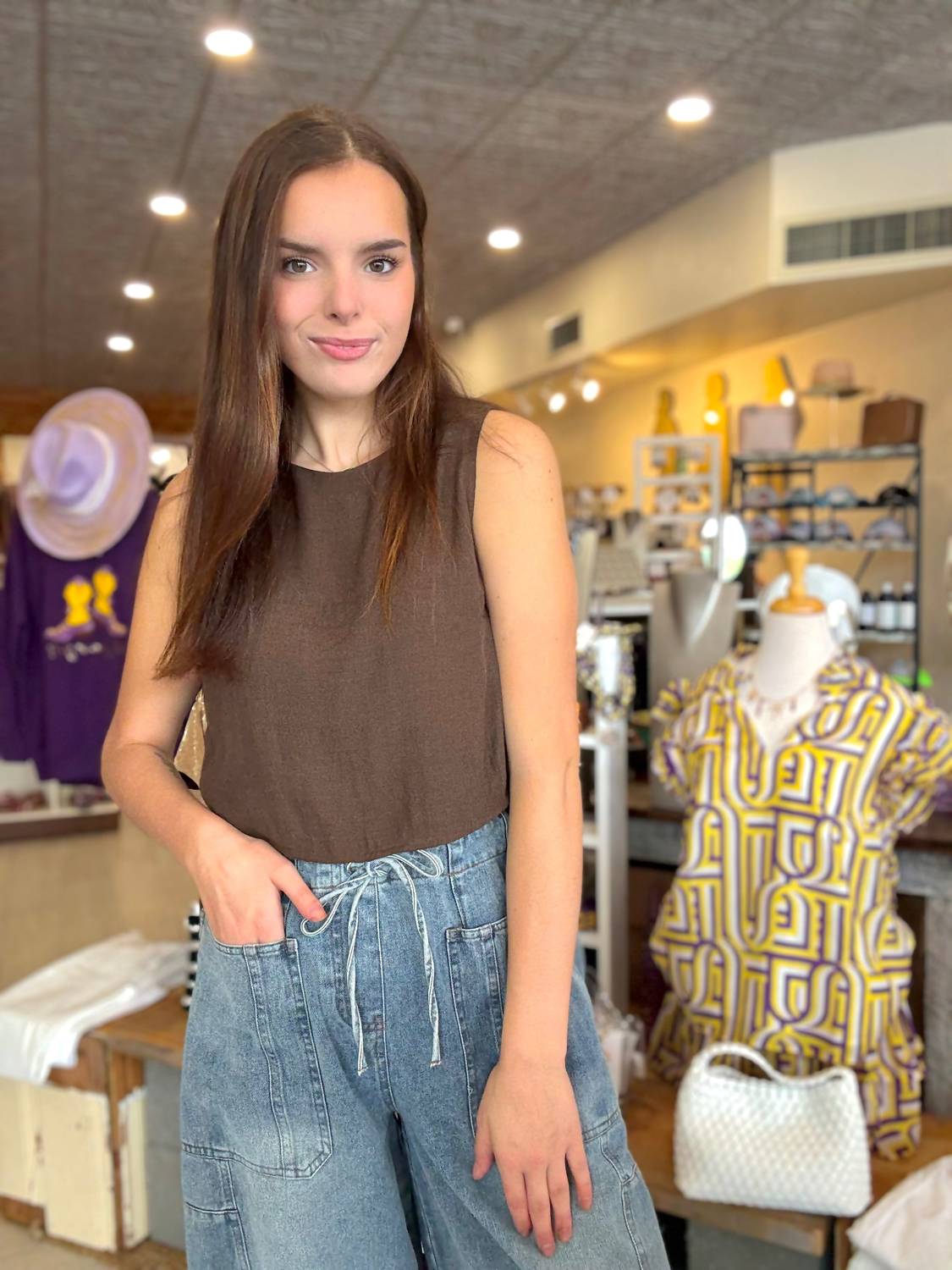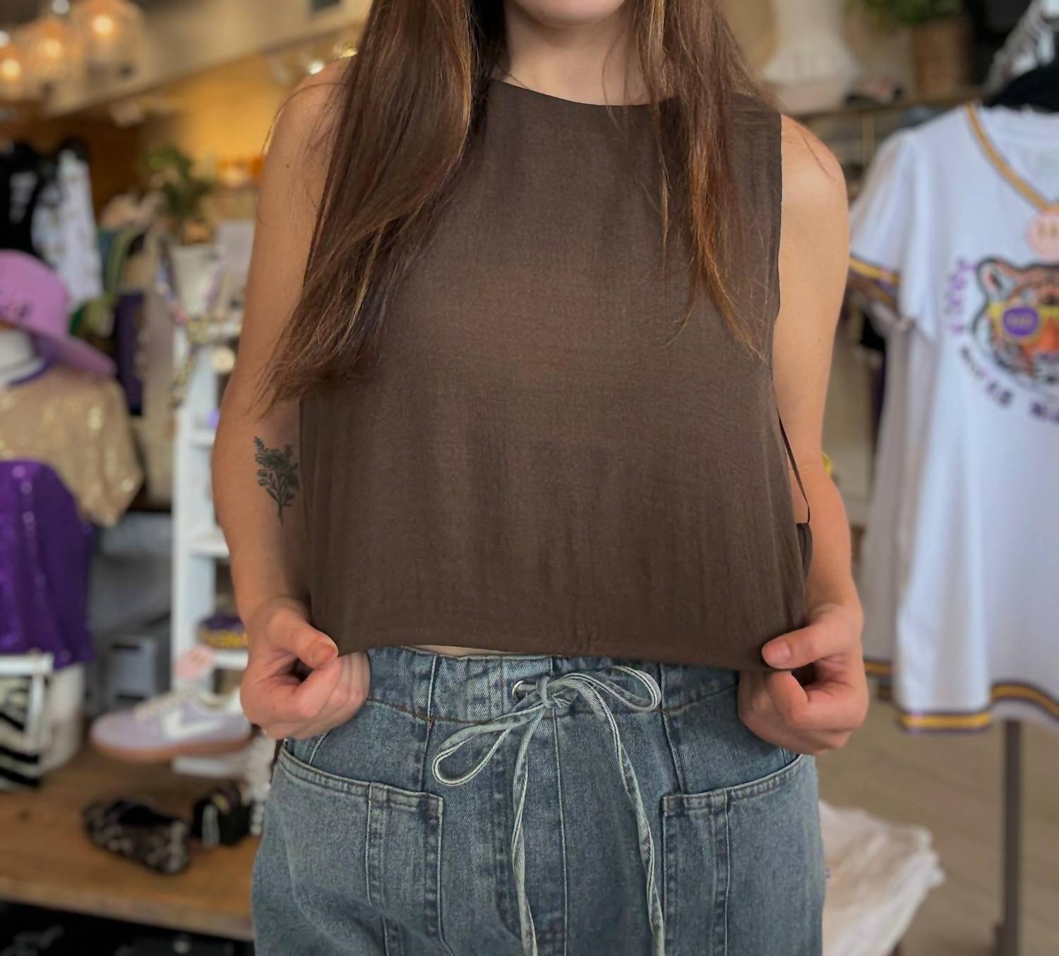 The perfect crop top for those warmer weather days. Introducing the Women's Marie Side Tie Crop Top by LUCY PARIS, a minimalist summer essential in a warm brown hue. This sleeveless crop top is crafted from lightweight cotton, offering breathable comfort and effortless style. It features adjustable side ties for a customizable fit and a flattering solid pattern, perfect for vacations or casual outings. Closure: Tie closure. Care: Machine wash.