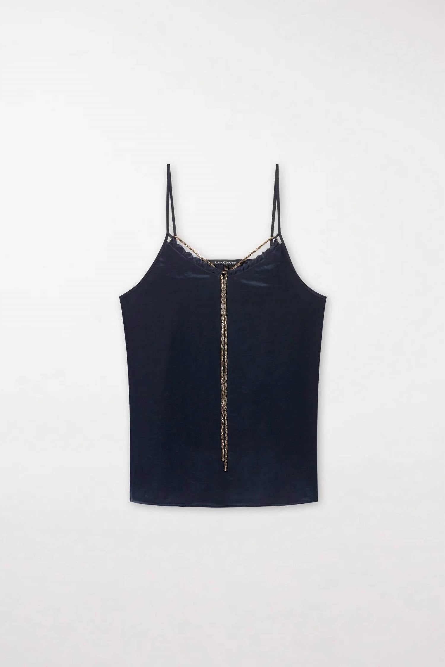 Fit, fabric and functionality. This tank top checks all the boxes. Elevate your holiday party look with the Rhinestone Cord Spaghetti Top by LUISA CERANO, a minimalist yet striking piece in Midnight Blue. Designed with delicate spaghetti straps and a flattering V-neckline, this top seamlessly blends elegance and simplicity. Crafted from solid 100% polyester, it offers a luxurious feel and effortless style. Featuring a pull-on closure, it embodies convenience and chic for a Thanksgiving celebration.