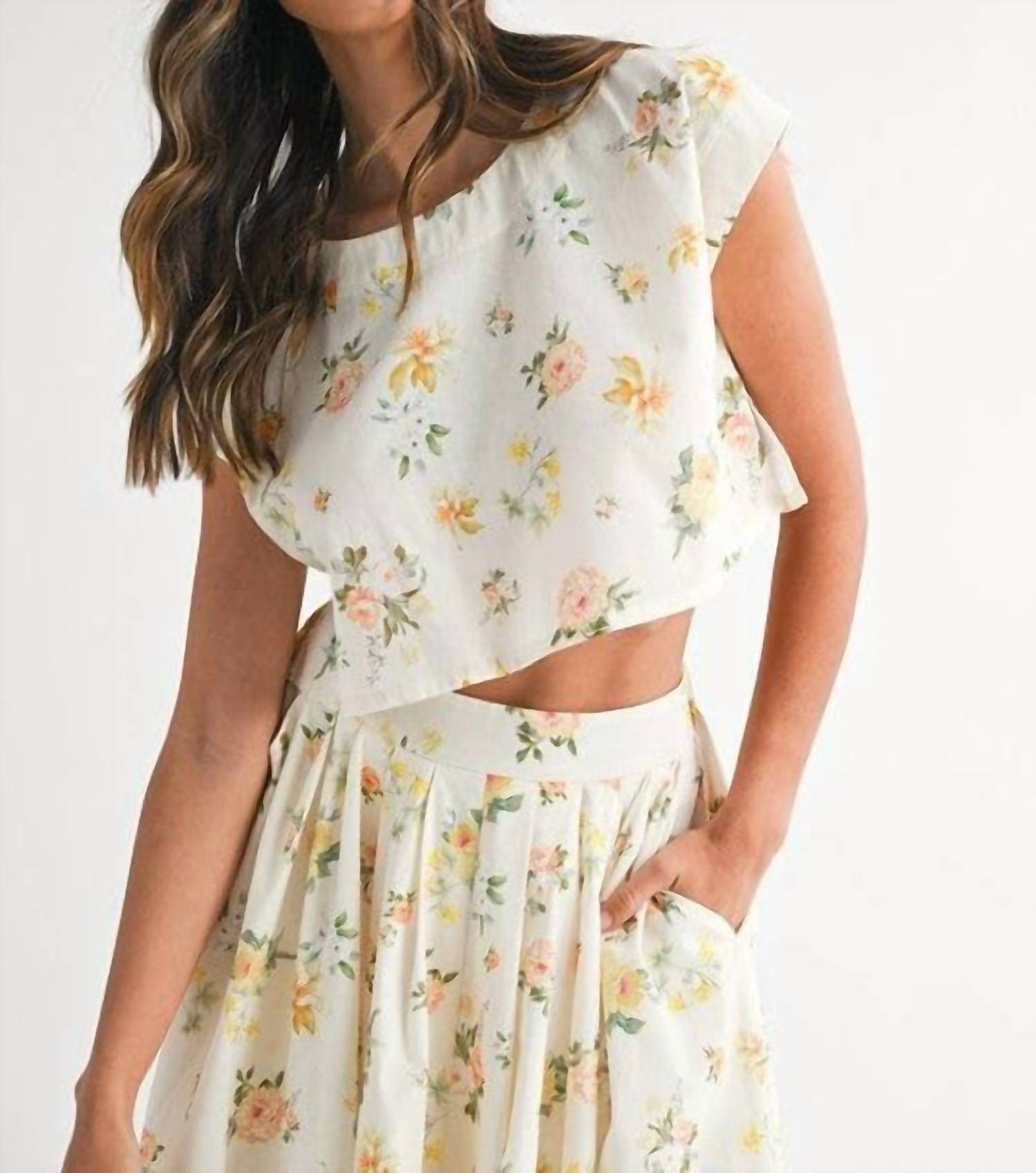 Pair this crop top with your favorite high-waisted jeans or maxi skirt. Elevate your wardrobe with the Vivienne Floral Top by MABLE, a romantic choice for spring in a charming white multi floral print. This crop top features short sleeves with a subtle volume and a soft, structured silhouette, adding a feminine touch to your look. Featuring a crewneck design, it's crafted from 100% Rayon and offers a convenient pull-on closure. Pair it seamlessly with the matching Vivienne Floral Skirt, or style it independently for versatile vacation-ready wear.