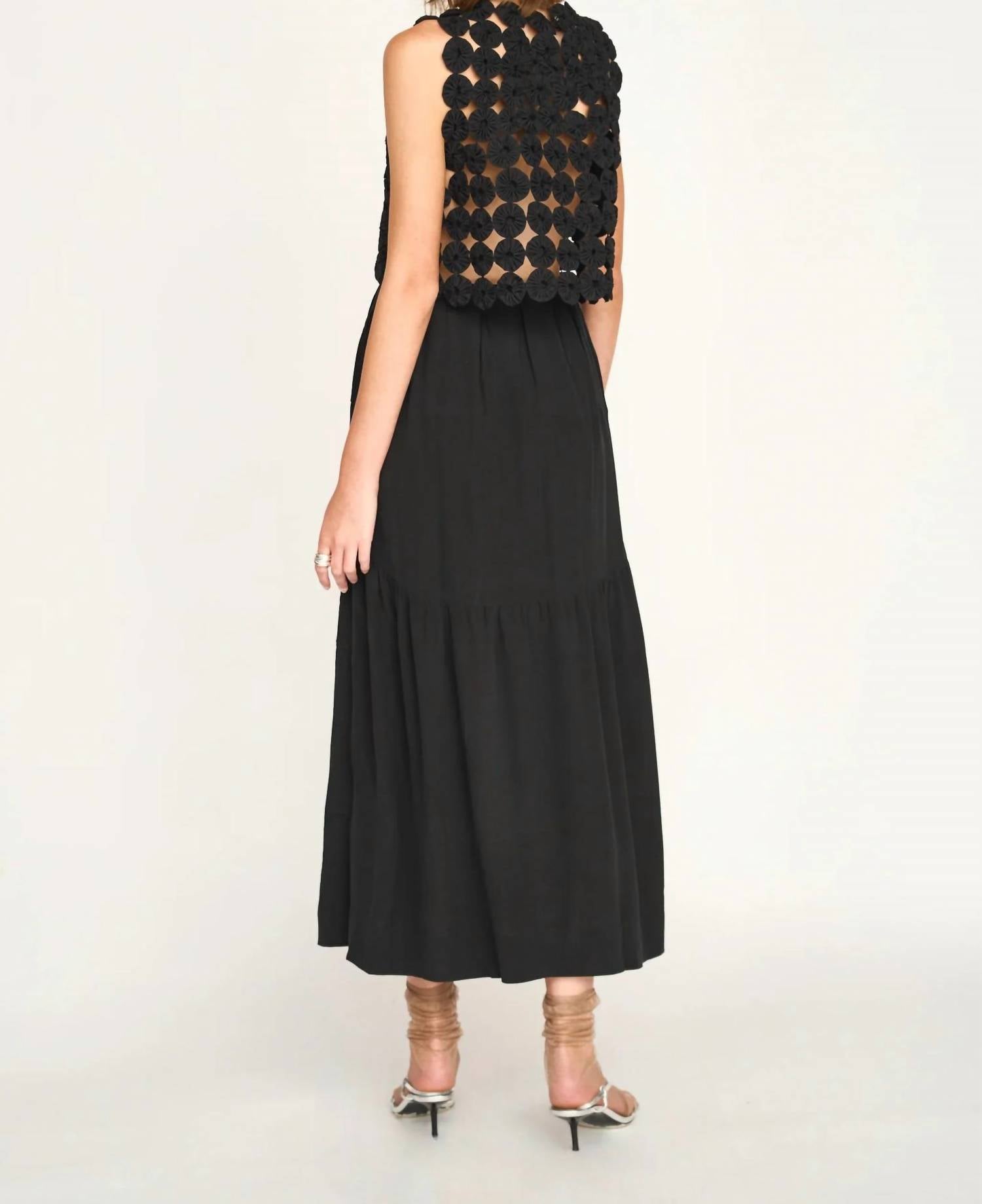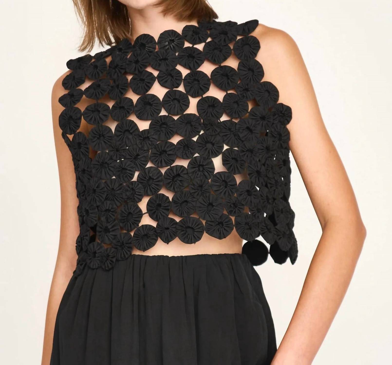 The perfect tank top for those warmer weather seasons. Introducing the Santanyi Yo Yo Top by Mirth, an exquisite piece that embodies Boho Chic style with its hand-stitched "yo yo" rosettes. This sleeveless tank top, in a classic black, offers a structured silhouette and a unique textured pattern as every yo yo is carefully placed to create one-of-a-kind designs. Made from sheer 100% cotton and crafted with care in India, this pull-on piece is perfect for vacation and summer occasions. The crewneck design amplifies its effortless charm, making it a must-have for your warm-weather wardrobe.