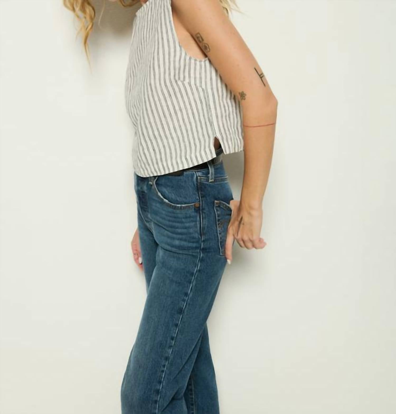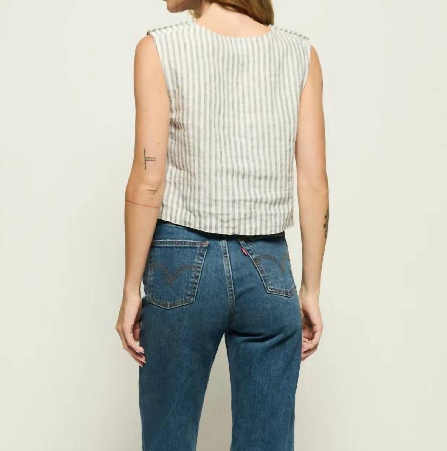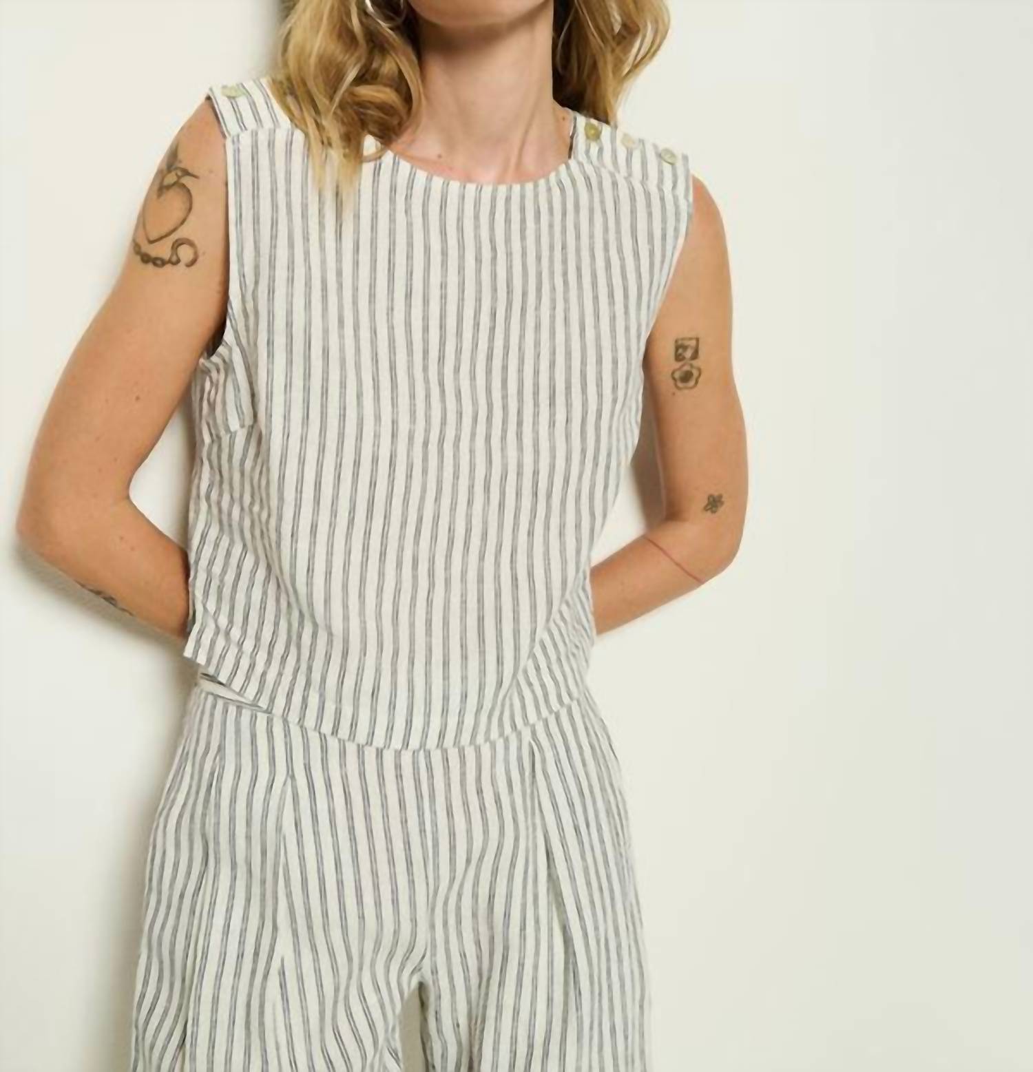 Fit, fabric and functionality. This tank top checks all the boxes. Elevate your wardrobe with the Cara Stripe Tank Top by Nation LTD, a perfect blend of style and comfort. This sleeveless tank features a boxy, cropped design with a polished crew scoop neckline and natural shell button details on the shoulders. Crafted from 100% linen, it offers a lightweight, breathable feel that softens over time. Made in Portugal, it's machine washable for effortless care; simply air dry or dry on a low setting to maintain its fit and texture. Model is wearing a size small (5'9" height, 32" bust, 24" waist, 35" hips).