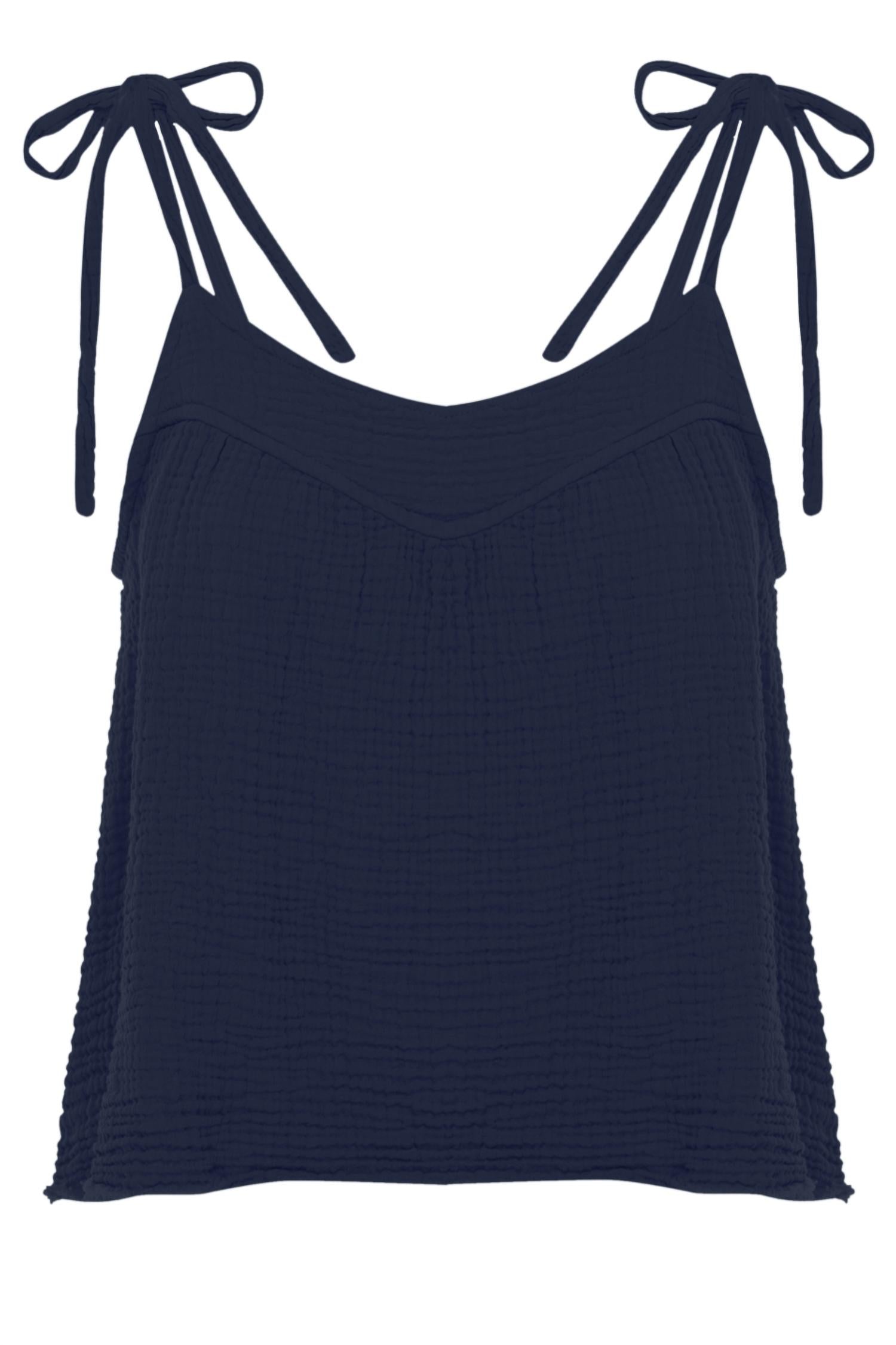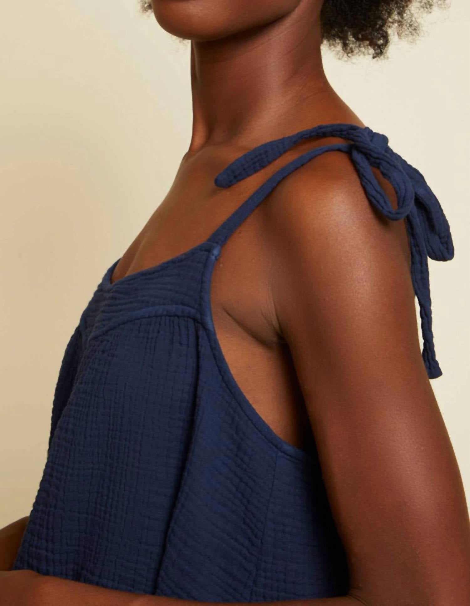 This classic tank top is perfect for layering and cute enough to wear on its own. Presenting the Women's Lottie Tank Top by Nation LTD, an easy-fit, A-line piece perfect for summer vacations. This swingy, sleeveless tank in a solid blue color features a chic tie strap closure and a V-neckline. Crafted entirely from double gauze cotton, this breathable top is made in LA. Care for it with a simple hand wash for optimal longevity.