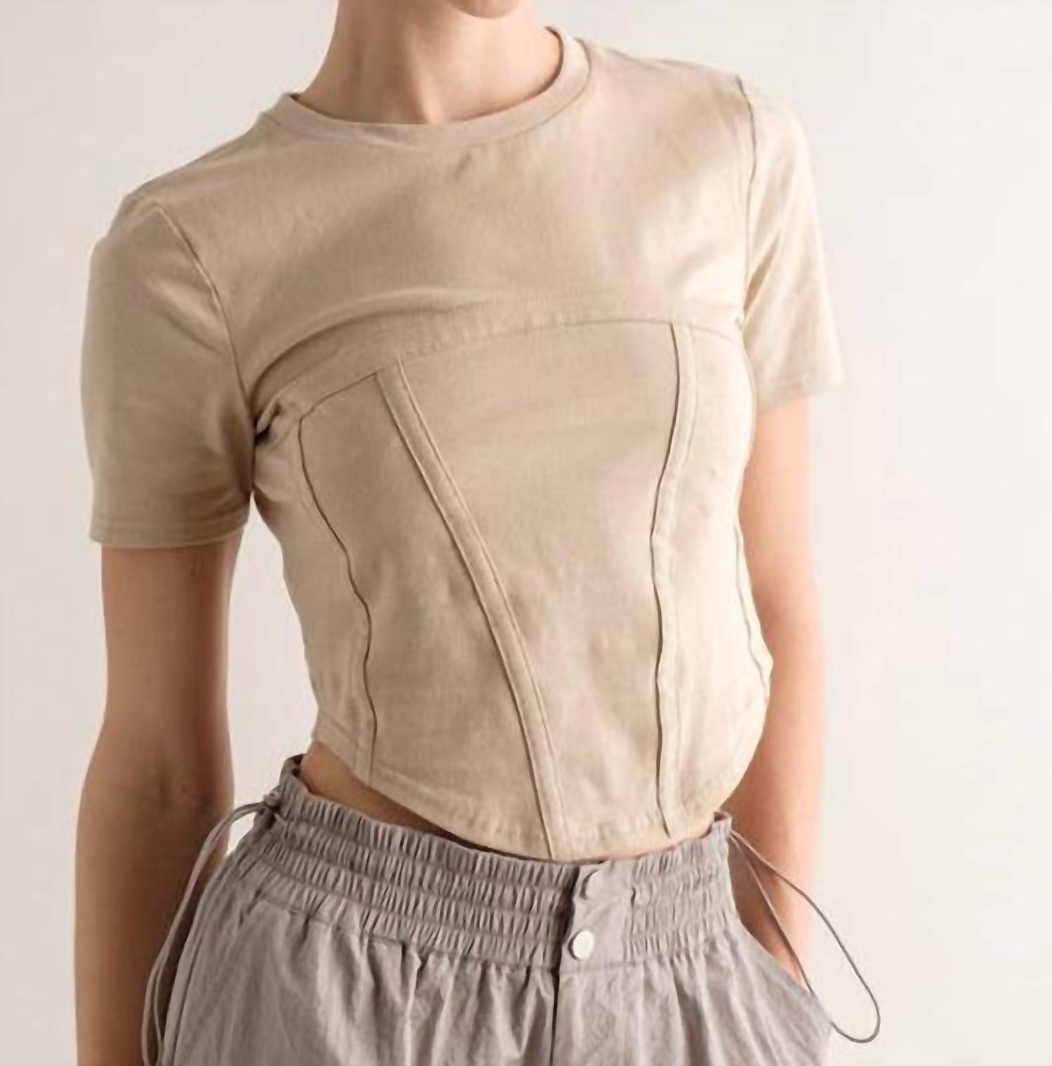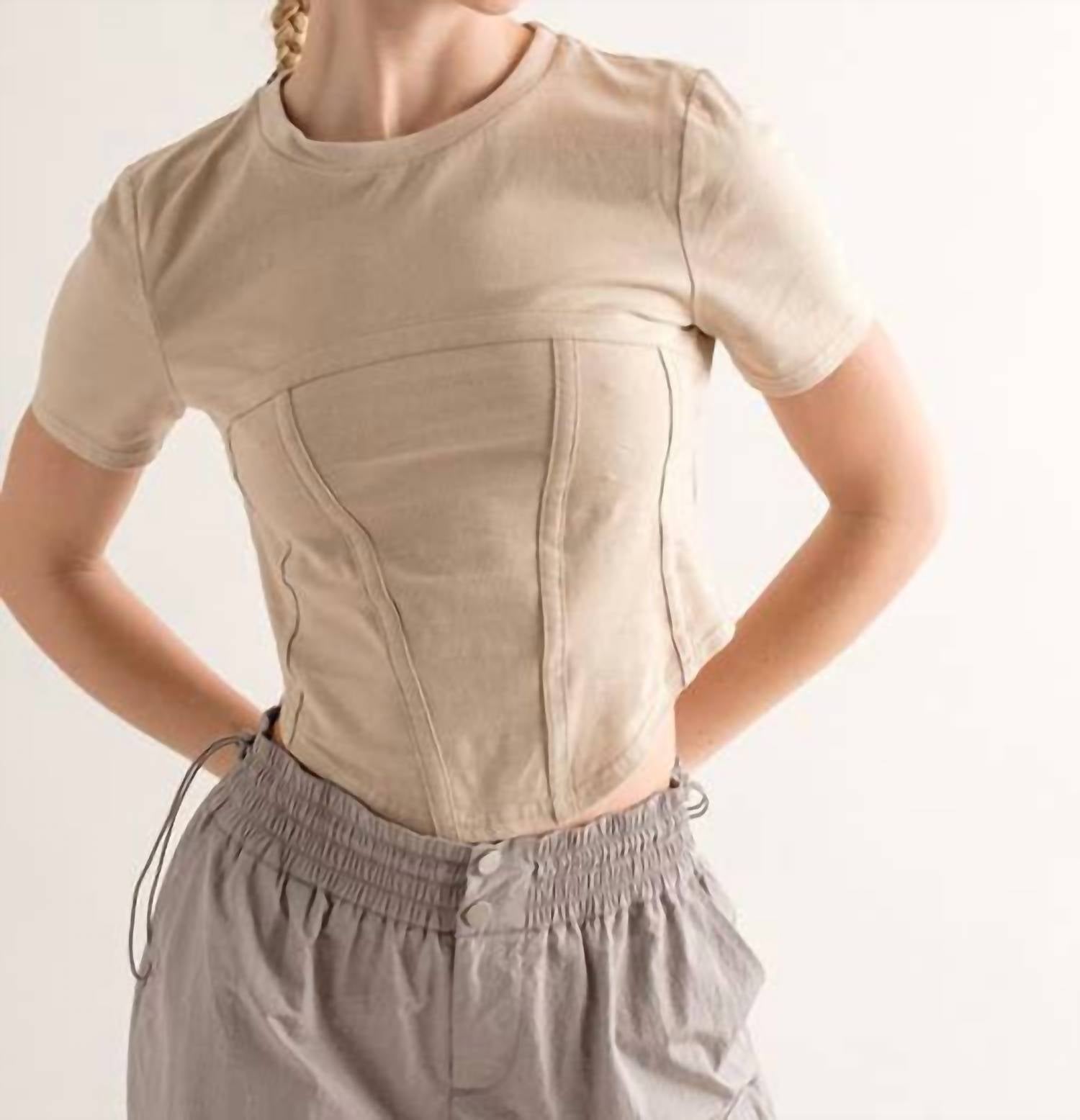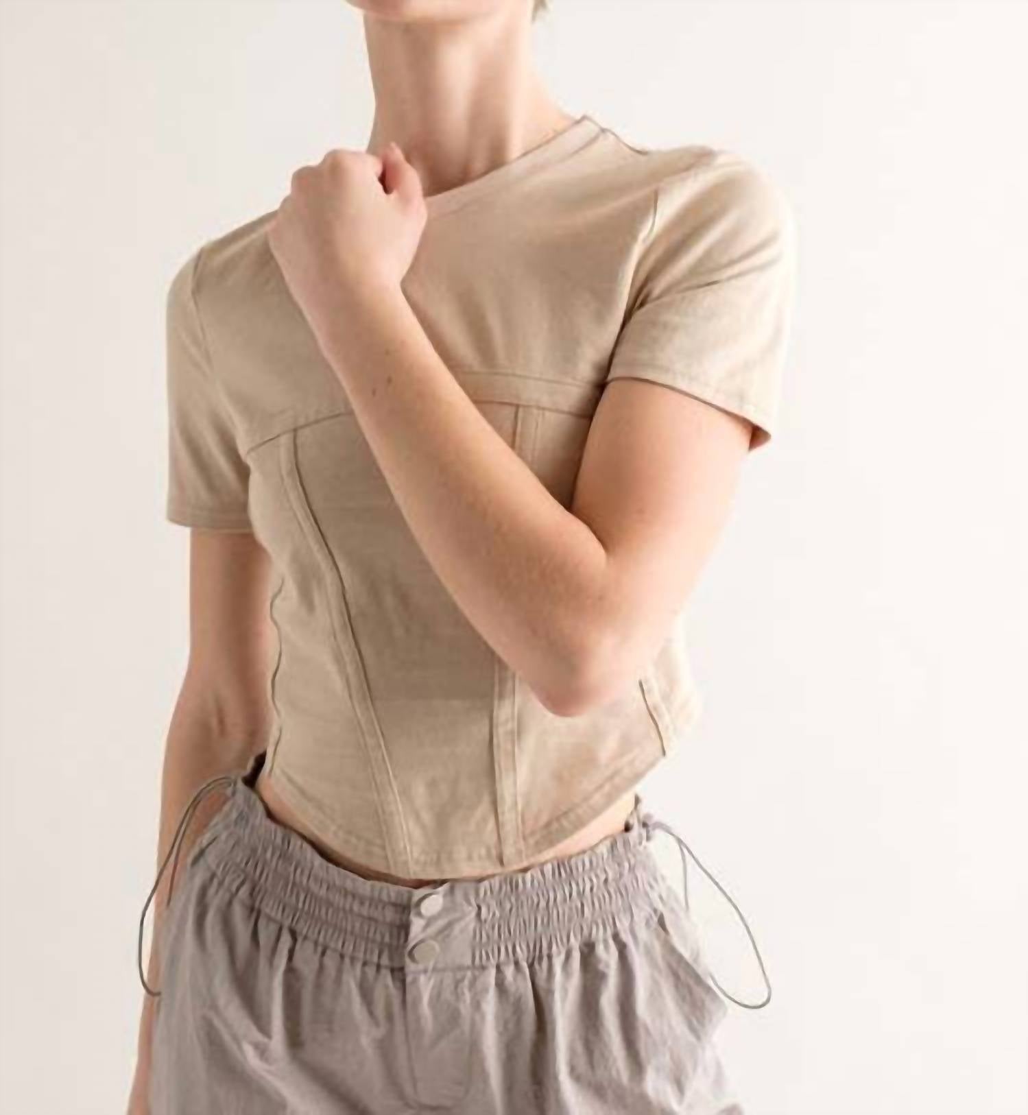 Show a little skin in this cute and casual crop top. The Kourtney Corset Top by PAPERMOON is your go-to piece for a chic dinner party look this spring. With its minimalist solid beige design, this women's crop top features short sleeves, a crewneck, and a flattering corset fit. At a top length of 19 1/4" and a chest measurement of 15 1/4", the pull-on style ensures a seamless silhouette. Model stands at 5'8" and is wearing a size S.